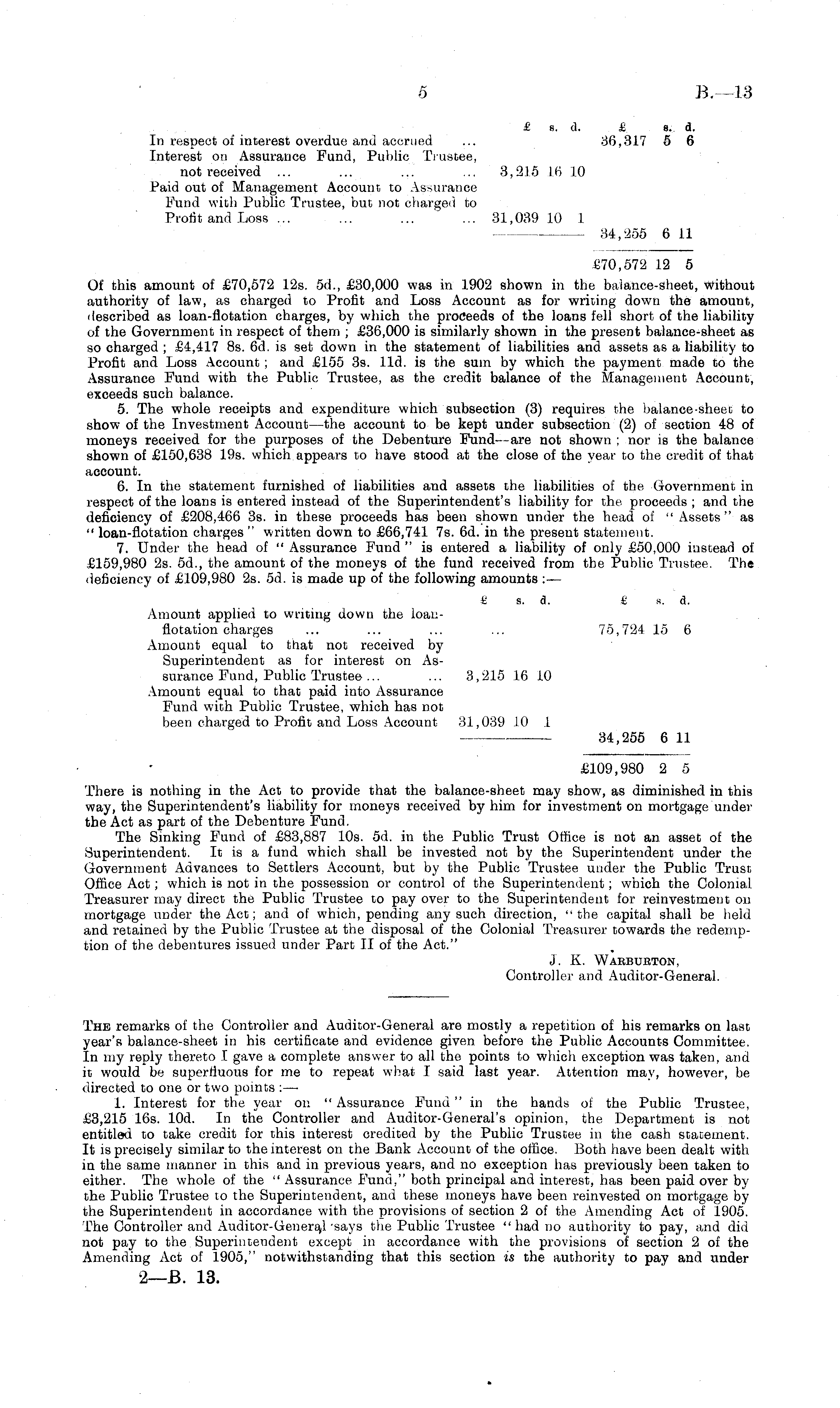 £ b. a. £ s. d. In respect of interest overdue and accrued ... 36,317 5 6 Interest on Assurance Fund, Public Trustee, not received ... ... ... ... 3,215 16 10 Paid out of Management Account to Assurance Fund with Public Trustee, but not charged to Profit and Loss ... ... ... ... 31,039 10 1 34,255 6 II £70,572 12 5 Of this amount of £70,572 12s. 5d., £30,000 was in 1902 shown in the balance-sheet, without authority of law, as charged to Profit and Loss Account as for writing down the amount, described as loan-flotation charges, by which the proceeds of the loans fell short of the liability of the Government in respect of them ; £36,000 is similarly shown in the present balance-sheet as so charged ; £4,417 Bs. 6d. is set down in the statement of liabilities and assets as a liability to Profit and Loss Account ; and £155 3s. lid. is the sum by which the payment made to the Assurance Fund with the Public Trustee, as the credit balance of the Management Account, exceeds such balance. 5. The whole receipts and expenditure which subsection (3) requires the balance-sheet to show of the Investment Account—the account to be kept under subsection (2) of section 48 of moneys received for the purposes of the Debenture Fund—are not shown ; nor is the balance shown of £150,638 19s. which appears to have stood at the close of the year to the credit of that account. 6. In the statement furnished of liabilities and assets the liabilities of the Government in respect of the loans is entered instead of the Superintendent's liability for the, proceeds ; and the deficiency of £208,466 3s. in these proceeds has been shown under the head of "Assets" as " loan-flotation charges " written down to £66,741 7s. 6d. in the present statement. 7. Under the head of " Assurance Fund " is entered a liability of only £50,000 instead of £159,980 2s. 5d., the amount of the moneys of the fund received from the Public Trustee. The deficiency of £109,980 2s. sd. is made up of the following amounts : — £ s. d. £ s. d. Amount applied to writing down the loanflotation charges ... ... ... ... 75,724 15 6 Amount equal to that not received by Superintendent as for interest on Assurance Fund, Public Trustee ... ... 3,215 1.6 10 Amount equal to that paid into Assurance Fund with Public Trustee, which has not been charged to Profit and Loss Account 31,039 1.0 1 — 34,255 6 11 £109,980 2 5 There is nothing in the Act to provide that the balance-sheet may show, as diminished in this way, the Superintendent's liability for moneys received by him for investment on mortgage under the Act as part of the Debenture Fund. The Sinking Fund of £83,887 10s. sd. in the Public Trust Office is not an asset of the Superintendent. It is a fund which shall be invested not by the Superintendent under the Government Advances to Settlers Account, but by the Public Trustee under the Public Trust Office Act; which is not in the possession or control of the Superintendent; which the Colonial Treasurer may direct the Public Trustee to pay over to the Superintendent for reinvestment on mortgage under the Act; and of which, pending any such direction, "the capital shall be held and retained by the Public Trustee at the disposal of the Colonial Treasurer towards the redemption of the debentures issued under Part II of the Act." J. K. Warburton, Controller and Auditor-General.