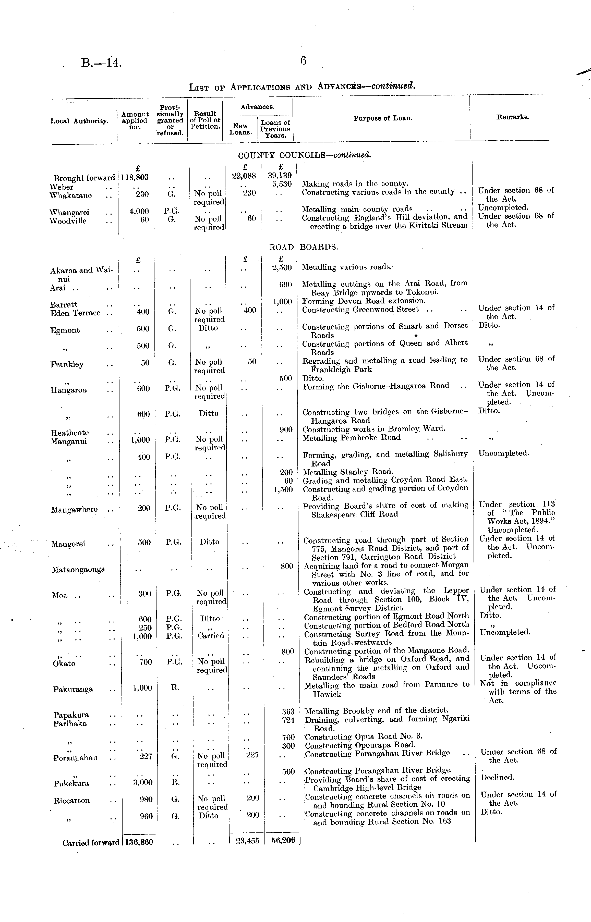 Local Authority. Provi- Advances. Ainount sionally Result applied granted of Poll or Tmanq of for. . or Petition. New refused. Loans. Yearg Purpose of Loan. Remarks Brought forward Weber Whakatane .. £ i 118,803 ! '230 j G. 4,000 ! P.G. 60 G. COUNTY COUNCILS—continued. I £ I £ 22,088 39,139 5,530 Making roads in the county. I No poll i 230 .. Constructing various roads in the county .. Under section 68 of I required: the Act Metalling main county roads .. . • Uncompleted. No poll I 60 .. Constructing England's Hill deviation, and Under section 68 of I required' erecting a bridge over the Kiritaki Stream the Act. Whangarei Woodville Akaroa and Wainui Arai .. ROAD BOARDS. £ £ £ I 2,500 Metalling various roads. Barrett Eden Terrace .. Egmont Frankley 400 G. 500 G. 500 G. 50 G. 600 P.G. 600 P.G. 1,000 P.G. G. G. G. G. 690 Metalling cuttings on the Arai Road, from Reay Bridge upwards to Tokonui. 1,000 Forming Devon Road extension. No poll 400 .. Constructing Greenwood Street .. .. Under section 14 of required * he Act - Ditto .. .. Constructing portions of Smart and Dorset Ditto. Roads • Constructing portions of Queen and Albert „ Roads No poll 50 . . Regrading and metalling a road leading to Under section 68 of required! Frankleigh Park the Act. 500 Ditto. No poll .. Forming tlxe Gisborne-Hangaroa Road .. Under section 14 of required the Act. Uncompleted. I Ditto . . • • Constructing two bridges on the Gisborne- Ditto. Hangaroa Road 900 Constructing works in Bromley Ward. No poll .. .. Metalling Pembroke Road .. .. ,, nA /-j 111 i", 1 / I No poll required Ditto No poll required^ Hangaroa P/G. No poll required P.G. Ditto Reathcote Manganui P.G. No poll required j) .. 400 P.G. 200 P.G. 500 P.G. I 300 P.G. 600 P.G. 250 P.G. 1,000 P.G. 700 P.G. 1,000 B. P.G. required Forming, grading, and metalling Salisbury Uncompleted. Road 200 Metalling Stanley Road. 60 Grading and metalling Croydon Road East. 1,500 Constructing and grading portion of Croydon Road. No poll .. Providing Board's share of cost of making Under section 113 required Shakespeare Cliff Road of " The Public Works Act, 1894. Uncompleted. i Ditto .. •. Constructing road through part of Section Under section 14 of 775, Mangorei Road District, and part of the Act. UneomSection 791, Carrington Road District pleted. 800 Acquiring land for a road to connect Morgan Street with No. 3 line of road, and for various other works. No poll .. • • Constructing and deviating the Lepper Under section 14 of required Road through Section 100, Block IV, the Act. UncomEgmont Survey District pleted. Ditto .. .. Constructing portion of Egmont Road North Ditto. Constructing portion of Bedford Road North „ Carried .. • • Constructing Surrey Road from the Moun- Uncompleted. tain Road westwards 800 Constructing portion of the Mangaone Road. No' poll .. • ■ Rebuilding a bridge on Oxford Road, and Under section 14 of required continuing the metalling on Oxford and the Act. UncomSaunders' Roads pleted. Metalling the main road from Panmure to Not in compliance Howick w ' tn terms of the Act. ») • • Mangawhero .. P.G. No poll required Mangorei P.G. Ditto Mataongaonga 800 ' ' Moa .. P.G. No poll required P.G. P.G. P.G. Ditto Carried j» • * Okato P.G. No poll required •• 800 I Pakuranga B. Papakura Parihaka ■227 G. ] 363 Metalling Brookby end of the district. ' [ .. 724 Draining, culverting, and forming Ngariki Road. 700 Constructing Opua Road No. 3. ". .. 300 Constructing Opourapa Road. ' No poll 227 Constructing Porangahau River Bridge .. Under section BB ot ™,£,wl the Act. I 363 724 ■" 700 300 Porangahau '227 G. j No poll required •227 Pnkekura 3,000 R. 980 G. 960 G. 3,000 R. required 500 Constructing Porangahau River Bridge. , Providing Board's share of cost of erecting j Declined. Cambridge High-level Bridge | i No poll 200 .. Constructing concrete channels oil roads on | Under section 14 ol i required and bounding Rural Section No. 10 the Act. I Ditto ' 200 '< . . Constructing concrete channels on roads on Ditto. and bounding Rural Section No. 163 500 Riocarton 980 9C0 G. G. j No poll I required I Ditto 200 - i " '' 200 Carried forward 136,860 23,455 i I 56,206