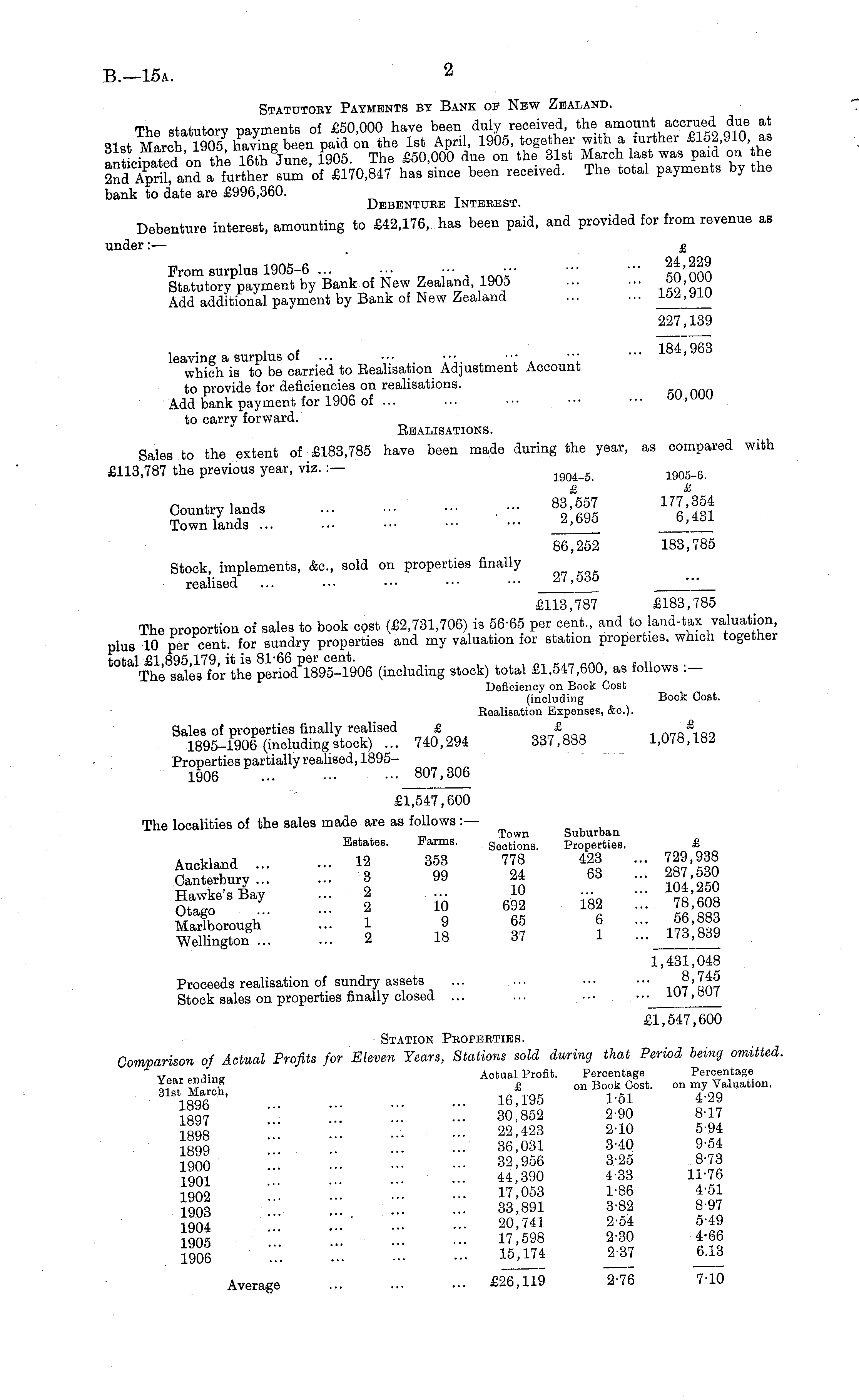 Statutoby Payments by Bank of New Zealand. The statutory payments of £50,000 have been duly received, the amount accrued due at Slst M_2h 1905 having been paid on the Ist April, 1905, together with a further £152,910 as ti!Z™ tVw, 16th June 1905 The £50,000 due on the 31st March last was paid on the 2ndTprit and a further £170,847 has 'since been received. The total payments by the bank to date are £996,360. Debentuke Intekest. Debenture interest, amounting to £42,176, has been paid, and provided for from revenue as under: — _ £ From surplus 1905-6 ... ... ••• ■■■ ••• sn'nnn Statutory payment by Bank of New Zealand 1905 -,^'qin Add additional payment by Bank of New Zealand ... ••• 10Z - alu 227,139 , • i „ f . ... 184,963 leaving a surplus of ... ... _ ••• ■•• ••• which is to be carried to Realisation Adjustment Account to provide for deficiencies on realisations. Add bank payment for 1906 of 5U ' UUU to carry forward. Realisations. Sales to the extent of £183,785 have been made during the year, as compared with £113,787 the previous year, viz.:— igo4 _ g 19056 Country lands . - 83?657 177?8M Town lands 2 - 695 6 4 31 86,252 183,785 Stock, implements, k, sold on properties finally realised 27,5d5 - £113,787 £183,785 The proportion of sales to book cost (£2,731,706) is 56-65 per cent., and to land-tax valuation, plus 10 per cent, for sundry properties and my valuation for station properties, which together pcSd P rB9s- n i9o6 (mcluding stock) total £1,547,600, as follows :- Deficiency on Book Cost (including Book Cost. Realisation Expenses, &c). Sales of properties finally realised £ £ £ 1895-1906 (includingstock) ... 740,294 337,888 1,078,182 Properties partially realised, 1895--1906 ... 807,306 £1,547,600 The localities of the sales made are as follows :— „ „ Town Suburban Estates. Farms. Sections. Properties. £ ££&- ::: " 3 S 7 S *S ::: S?:SS ! a « » ... %X Malborough- ... 1 9 65 6 ... 66,883 Wellington 2 18 37 1 ... 173,839 1,431,048 Proceeds realisation of sundry assets ... ... im'ftn? Stock sales on properties finally closed ... ... • ll>'.»u< £1,547,600 Station Pbopeeties. Comparison of Actual Profits for Eleven Years, Stations sold during that Period being omitted. v Q „,.»-n,Un<* Actual Profit. Percentage Percentage J. c "3 £ on Book Cost. on my Valuation. IRQfT •••' 16 . 195 1-51 4 2 9 ISO 7 ... 30,852 2-90 8-17 iqqq '" . ... 22,423 2-10 5-94 Ihqo '" 36,031 3-40 9-54 Iqoo 32,956 3-25 8-73 iqoi 44,390 4-33 11-76 jqOQ " 17,053 1-86 4-51 Toaq " 33,891 3-82 897 !qO4 "" ' 20,741 2-54 5-49 Tqos 17,598 2-30 4*66 __ ;:: ... 15,174 2-37 Average £2~671i~9 2-76 7-10