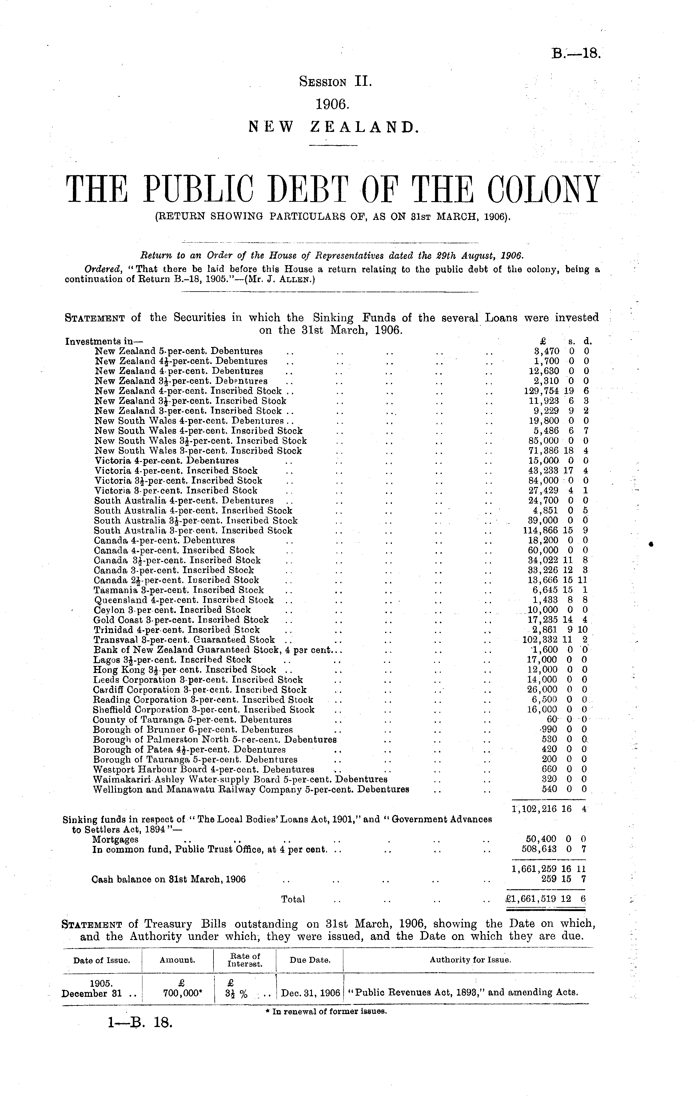 Statement of the Securities in which the Sinking Punds of the several Loans were invested on the 31st March, 1906. Investments in— £ s. d. New Zealand 5-per-cent. Debentures .. .. .. .. .. 3,470 0 0 New Zealand 4J-per-cent. Debentures .. ... .. .. .. 1,700 0 0 New Zealand 4 per-cent. Debentures .. .. .. .. .. 12,630 0 0 New Zealand 3J-per-cent. Debpntures .. .. .. .. .. 2,310 0 0 New Zealand 4-per-cent. Inscribed Stock .. .. .. .. .. 129,754 19 6 New Zealand 3J-per-cent. Inscribed Stock .. .. .. .. 11,923 6 3 New Zealand 3-per-cent. Inscribed Stock .. .. ... .. .. 9,229 9 2 New South Wales 4-per-cent. Debentures.. .. .. .. 19,800 0 0 New South Wales 4-per-cent. Inscribed Stock .. .. .. .. 5,486 6 7 New South Wales 3 J-per-cent. Inscribed Stock .. .. .. .. 85,000 0 0 New South Wales 3-per-cent. Inscribed Stock .. .. .. .. 71,386 18 4 Victoria 4-per-cent. Debentures .. .':. .. .. .. 15,000 0 0 Victoria 4-per-cent. Inscribed Stock .. .. .. .. .. 43,233 17 4 Victoria 3J-per-cent. Inscribed Stock .. .. .. .. .. 84,000 0 0 Victoria 3-per-cent. Inscribed Stock .. .. .. .. 27,429 4 1 South Australia 4-per-cent. Debentures .. .. .. .. .. 24,700 0 0 South Australia 4-per-cent. Inscribed Stock .. .. .. ' .. 4,851 0 5 South Australia 3J-per-cent. Inscribed Stock .. .. ... .... 39,000 0 0 South Australia 3-per-cent. Inscribed Stock .. .. .. .. 114,866 15 9 Canada 4-per-cent. Debentures .. .. .. .. .. 18,200 0 0 Canada 4-per-cent. Inscribed Stock .. .. .. .. 60,000 0 0 Canada 3J-per-cent. Inscribed Stock .. .. .. .. .. 34,022 11 8 Canada 3-per-cent. Inscribed Stock .. .. .. .. .. 33,226 12 3 Canada 2J-per-cent. Inscribed Stock .. .. .. .. .. 13,666 15 11 Tasmania 3-per-cent. Inscribed Stock .. .. .. .. .. 6,645 15 1 Queensland 4-per-cent. Inscribed Stock .. .. .. • .. .. 1,433 8 8 Ceylon 3-percent. Inscribed Stock .. .. .. .. .. 10,000 0 0 Gold Coast 3-per-cent. Inscribed Stock .. .. .. .. .. 17,235 14 4 Trinidad 4-per-cent. Inscribed Stock .. .. .. .. .. 2,861 9 10 Transvaal 3-per-cent. Guaranteed Stock .. .. .. .. .. 102,332 11 2 Bank of New Zealand Guaranteed Stock, 4 par cent... .. .. .. '1,600 0 0 Lagos 3J-per-cent. Inscribed Stock .. .. .. .. .. 17,000 0 0 Hong Kong 3i-per cent. Inscribed Stock .. .. .. .. .. 12,000 0 0 Leeds Corporation 3-per-cent. Inscribed Stock .. .. .. .. 14,000 0 0 Cardiff Corporation 3-per-oent. Inscribed Stock .. .. ..' .. 26,000 0 0 Reading Corporation 3-per-cent. Inscribed Stock .. .. .. .. 6,500 0 0 Sheffield Corporation 3-per-cent. Inscribed Stock .. .. .. .. 16,000 0 0 County of Tauranga 5-per-cent. Debentures .. .. .. .. 60 0 0 Borough, of Brunner 6-per-cent. Debentures .. .. .. .. -990 0 0 Borough of Palmerston North 5-rer-cent. Debentures .. .. .. 530 0 0 Borough of Patea 4J-per-cent. Debentures .. .. .. .. 420 0 0 Borough of Tauranga 5-per-cent. Debentures .. .. .. .. 200 0 0 Westport Harbour Board 4-per-cent. Debentures .. .. .. .. 660 0 0 Waimakariri-Ashley Water-supply Board 5-per-cent. Debentures .. .. 320 0 0 Wellington and Manawatu Railway Company 5-per-cent. Debentures .. .. 540 0 0 1,102,216 16 4 Sinking funds in respect of ■" The Looal Bodies' Loans Act, 1901," and " Government Advances to Settlers Act, 1894 "— Mortgages .. .. .. .. . .. .. 50,400 0 0 In common fund, Public Trust Office, at 4 per cent. .. .. .. .. 508,643 0 7 1,661,259 16 11 Cash balance on 31st March, 1906 .. .. .. .. .. 259 15 7 Total .. .. .. .. £1,661,519 12 6 Statement of Treasury Bills outstanding on 31st March, 1906, showing the Date on which, and the Authority under which, they were issued, and the Date on which they are due.