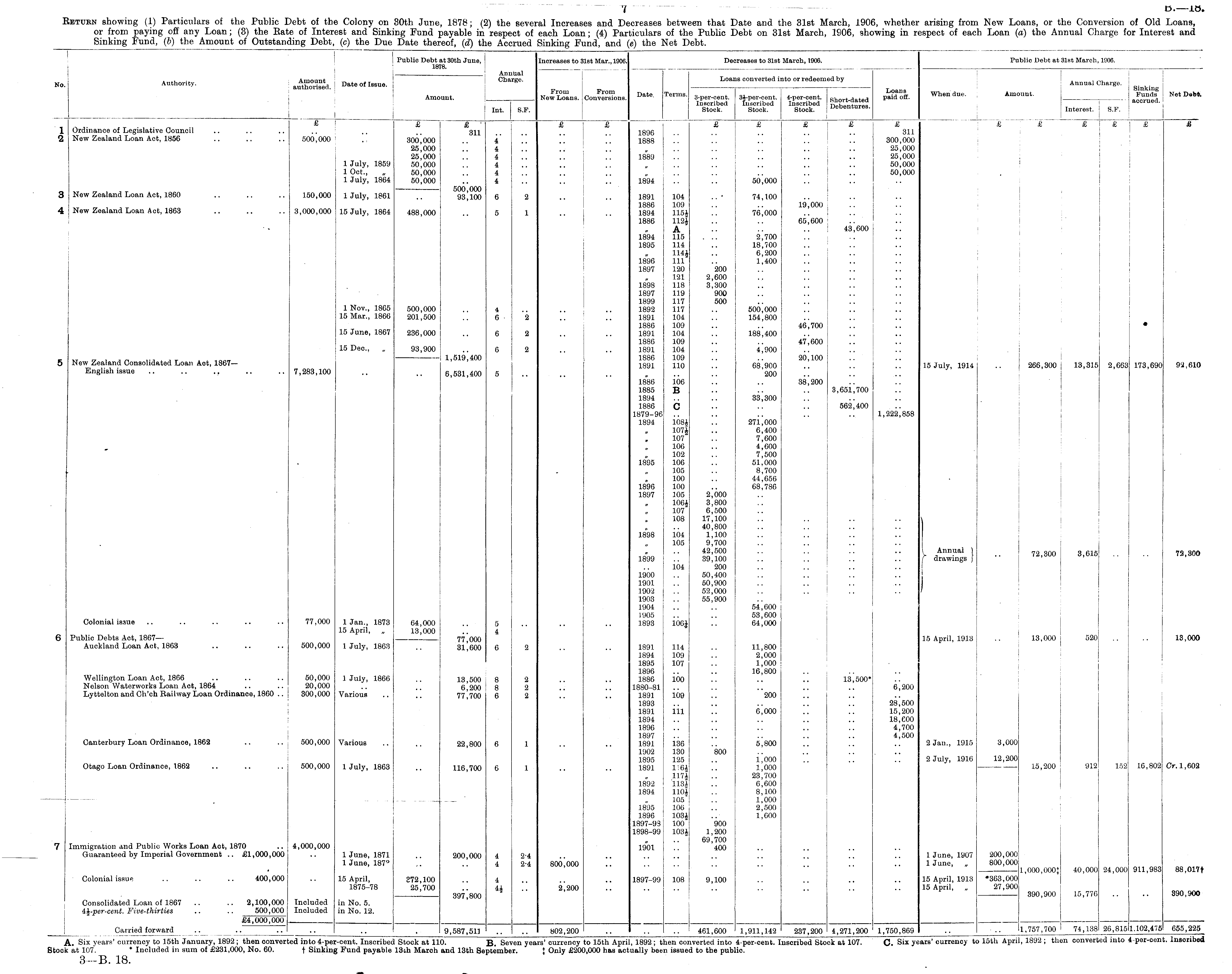 Public Debt at 30th June, 1878. Increases to 31st Mar., 1906. Decreases to 31st March, 1906. Public Debt at 31st March, 1906. No. Authority. Jg23&.\ Date of Issue. Amount. Annual Charge. From From New Loans. Conversions. Date. Terms. 3-per-cent. 3£-per-cent. Inscribed Inscribed Stock. Stock. Loans converted into or redeemed by 4 T -P 6 Short-dated In !t C o r ck ed Debentures. Loans paid off. When due. Amount. Annual Charge. Sinking Funds Net Debt. j accrued.I Interest, j S.F. Int. S.F. £ £" £ • 311 & & £ £ £ £ £ £ £ £ 'M 1 2 Ordinance of Legislative Council New Zealand Loan Act, 1856 500^000 300,000 25,000 25,000 50,000 50,000 50,000 1896 1888 311 300,000 25,000 25,000 50,000 50,000 1 July, 1859 1 Oct., 1 July, 1864 4 4 4 4 4 4 1889 i New Zealand Loan Act, 1860 500,000 93,100 1894 56!000 3 4 New Zealand Loan Act, 1863 150,000 3,000,000 1 July, 1861 15 July, 1864 488,000 6 5 2 1 1891 1886 1894 1886 1894 1895 1896 1897 1898 1897 1899 1892 1891 1886 1891 1886 1891 1886 1891 104 109 1154 1124 A 115 114 1144 111 120 121 118 119 117 117 104 109 104 109 104 109 110 200 2,600 3,300 900 500 74,100 76,000 2,700 18,700 6,200 1,400 19,000 65,600 43^600 New Zealand Consolidated Loan Aot, 1867— English issue 1 Nov., 1865 15 Mar., 1866 15 June, 1867 15 Deo., „ 500,000 201,500 236,000 4 6 6 '2 2 500,000 154,800 188,400 4,900 46,700 47,600 93,900 1,519 \ 400 6 2 20400 6,531,400 5 200 15 July, 1914 I 266,300 13,315 2,663 173,691 92,610 7,283,100 1886 1885 1894 1886 1879-96 1894 106 B 38^200 33,300 3,651 \ 700 C 562 \ 400 1,222,858 18"95 1084 1074 107 106 102 106 105 100 100 105 1064 107 108 271,000 6,400 7,600 4,600 7,500 51.000 8,700 44,656 68,786 1896 1897 2,000 3,800 6,500 17,100 40,800 1,100 9,700 42,500 39,100 200 50,400 50,900 52,000 55,900 1898 1899 104 105 1 I Annual 1 f drawings j I 72,300 3,615 72,300 104 Colonial issue 1900 1901 1902 1903 1904 1905 1893 54,600 53,600 64,000 77,000 1 Jan., 1873 15 April, „ 64,000 13,000 5 4 106J Public Debts Act, 1867— Auckland Loan Act, 1863 500,000 1 July, 1863 31,600 6 2 1891 1894 1895 1896 1886 1880-81 1891 1893 1891 1894 3896 1897 1891 1902 1895 1891 114 109 107 11,800 2,000 1,000 16,800 15 April, 1913 13,000 520 13,000 Wellington Loan Act, 1866 Nelson Waterworks Loan Act, 1864 Lyttelton and Ch'ch Railway Loan Ordinance, 1860 .. 50,000 20,000 300,000 1 July, 1866 Various 13,500 6,200 77,700 8 8 6 2 2 2 100 109 "200 13,500* 6\200 iii 6^000 28,500 15,200 18,600 4,700 4,500 Canterbury Loan Ordinance, 1862 500,000 Various 22,800 136 130 125 1164 1174 1134 1104 105 106 1034 100 1034J 5\800 6 1 800 2 Jan., 1915 3,000 Otago Loan Ordinance, 1862 500,000 1 July, 1863 116,700 6 1 1,000 1,000 23,700 6,600 8,100 1,000 2,500 1,600 2 July, 1916 12,200 15,200 912 152 16,802 Cr. 1,602 1892 1894 — 1895 1896 1897-93 1898-99 900 1,200 69,700 400 Immigration and Public Works Loan Act, 1870 Guaranteed by Imperial Government .. £1,000,000 4,000,000 1901 1 June, 1871 1 June, 187° 200,000 4 4 2-4 2-4 800^000 1 June, 1907 1 June, 200,000 800,000 •363,000 27,900 Colonial issue .. .. .. 400,000 15 April, 1875-78 372,100 25,700 4 44 2^200 1897-99 108 9,100 15 April, 1913 15 April, 1,000,000* 40,000 24,000 911,983 88,017f Consolidated Loan of 1867 .. .. 2,100,000 4%-per-cent. Five-thirties .. .. 500,000 £4,000,000 Included Included in No. 5. in No. 12. 397,800 390,900 15,776 890,900 4,271,200 1,757,700 74,138 1.102,475 655,225 Carried forward 1,750,869 26,815 9,587,511 802,200 461,600 1,911,142 237,200 Six years' currency to 15th January, 1892 ; then converi : at 107. * Included in sum of £231,000, No. 60. ;ed into 4-pei f Sinkini •-cent. Inscribed Stock at 110. 5 Fund payable 13th March and 13th Se B. Seven years' currency itember. { Only £20 to 15th April 1,000 has act 1, 1892; t: ually bee: ien converted into i issued to the pub: 4-per-cent. Inscribed Stock at 107. lie. C. Six years' currency to 15th April, 1892 ; then converted into 4-per-cent. lnsoribed .tor:.