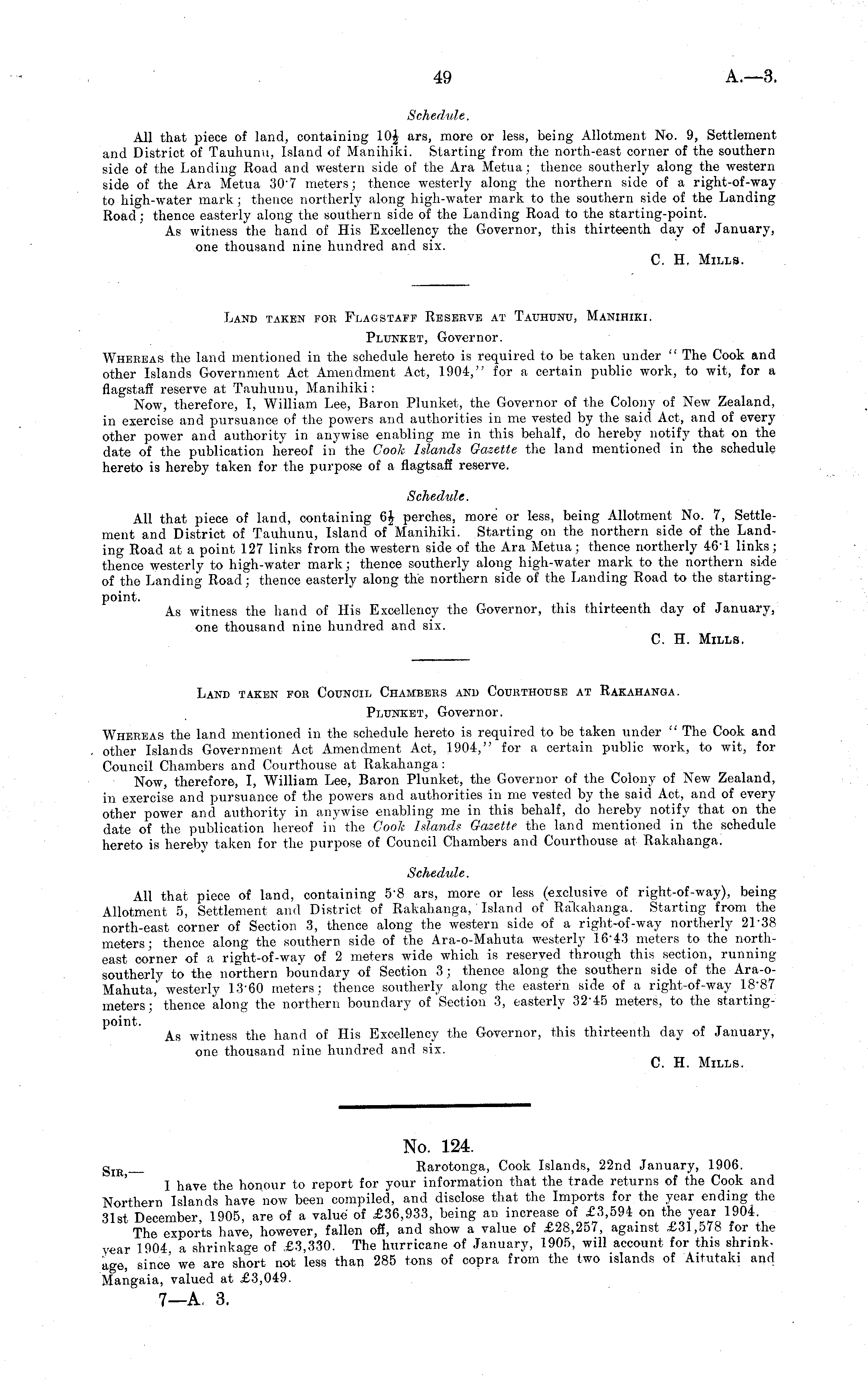 Land taken for Flagstaff Reserve at Tauhunu, Manihiki. Plunket, Governor. Whereas the land mentioned in the schedule hereto is required to be taken under " The Cook and other Islands Government Act Amendment Act, 1904," for a certain public work, to wit, for a flagstaff reserve at Tauhunu, Manihiki: Now, therefore, I, William Lee, Baron Plunket, the Governor of the Colony of New Zealand, in exercise and pursuance of the powers and authorities in me vested by the said Act, and of every other power and authority in anywise enabling me in this behalf, do hereby notify that on the date of the publication hereof in the Cook Islands Gazette the land mentioned in the schedule hereto is hereby taken for the purpose of a flagtsaff reserve. Schedule. All that piece of land, containing 6| perches, more or less, being Allotment No. 7, Settlement and District of Tauhunu, Island of Manihiki. Starting on the northern side of the Landing Road at a point 127 links from the western side of the Ara Metua; thence northerly 461 links; thence westerly to high-water mark; thence southerly along high-water mark to the northern side of the Landing Road; thence easterly along the northern side of the Landing Road to the startingpoint. As witness the hand of His Excellency the Governor, this thirteenth day of January, one thousand nine hundred and six. C. H. Mills,
