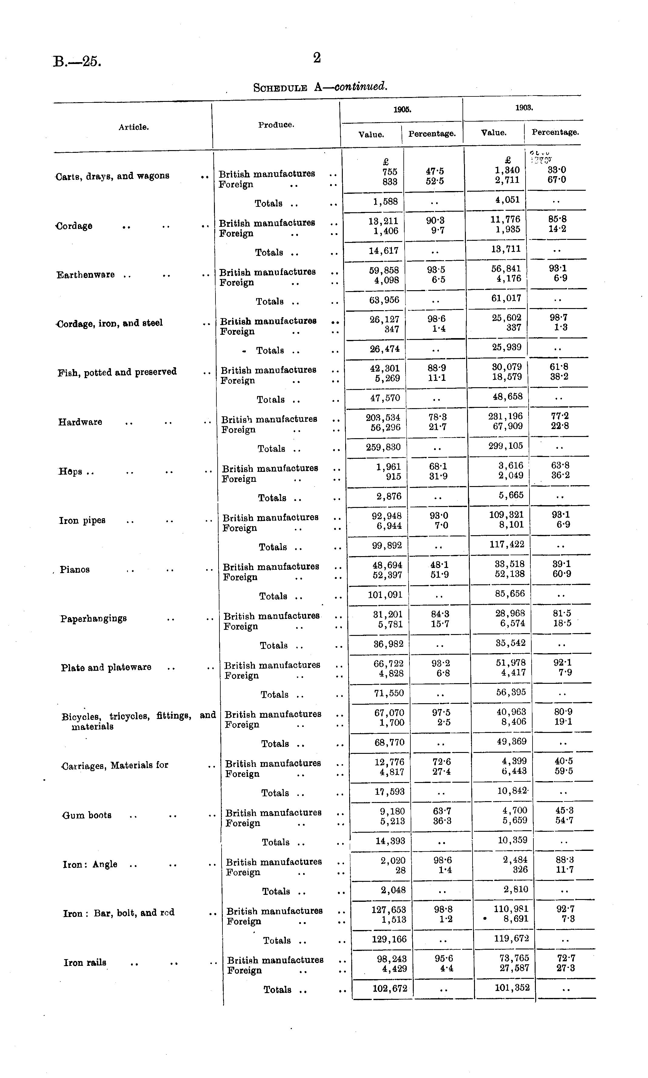 1905. 1903. Article. ■ro luee. Value. Percentage. Value. Percentage. £ 755 833 £ 1,340 2,711 33-0 67-0 Carts, drays, and wagons British manufactures Foreign 47-5 52-5 Totals .. 1,588 4,051 Cordage British manufactures Foreign 13,211 1,406 90-3 9-7 11,776 1,935 85-8 14-2 Earthenware .. Totals .. British manufactures Foreign 14,617 59,858 4,098 935 6-5 13,711 56,841 4,176 931 6-9 Totals .. 63,956 61,017 Cordage, iron, and steel British manufactures Foreign 26,127 347 98-6 1-4 25,602 337 98-7 1-3 Fish, potted and preserved - Totals .. 26,474 25,939 British manufactures Foreign 42,301 5,269 88-9 11-1 30,079 18,579 61-8 38-2 Totals .. 47,570 48,658 Hardware British manufactures Foreign 203,534 I 56,296 259,830 j 78-3 21-7 231,196 67,909 299,105 77-2 22-8 Heps .. Totals .. British manufactures Foreign 1,961 915 68-1 31-9 3,616 2,049 63-8 36-2 Iron pipes Totals .. 2,876 5,665 British manufactures Foreign 92,948 6,944 93-0 7-0 109,321 8,101 93-1 69 Pianos Totals .. 99,892 117,422 British manufactures Foreign 48,694 52,397 101,091 48-1 51-9 33,518 52,138 39-1 60-9 Paperhangings Totals .. 85,656 British manufactures Foreign 31,201 5,781 84-3 15-7 28,908 6,574 81-5 18-5 Plate and plateware Totals .. 36,982 35,542 British manufactures Foreign 66,722 4,828 93-2 6-8 51,978 4,417 92-1 7'9 Totals .. 71,550 56,395 Bicycles, tricycles, fittings, and materials British manufactures Foreign 67,070 1,700 97-5 2-5 40,963 8,406 80-9 19-1 Totals .. 68,770 49,369 Carriages, Materials for British manufactures Foreign 12,776 4,817 17,593 72-6 27-4 4,399 0,443 40-5 59-5 Totals .. 10,842 Gum boots British manufactures Foreign 9,180 5,213 63-7 36-3 4,700 5,659 45-3 54-7 Iron: Angle Totals .. 14,393 2,020 28 10,359 British manufactures Foreign 98-6 1-4 2,484 326 88-3 11-7 Totals .. 2,048 2,810 Iron : Bar, bolt, and rod British manufactures Foreign 127,653 1,513 98-8 1-2 110,981 8,691 92-7 7-3 Iron raila Totals .. 129,166 119,672 Britiflh manufactures Foreign 98,243 4,429 95-6 4-4 73,765 27,587 72-7 27-3 Totals .. 102,672 101,352