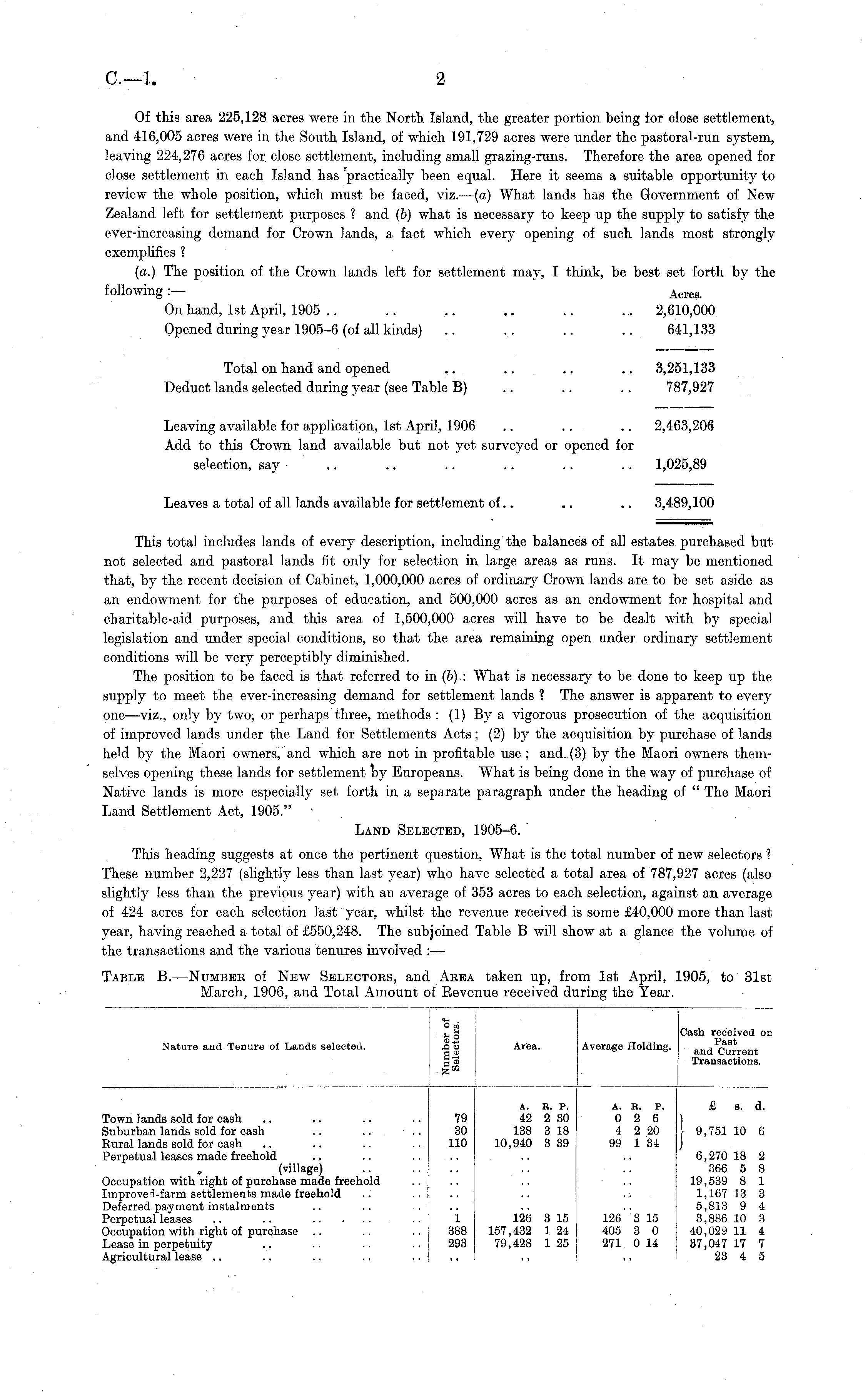 Of this area 225,128 acres were in the North Island, the greater portion being tor close settlement, and 416,005 acres were in the South Island, of which 191,729 acres were under the pastoral-run system, leaving 224,276 acres for. close settlement, including small grazing-runs. Therefore the area opened for close settlement in each Island has practically been equal. Here it seems a suitable opportunity to review the whole position, which must be faced, viz.—(a) What lands has the Government of New Zealand left for settlement purposes ? and (b) what is necessary to keep up the supply to satisfy the ever-increasing demand for Crown lands, a fact which every opening of such lands most strongly exemplifies ? (a.) The position of the Crown lands left for settlement may, I think, be best set forth by the following:— Aores . On hand, Ist April, 1905 .. .. ... .. .. ... 2,610,000 Opened during year 1905-6 (of all kinds) .. ... .. .. 641,133 Total on hand and opened .. .. .. .. 3,251,133 Deduct lands selected during year (see Table B) .. .. .. 787,927 Leaving available for application, Ist April, 1906 .. .. .. 2,463,206 Add to this Crown land available but not yet surveyed or opened for selection, say .. .. .. .. .. .. 1,025,89 Leaves a total of all lands available for settlement of.. .. .. 3,489,100 This total includes lands of every description, including the balances of all estates purchased but not selected and pastoral lands fit only for selection in large areas as runs. It may be mentioned that, by the recent decision of Cabinet, 1,000,000 acres of ordinary Crown lands are to be set aside as an endowment for the purposes of education, and 500,000 acres as an endowment for hospital and charitable-aid purposes, and this area of 1,500,000 acres will have to be dealt with by special legislation and under special conditions, so that the area remaining open under ordinary settlement conditions will be very perceptibly diminished. The position to be faced is that referred to in (b) : What is necessary to be done to keep up the supply to meet the ever-increasing demand for settlement lands ? The answer is apparent to every one —viz., only by two, or perhaps three, methods : (1) By a vigorous prosecution of the acquisition of improved lands under the Land for Settlements Acts; (2) by the acquisition by purchase of lands he!d by the Maori owners, and which are not in profitable use ; and (3) by the Maori owners themselves opening these lands for settlement by Europeans. What is being done in the way of purchase of Native lands is more especially set forth in a separate paragraph under the heading of " The Maori Land Settlement Act, 1905." - Land Selected, 1905-6. This heading suggests at once the pertinent question, What is the total number of new selectors ? These number 2,227 (slightly less than last year) who have selected a total area of 787,927 acres (also slightly less: than the previous year) with an average of 353 acres to each selection, against an average of 424 acres for each selection last year, whilst the revenue received is some £40,000 more than last year, having reached a total of £550,248. The subjoined Table B will show at a glance the volume of the transactions and the various tenures involved :—