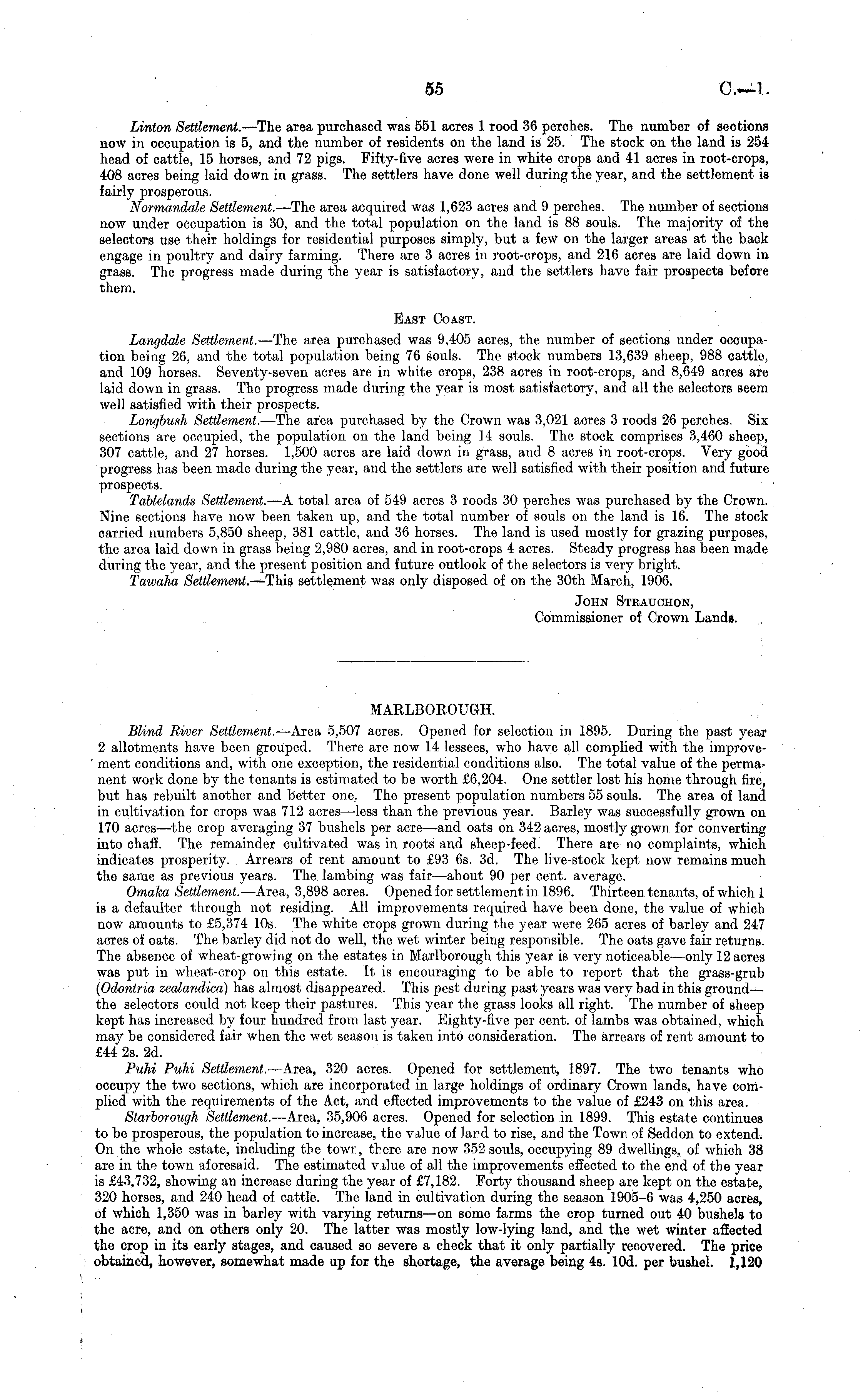 Linton Settlement. —The area purchased was 551 acres 1 rood 36 perches. The number of sections now in occupation is 5, and the number of residents on the land is 25. The stock on the land is 254 head of cattle, 15 horses, and 72 pigs. Fifty-five acres were in white crops and 41 acres in root-crops, 408 acres being laid down in grass. The settlers have done well during the year, and the settlement is fairly prosperous. Normandale Settlement. —The area acquired was 1,623 acres and 9 perches. The number of sections now under occupation is 30, and the total population on the land is 88 souls. The majority of the selectors use their holdings for residential purposes simply, but a few on the larger areas at the back engage in poultry and dairy farming. There are 3 acres in root-crops, and 216 acres are laid down in grass. The progress made during the year is satisfactory, and the settlers have fair prospects before them. East Coast. Langdale Settlement. —The area purchased was 9,405 acres, the number of sections under occupation being 26, and the total population being 76 souls. The stock numbers 13,639 sheep, 988 cattle, and 109 horses. Seventy-seven acres are in white crops, 238 acres in root-crops, and 8,649 acres are laid down in grass. The progress made during the year is most satisfactory, and all the selectors seem well satisfied with their prospects. Longbush Settlement. —The area purchased by the Crown was 3,021 acres 3 roods 26 perches. Six sections are occupied, the population on the land being 14 souls. The stock comprises 3,460 sheep, 307 cattle, and 27 horses. 1,500 acres are laid down in grass, and 8 acres in root-crops. Very good progress has been made during the year, and the settlers are well satisfied with their position and future prospects. Tablelands Settlement. —A total area of 549 acres 3 roods 30 perches was purchased by the Crown. Nine sections have now been taken up, and the total number of souls on the land is 16. The stock carried numbers 5,850 sheep, 381 cattle, and 36 horses. The land is used mostly for grazing purposes, the area laid down in grass being 2,980 acres, and in root-crops 4 acres. Steady progress has been made during the year, and the present position and future outlook of the selectors is very bright. Tawaha Settlement. —This settlement was only disposed of on the 30th March, 1906. John Strauchon, Commissioner of Crown Lands.