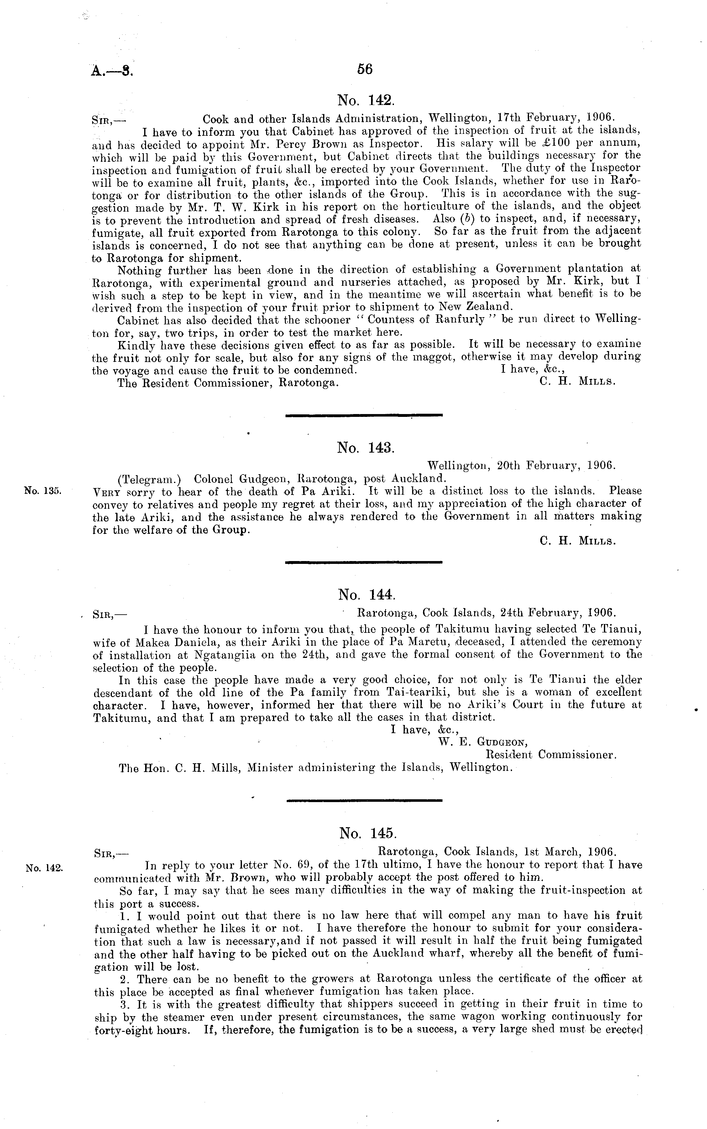 No. 145. Sir, — Rarotonga, Cook Islands, Ist March, 1906. In reply to your letter No. 69, of the 17th ultimo, I have the honour to report that I have communicated with Mr. Brown, who will probably accept the post offered to him. So far, I may say that he sees many difficulties in the way of making the fruit-inspection at this port a success. 1. I would point out that there is no law here that will compel any man to have his fruit fumigated whether he likes it or not. I have therefore the honour to submit for your consideration that such a law is necessary,and if not passed it will result in half the fruit being fumigated and the other half having to be picked out on the Auckland wharf, whereby all the benefit of fumigation will be lost. 2. There can be no benefit to the growers at Rarotonga unless the certificate of the officer at this place be accepted as final whenever fumigation has taken place. 3. It is with the greatest difficulty that shippers succeed in getting in their fruit in time to ship by the steamer even under present circumstances, the same wagon working continuously for forty-eight hours. If, therefore, the fumigation is to be a success, a very large shed must be erected