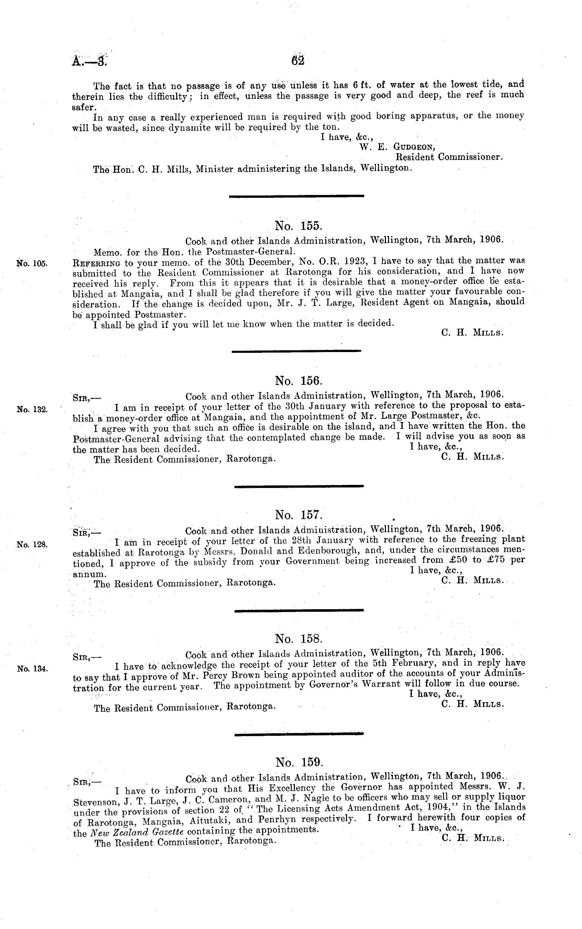 The fact is that no passage is of any use unless it has 6 ft. of water at the lowest tide, and therein lies the difficulty; in effect, unless the passage is very good and deep, the reef is much safer. In any case a really experienced man is required with good boring apparatus, or the money will be wasted, since dynamite will be required by the ton. I have, &c, W. E. Gudgeon, Resident Commissioner. The Hon. C. H. Mills, Minister administering the Islands, Wellington.