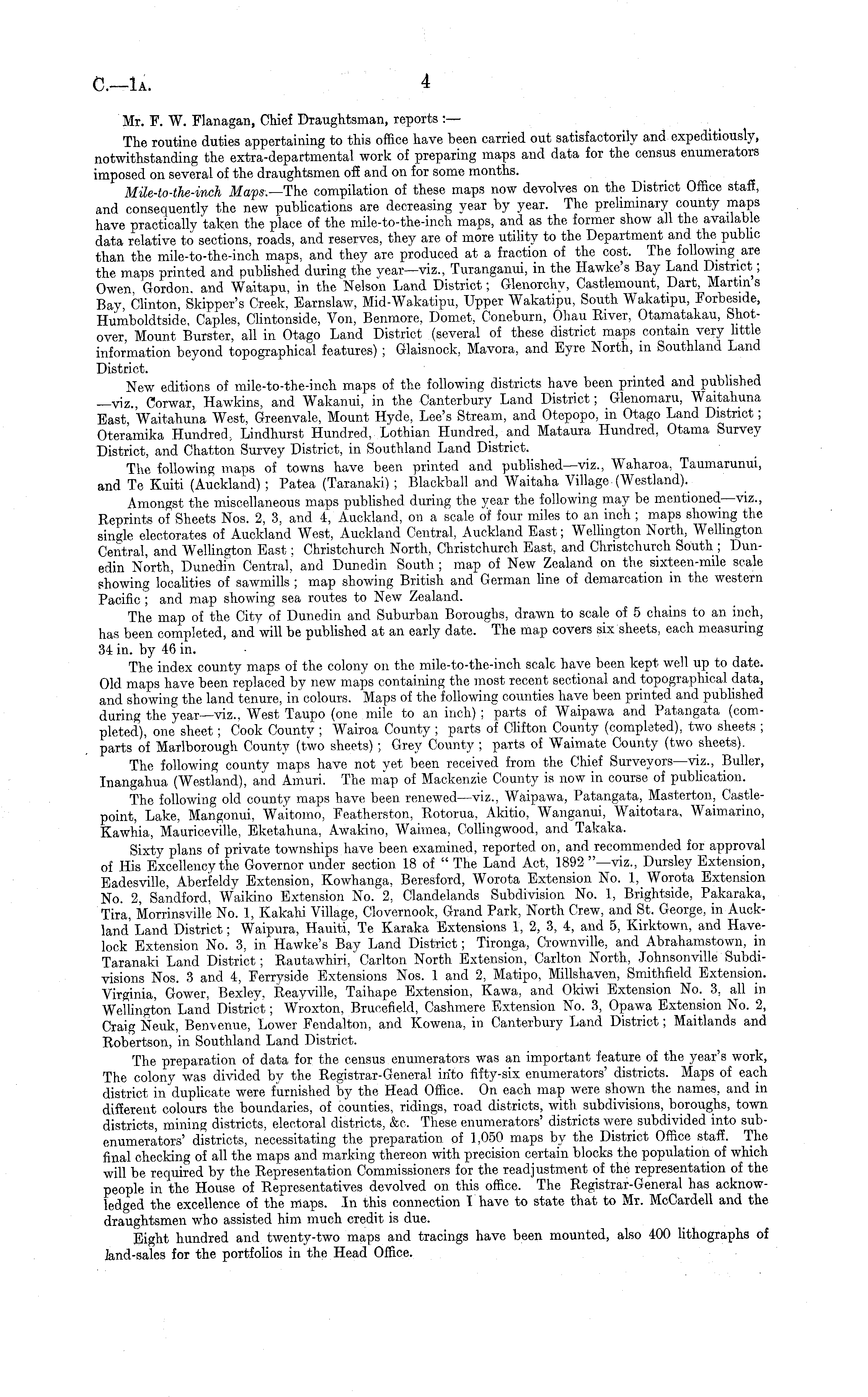 Mr. F. W. Flanagan, Chief Draughtsman, reports :— The routine duties appertaining to this office have been carried out satisfactorily and expeditiousiy, notwithstanding the extra-departmental work of preparing maps and data for the census enumerators imposed on several of the draughtsmen off and on for some months. Mile-to-the-inch Maps.—The compilation of these maps now devolves on the District Office staff, and consequently the new publications are decreasing year by year. The preliminary county maps have practically taken the place of the mile-to-the-inch maps, and as the former show all the available data relative to sections, roads, and reserves, they are of more utility to the Department and the public than the mile-to-the-inch maps, and they arc produced at a fraction of the cost. The following are the maps printed and published during the year—viz., Turanganui, in the Hawke's Bay Land District; Owen Gordon and Waitapu, in the Nelson Land District; Glenorchy, Castlemount, Dart, Martin s Bay, Clinton, Skipper's Creek, Earnslaw, Mid-Wakatipu, Upper Wakatipu, South Wakatipu, Forbeside, Humboldtside, Caples, Clintonside, Yon, Benmore, Domet, Coneburn, Ohau Eiver, Otamatakau, Shotover, Mount Burster, all in Otago Land District (several of these district maps contain very little information beyond topographical features) ; Glaisnock, Mavora, and Eyre North, in Southland Land District. New editions of mile-to-the-inch maps of the following districts have been printed and published —viz., Corwar, Hawkins, and Wakanui, in the Canterbury Land District; Glenomaru, Waitahuna East Waitahuna West, Greenvale, Mount Hyde, Lee's Stream, and Otepopo, in Otago Land District; Oteramika Hundred, Lindhurst Hundred, Lothian Hundred, and Mataura Hundred, Otama Survey District, and Chatton Survey District, in Southland Land District. The following maps of towns have been printed and published—viz., Waharoa, Taumarunui, and Te Kuiti (Auckland) ; Patea (Taranaki) ; Blackball and Waitaha Village (Westland). Amongst the miscellaneous maps published during the year the following may be mentioned—viz., Reprints of Sheets Nos. 2, 3, and 4, Auckland, on a scale of four miles to an inch ; maps showing the single electorates of Auckland West, Auckland Central, Auckland East; Wellington North, Wellington Central, and Wellington East: Christchurch North, Christchurch East, and Christchurch South ; Dunedin North, Dunedin Central, and Dunedin South ; map of New Zealand on sixteen-mile scale showing localities of sawmills ; map showing British and German line of demarcation in the western Pacific ; and map showing sea routes to New Zealand. The map of the City of Dunedin and Suburban Boroughs, drawn to scale of 5 chains to an inch, has been completed, and will be published at an early date. The map covers six sheets, each measuring 34 in. by 46 in. The index county maps of the colony on the mile-to-the-inch scale have been kept well up to date. Old maps have been replaced by new maps containing the most recent sectional and topographical data, and showing the land tenure, in colours. Maps of the following counties have been printed and published during the year—viz.. West Taupo (one mile to an inch) ; parts of Waipawa and Patangata (completed), one sheet; Cook County ; Wairoa County ; parts of Clifton County (completed), two sheets ; parts of Marlborough County (two sheets) ; Grey County ; parts of Waimate County (two sheets). The following county maps have not yet been received from the Chief Surveyors—viz., Buller, Inangahua (Westland), and Amuri. The map of Mackenzie County is now in course of publication. The following old county maps have been renewed —viz., Waipawa, Patangata, Masterton, Castlepoint, Lake, Mangonui, Waitomo, Featherston, Rotorua, Akitio, Wanganui, Waitotara, Waimarino, Kawhia, Mauriceville, Eketahuna, Awakino, Waimea, Collingwood, and Takaka. Sixty plans of private townships have been examined, reported on, and recommended for approval of His Excellency the Governor under section 18 of " The Land Act, 1892 "—viz., Dursley Extension, Eadesville, Aberfeldy Extension, Kowhanga, Beresford, Worota Extension No. 1, Worota Extension No. 2, Sandford, Waikino Extension No. 2, Clandelands Subdivision No. 1, Brightside, Pakaraka, Tira, Morrinsville No. 1, Kakahi Village, Clovernook, Grand Park, North Crew, and St. George, in Auckland Land District; Waipura, Hauiti, Te Karaka Extensions 1, 2, 3, 4, and 5, Kirktown, and Havelock Extension No. 3, in Hawke's Bay Land District; Tironga, Crownville, and Abrahamstown, in Taranaki Land District; Rautawhiri," Carlton North Extension, Carlton North, Jolmsonville Subdivisions Nos. 3 and 4, Ferryside Extensions Nos. 1 and 2, Matipo, Millshaven, Smithfield Extension. Virginia, Gower, Bexley, Reayville, Taihape Extension, Kawa, and Okiwi Extension No. 3, all in Wellington Land District; Wroxton, Brucefield, Cashmere Extension No. 3, Opawa Extension No. 2, Craig Neuk, Benvenue, Lower Fendalton, and Kowena, in Canterbury Land District; Maitlands and Robertson, in Southland Land District. The preparation of data for the census enumerators was an important feature of the year's work, The colony was divided by the Registrar-General into fifty-six enumerators' districts. Maps of each district in duplicate weTe furnished by the Head Office. On each map were shown the names, and in different colours the boundaries, of counties, ridings, road districts, with subdivisions, boroughs, town districts, mining districts, electoral districts, &c. These enumerators' districts were_ subdivided into subenumerators' districts, necessitating the preparation of 1,050 maps by the District Omce_ staff. The final checking of all the maps and marking thereon with precision certain blocks the population of which will be required by the Representation Commissioners for the readjustment of the representation of the people in the House of Representatives devolved on this office. Th