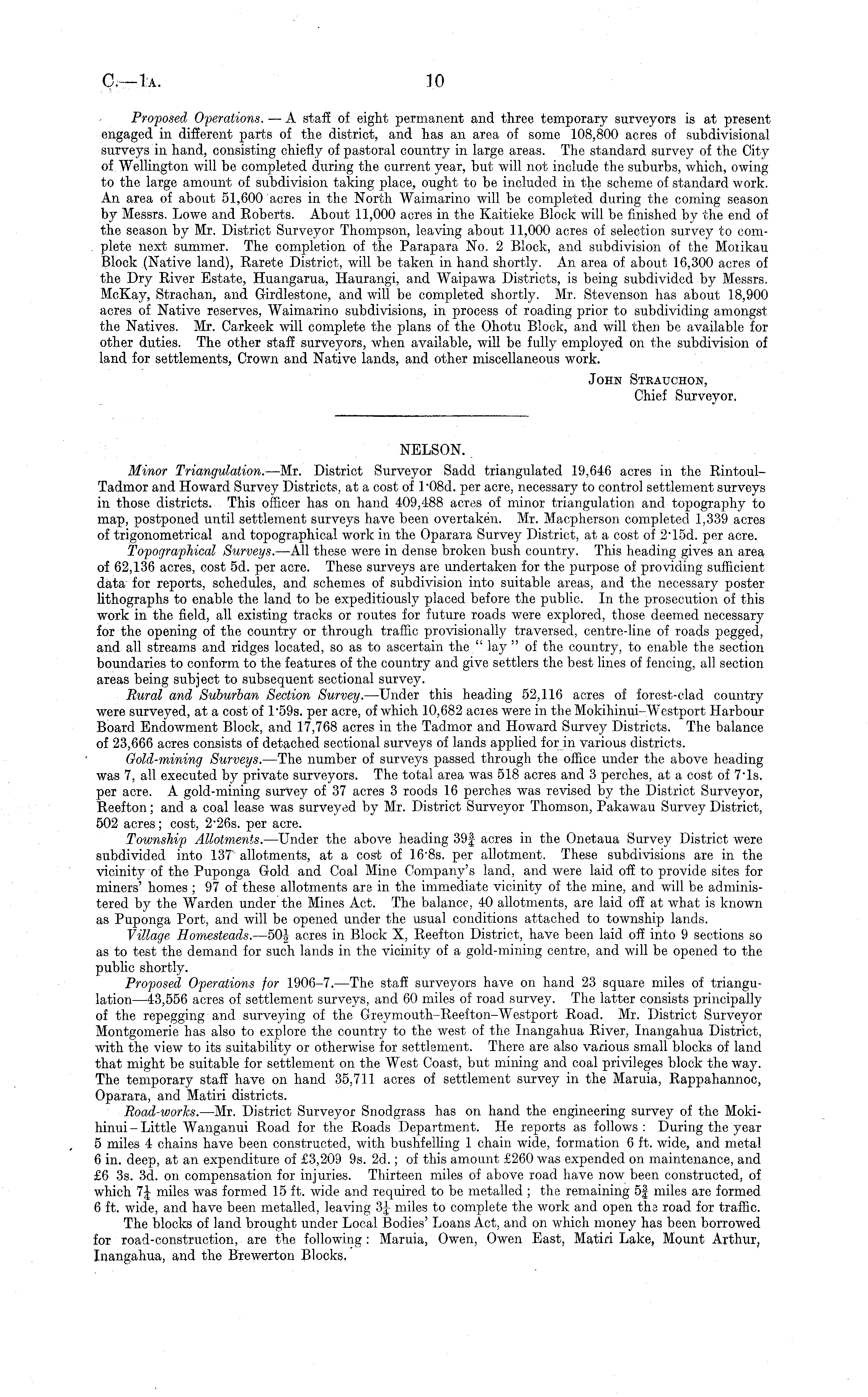 Proposed Operations. — A staff of eight permanent and three temporary surveyors is at present engaged in different parts of the district, and has an area of some 108,800 acres of subdivisional surveys in hand, consisting chiefly of pastoral country in large areas. The standard survey of the City of Wellington will be completed during the current year, but will not include the suburbs, which, owing to the large amount of subdivision taking place, ought to be included in the scheme of standard work. An area of about 51,600 acres in the North Waimarino will be completed during the coming season by Messrs. Lowe and Roberts. About 11,000 acres in the Kaitieke Block will be finished by the end of the season by Mr. District Surveyor Thompson, leaving about 11,000 acres of selection survey to complete next summer. The completion of the Parapara No. 2 Block, and subdivision of the Moiikau Block (Native land), Rarete District, will be taken in hand shortly. An area of about 16,300 acres of the Dry River Estate, Huangarua, Haurangi, and Waipawa Districts, is being subdivided by Messrs. McKay, Strachan, and Girdlestone, and will be completed shortly. Mr. Stevenson has about 18,900 acres of Native reserves, Waimarino subdivisions, in process of roading prior to subdividing amongst the Natives. Mr. Carkeek will complete the plans of the Ohotu Block, and will then be available for other duties. The other staff surveyors, when available, will be fully employed on the subdivision of land for settlements, Crown and Native lands, and other miscellaneous work. John Strauohon, Chief Surveyor,