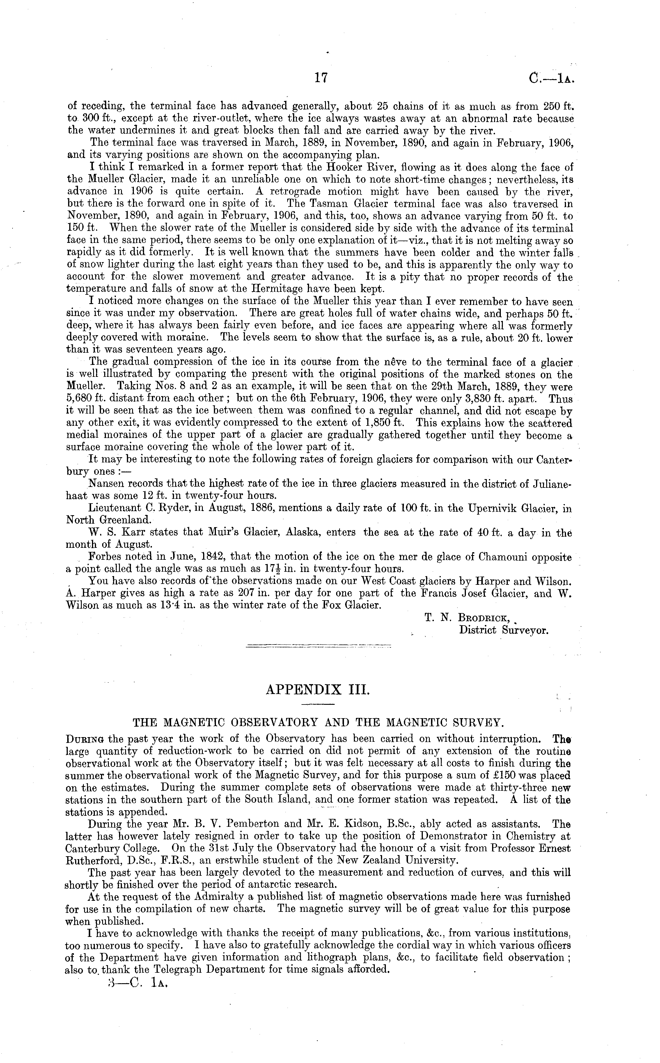of receding, the terminal face has advanced generally, about 25 chains of it as much as from 250 ft. to 300 ft., except at the river-outlet, where the ice always wastes away at an abnormal rate because the water undermines it and great blocks then fall and are carried away by the river. The terminal face was traversed in March, 1889, in November, 1890, and again in February, 1906, and its varying positions are shown on the accompanying plan. I think I remarked in a former report that the Hooker River, flowing as it does along the face of the Mueller Glacier, made it an unreliable one on which to note short-time changes; nevertheless, its advance in 1906 is quite certain. A retrograde motion might have been caused by the river, but there is the forward one in spite of it. The Tasman Glacier terminal face was also traversed in November, 1890, and again in February, 1906, and this, too, shows an advance varying from 50 ft. to 150 ft. When the slower rate of the Mueller is considered side by side with the advance of its terminal face in the same period, there seems to be only one explanation of it—viz., that it is not melting away so rapidly as it did formerly. It is well known that the summers have been colder and the winter falls of snow lighter during the last eight years than they used to be, and this is apparently the only way to account for the slower movement and greater advance. It is a pity that no proper records of the temperature and falls of snow at the Hermitage have been kept. I noticed more changes on the surface of the Mueller this year than I ever remember to have seen since it was under my observation. There are great holes full of water chains wide, and perhaps 50 ft. deep, where it has always been fairly even before, and ice faces are appearing where all was formerly deeply covered with moraine. The levels seem to show that the surface is, as a rule, about 20 ft. lower than it was seventeen years ago. The gradual compression of the ice in its course from the neve to the terminal face of a glacier is well illustrated by comparing the present with the original positions of the marked stones on the Mueller. Taking Nos. 8 and 2as an example, it will be seen that on the 29th March, 1889, they were 5,680 ft. distant from each other ; but on the 6th February, 1906, they were only 3,830 ft. apart. Thus it will be seen that as the ice between them was confined to a regular channel, and did not escape by any other exit, it was evidently compressed to the extent of 1,850 ft. This explains how the scattered medial moraines of the upper part of a glacier are gradually gathered together until they become a surface moraine covering the whole of the lower part of it. It may be interesting to note the following rates of foreign glaciers for comparison with our Canterbury ones : — Nansen records that the highest rate of the ice in three glaciers measured in the district of Julianehaat was some 12 ft. in twenty-four hours. Lieutenant C. Ryder, in August, 1886, mentions a daily rate of 100 ft. in the Upernivik Glacier, in North Greenland. W. S. Karr states that Muir's Glacier, Alaska, enters the sea at the rate of 40 ft. a day in the month of August. Forbes noted in June, 1842, that the motion of the ice on the mer de glace of Chamouni opposite a point called the angle was as much as 17| in. in twenty-four hours. You have also records of the observations made on our West Coast glaciers by Harper and Wilson. A. Harper gives as high a rate as 207 in. per day for one part of the Francis Josef Glacier, and W. Wilson as much as 13 4 in. as the winter rate of the Fox Glacier. T. N. Beodeick, District Surveyor.