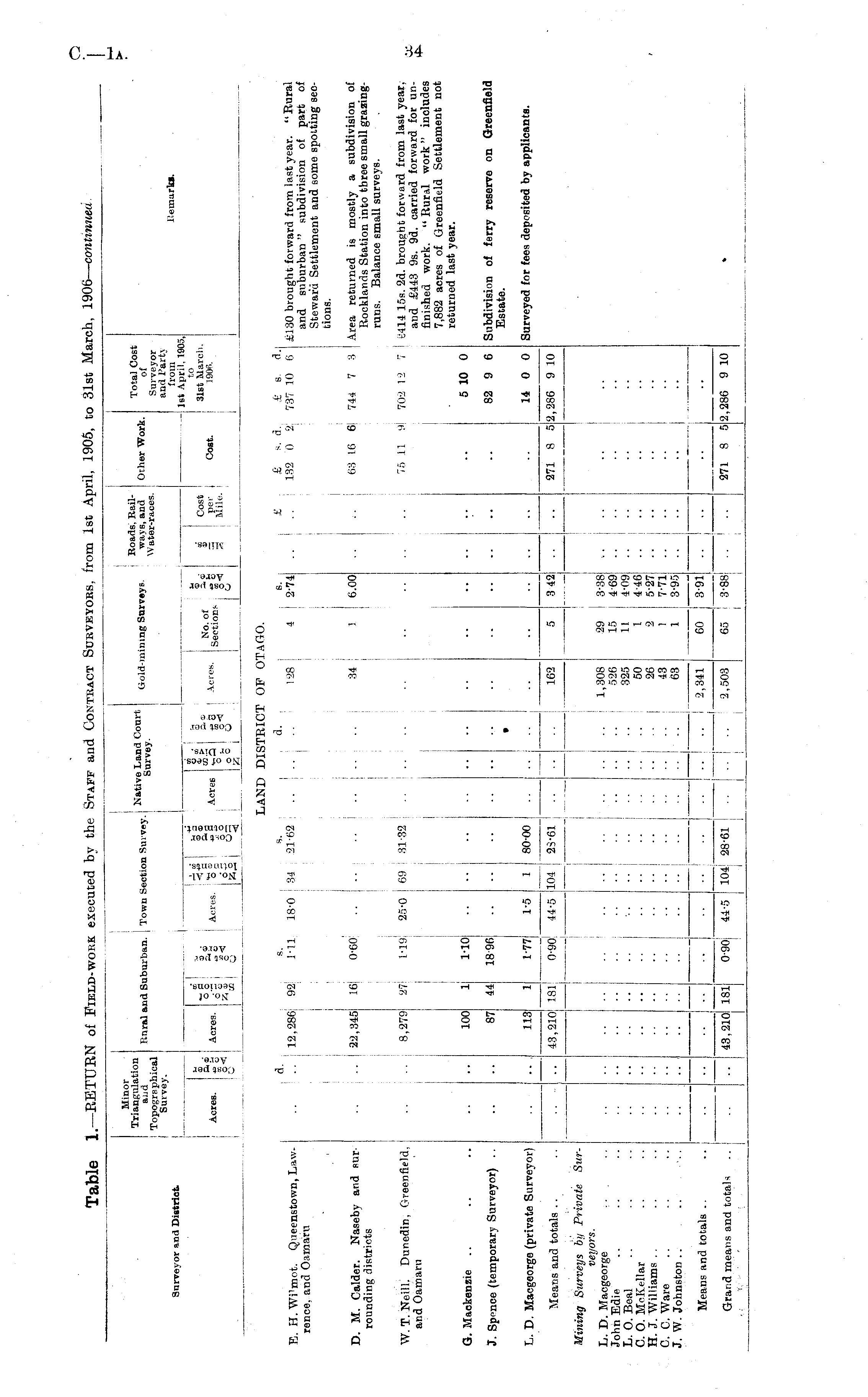 Table 1. —RETURN of Field-work executed by the Staff and Contract Surveyors, from 1st April, 1905, to 31st March, 1906—continued.