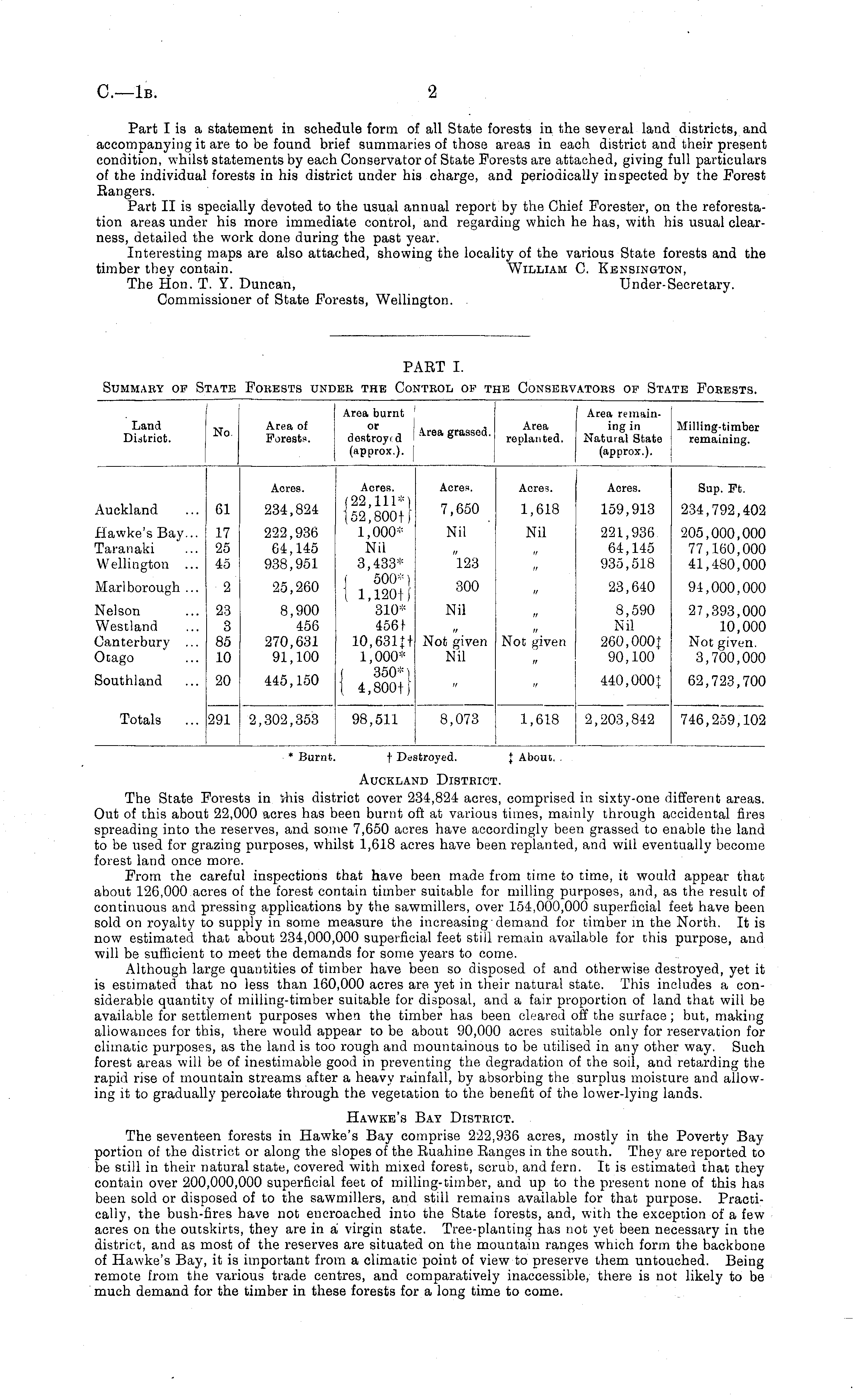 Part I is a statement in schedule form of all State forests in the several land districts, and accompanying it are to be found brief summaries of those areas in each district and their present condition, whilst statements by each Conservator of State Forests are attached, giving full particulars of the individual forests in his district under his charge, and periodically inspected by the Forest Eangers. Part II is specially devoted to the usual annual report by the Chief Forester, on the reforestation areas under his more immediate control, and regarding which he has, with his usual clearness, detailed the work done during the past year. Interesting maps are also attached, showing the locality of the various State forests and the timber they contain. William C. Kensington, The Hon. T. Y. Duncan, Under-Secretary. Commissioner of State Forests, Wellington. .