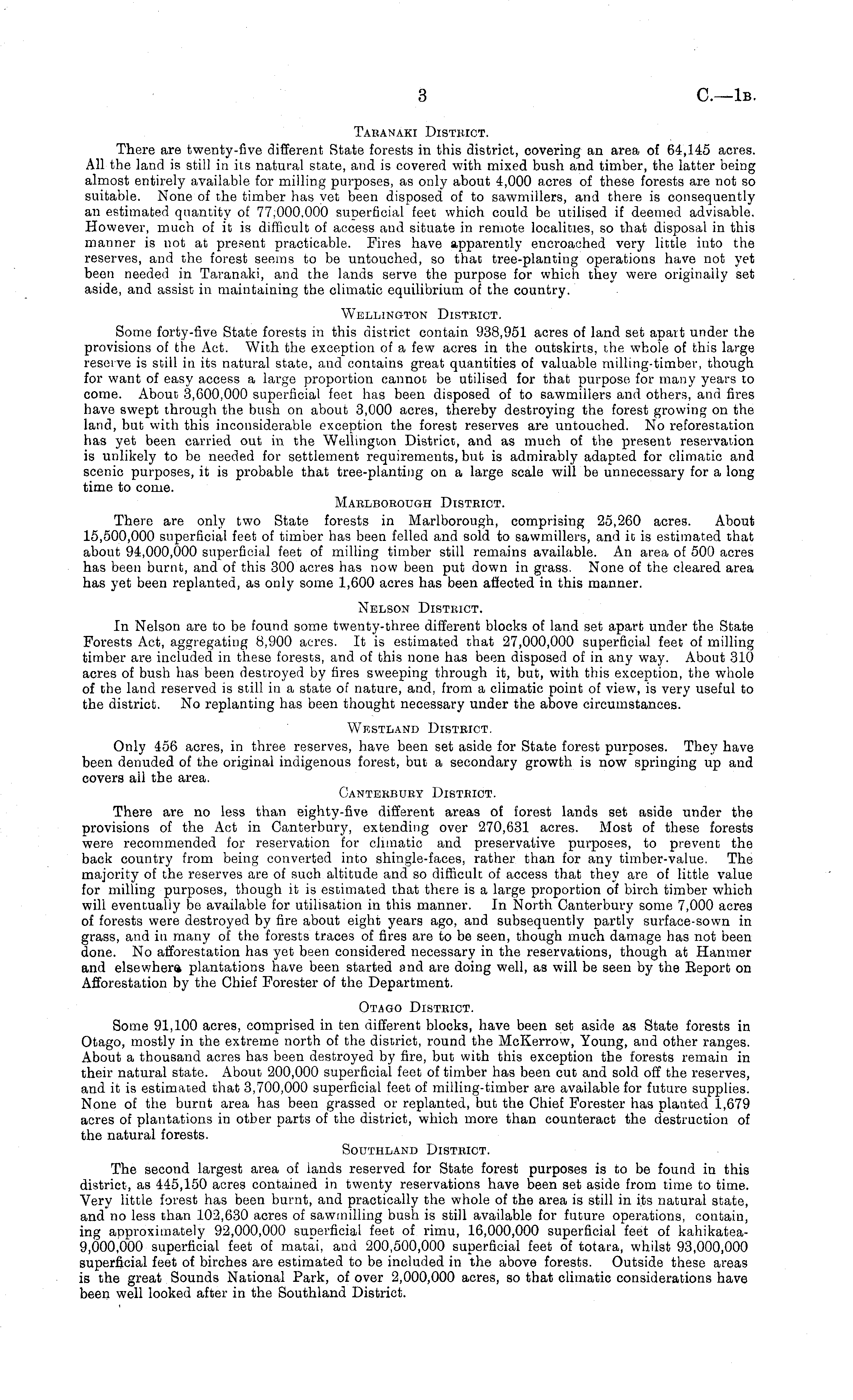 Taeanaki Distkict. There are twenty-five different State forests in this district, covering an area of 64,145 acres. All the land is still in its natural state, and is covered with mixed bush and timber, the latter being almost entirely available for milling purposes, as only about 4,000 acres of these forests are not so suitable. None of the timber has yet been disposed of to sawmillers, and there is consequently an estimated quantity of 77;000,000 superficial feet which could be utilised if deemed advisable. However, much of it is difficult of access and situate in remote localities, so that disposal in this manner is not at present practicable. Fires have apparently encroached very little into the reserves, and the forest seems to be untouched, so that tree-planting operations have not yet been needed in Taranaki, and the lands serve the purpose for which they were originally set aside, and assist in maintaining the climatic equilibrium of the country. Wellington Disteict. Some forty-five State forests in this district contain 938,951 acres of land set apart under the provisions of the Act. With the exception of a few acres in the outskirts, the whole of this large reserve is still in its natural state, and contains great quantities of valuable milling-timber, though for want of easy access a large proportion cannot be utilised for that purpose, for many years to come. About 3,600,000 superficial feet has been disposed of to sawmillers and others, and fires have swept through the bush on about 3,000 acres, thereby destroying the forest growing on the land, but with this inconsiderable exception the forest reserves are untouched. No reforestation has yet been carried out in the Wellington District, and as much of the present reservation is unlikely to be needed for settlement requirements, but is admirably adapted for climatic and scenic purposes, it is probable that tree-planting on a large scale will be unnecessary for a long time to come. Marlborough Disteict. There are only two State forests in Marlborough, comprising 25,260 acres. About 15,500,000 superficial feet of timber has been felled and sold to sawmillers, and it is estimated that about 94,000,000 superficial feet of milling timber still remains available. An area of 500 acres has been burnt, and of this 300 acres has now been put down in grass. None of the cleared area has yet been replanted, as only some 1,600 acres has been affected in this manner. Nelson District. In Nelson are to be found some twenty-three different blocks of land set apart under the State Forests Act, aggregating 8,900 acres. It is estimated that 27,000,000 superficial feet of milling timber are included in these forests, and of this none has been disposed of in any way. About 310 acres of bush has been destroyed by fires sweeping through it, but, with this exception, the whole of the land reserved is still in a state of nature, and, from a climatic point of view, is very useful to the district. No replanting has been thought necessary under the above circumstances. Wbstland Distkict. Only 456 acres, in three reserves, have been set aside for State forest purposes. They have been denuded of the original indigenous forest, but a secondary growth is now springing up and covers all the area. Canterbury District. There are no less than eighty-five different areas of forest lands set aside under the provisions of the Act in Canterbury, extending over 270,631 acres. Most of these forests were recommended for reservation for climatic and preservative purposes, to prevent the back country from being converted into shingle-faces, rather than for any timber-value. The majority of the reserves are of such altitude and so difficult of access that they are of little value for milling purposes, though it is estimated that there is a large proportion of birch timber which will eventually be available for utilisation in this manner. In North Canterbury some 7,000 acres of forests were destroyed by fire about eight years ago, and subsequently partly surface-sown in grass, and in many of the forests traces of fires are to be seen, though much damage has not been done. No afforestation has yet been considered necessary in the reservations, though at Hanmer and elsewhera plantations have been started and are doing well, as will be seen by the Report on Afforestation by the Chief Forester of the Department. Otago District. Some 91,100 acres, comprised in ten different blocks, have been set aside as State forests in Otago, mostly in the extreme north of the district, round the McKerrow, Young, and other ranges. About a thousand acres has been destroyed by fire, but with this exception the forests remain in their natural state. About 200,000 superficial feet of timber has been cut and sold off the reserves, and it is estimated that 3,700,000 superficial feet of milling-timber are available for future supplies. None of the burnt area has been grassed or replanted, but the Chief Forester has planted 1,679 acres of plantations in otber parts of the district, which more than counteract the destruction of the natural forests. Southland District. The second largest area of lands reserved for State forest purposes is to be found in this district, as 445,150 acres contained in twenty reservations have been set aside from time to time. Very little forest has been burnt, and practically the whole of the area is still in its natural state, and no less than 102,630 acres of sawrnilling bush is still available for future operations, contain, ing approximately 92,000,000 superficial feet of rimu, 16,000,000 superficial feet of kahikatea--9,000,000 superficial feet of matai, and 200,500,000 superficial feet of totara, whilst 93,000,000 superficial feet of birches are estimated to be included in the above forests. Outside these areas is the great Sounds National Park, of over 2,000,000 acres, so that climatic considerations have been well looked after in the Southland District.