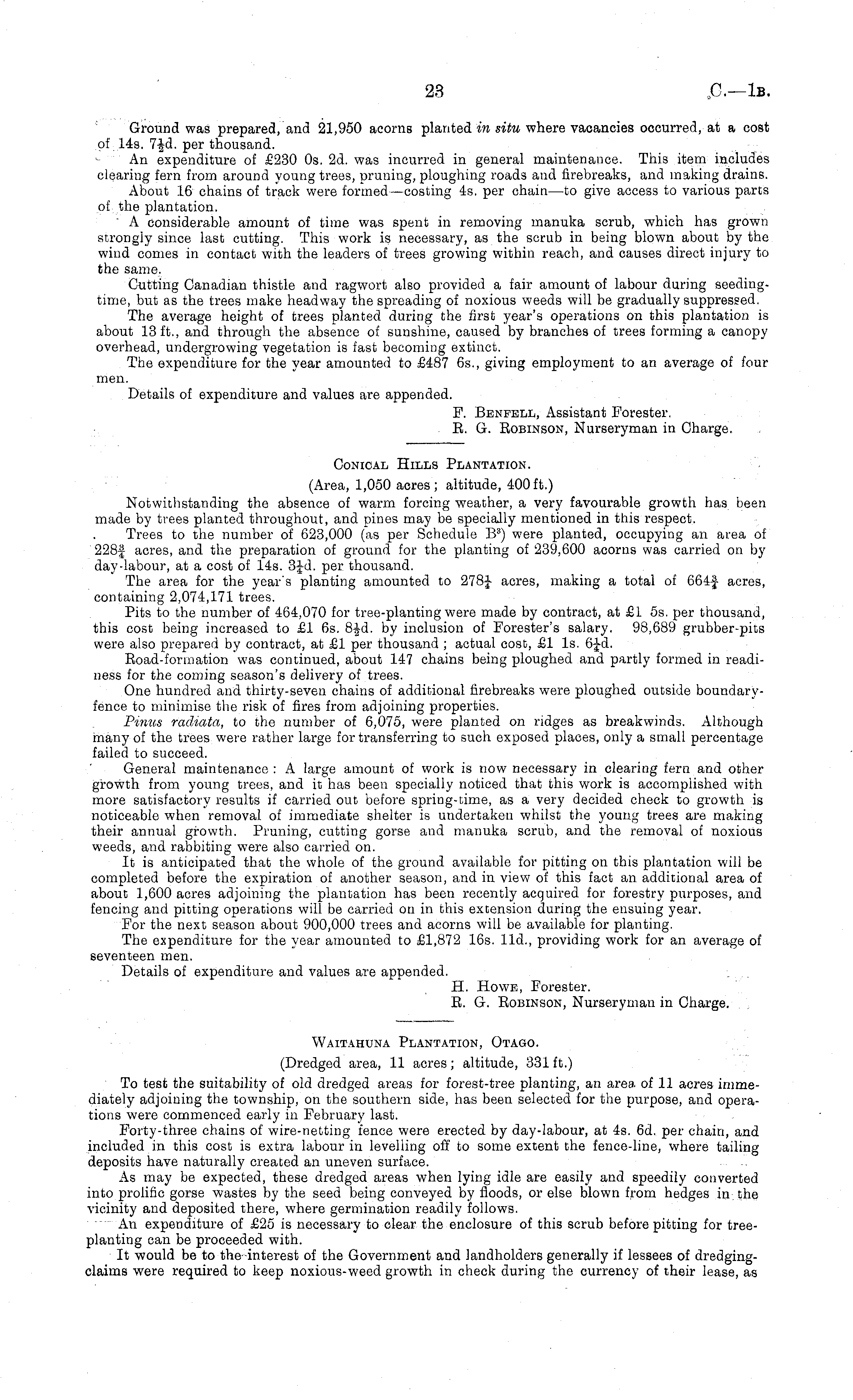 Conical Hills Plantation. (Area, 1,050 acres; altitude, 400 ft.) Notwithstanding the absence of warm forcing weather, a very favourable growth has been made by trees planted throughout, and pines may be specially mentioned in this respect. Trees to the number of 623,000 (as per Schedule B 3 ) were planted, occupying an area of 228f acres, and the preparation of ground for the planting of 239,600 acorns was carried on by day-labour, at a cost of 14s. 3Jd. per thousand. The area for the year's planting amounted to 278J acres, making a total of 664f- acres, containing 2,074,171 trees. Pits to the number of 464,070 for tree-planting were made by contract, at £1 ss. per thousand, this cost being increased to £1 6s. B|d. by inclusion of Forester's salary. 98,689 grubber-pits were also prepared by contract, at £1 per thousand ; actual cost, £1 Is. 6-J-d. Eoad-formation was continued, about 147 chains being ploughed and partly formed in readiness for the coming season's delivery of trees. One hundred and thirty-seven chains of additional firebreaks were ploughed outside boundaryfence to minimise the risk of fires from adjoining properties. Pinus radiata, to the number of 6,075, were planted on ridges as breakwinds. Although many of the trees were rather large for transferring to such exposed places, only a small percentage failed to succeed. General maintenance : A large amount of work is now necessary in clearing fern and other growth from young trees, and it has been specially noticed that this work is accomplished with more satisfactory results if carried out before spring-time, as a very decided check to growth is noticeable when removal of immediate shelter is undertaken whilst the young trees are making their annual growth. Pruning, cutting gorse and manuka scrub, and the removal of noxious weeds, and rabbiting were also carried on. It is anticipated that the whole of the ground available for pitting on this plantation will be completed before the expiration of another season, and in. view of this fact an additional area of about 1,600 acres adjoining the plantation has been recently acquired for forestry purposes, and fencing and pitting operations will be carried on in this extension during the ensuing year. For the next season about 900,000 trees and acorns will be available for planting. The expenditure for the year amounted to £1,872 16s. lid., providing work for an average of seventeen men. Details of expenditure and values are appended. H. Howe, Forester. E. G. Robinson, Nurseryman in Charge.