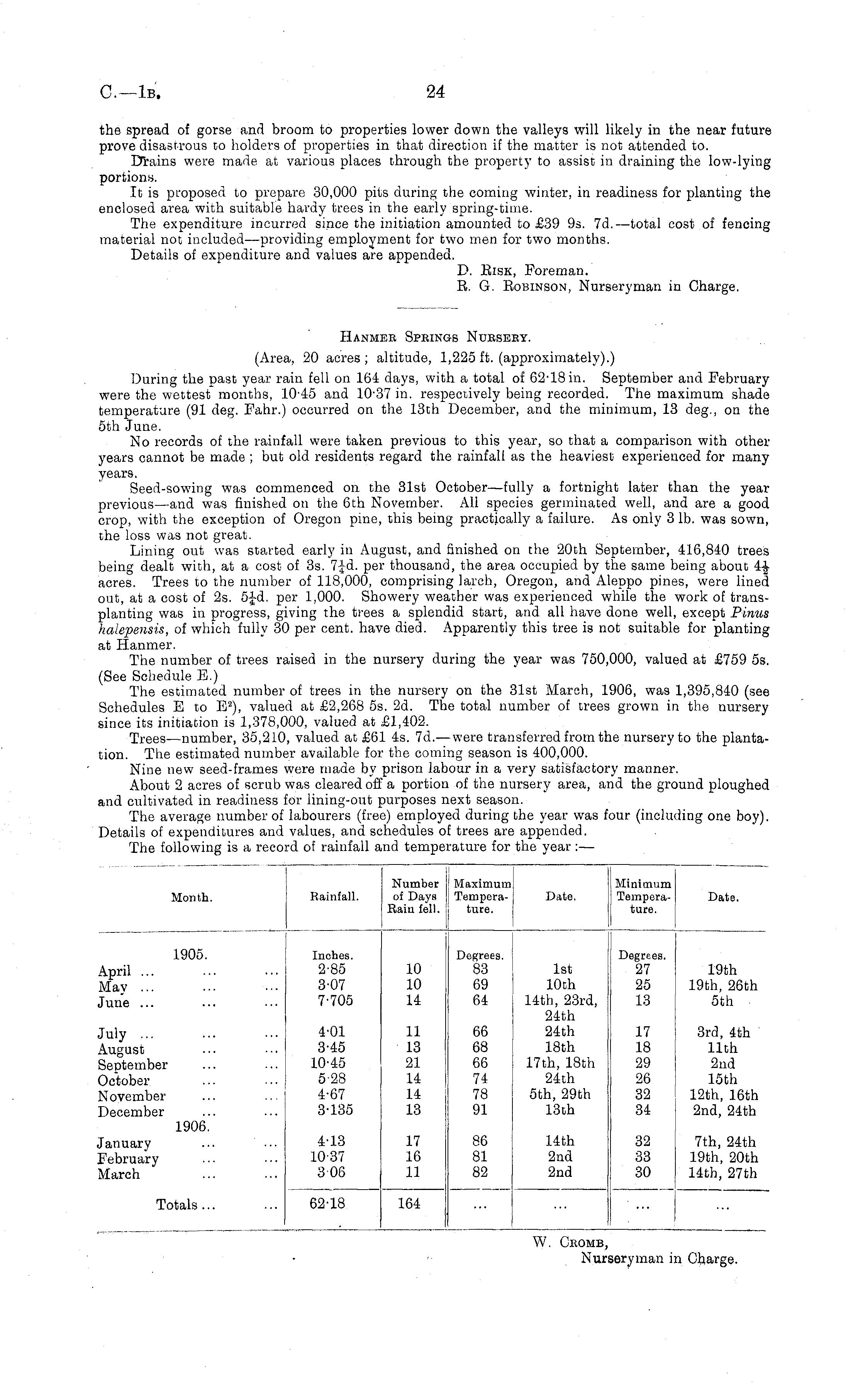 Hanmer Springs Nursbey. (Area, 20 acres ; altitude, 1,225 ft. (approximately).) During the past year rain fell on 164 days, with a total of 62-18 in. September and February were the wettest months, 10-45 and 10-37 in. respectively being recorded. The maximum shade temperature (91 deg. Fahr.) occurred on the 13th December, and the minimum, 13 deg., on the sth June. No records of the rainfall were taken previous to this year, so that a comparison with other years cannot be made ; but old residents regard the rainfall as the heaviest experienced for many years. Seed-sowing was commenced on the 31st October—fully a fortnight later than the year previous—and was finished on the 6th November. All species germinated well, and are a good crop, with the exception of Oregon pine, this being practically a failure. As only 3 lb. was sown, the loss was not great. Lining out was started early in August, and finished on the 20th September, 416,840 trees being dealt with, at a cost of 3s. 7Jd. per thousand, the area occupied by the same being about 4-J--acres. Trees to the number of 118,000, comprising larch, Oregon, and Aleppo pines, were lined out, at a cost of 2s. 5Jd. per 1,000. Showery weather was experienced while the work of transplanting was in progress, giving the trees a splendid start, and all have done well, except Pinus halepensis, of which fully 30 per cent, have died. Apparently this tree is not suitable for planting at Hanmer. The number of trees raised in the nursery during the year was 750,000, valued at £759 ss. (See Schedule E.) The estimated number of trees in the nursery on the 31st March, 1906, was 1,395,840 (see Schedules Eto E 2 ), valued at £2,268 ss. 2d. The total number of trees grown in the nursery since its initiation is 1,378,000, valued at £1,402. Trees —number, 35,210, valued at £61 4s. 7d.—were transferred from the nursery to the plantation. The estimated number available for the coming season is 400,000. Nine new seed-frames were made by prison labour in a very satisfactory manner. About 2 acres of scrub was cleared off a portion of the nursery area, and the ground ploughed and cultivated in readiness for lining-out purposes next season. The average number of labourers (free) employed during the year was four (including one boy). Details of expenditures and values, and schedules of trees are appended. The following is a record of rainfall and temperature for the year : —