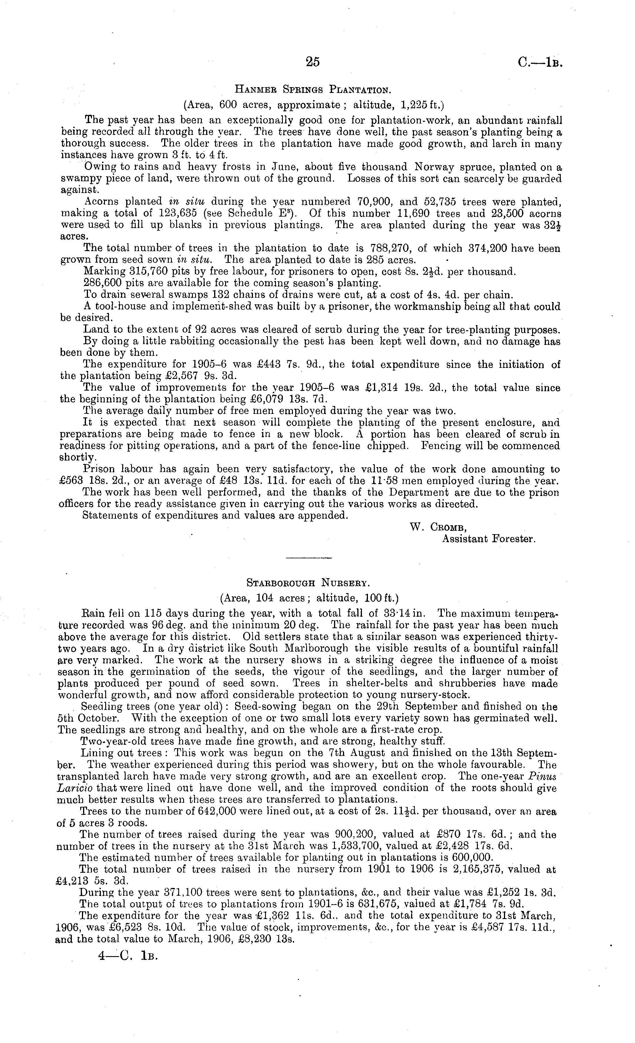 Hanmeb Speings Plantation. (Area, 600 acres, approximate; altitude, 1,225 ft.) The past year has been an exceptionally good one for plantation-work, an abundant rainfall being recorded all through the year. The trees have done well, the past season's planting being a thorough success. The older trees in the plantation have made good growth, and larch in many instances have grown 3 ft. to 4 ft. Owing to rains and heavy frosts in June, about five thousand Norway spruce, planted on a swampy piece of land, were thrown out of the ground. Losses of this sort can scarcely be guarded against. Acorns planted in situ during the year numbered 70,900, and 52,735 trees were planted, making a total of 123,635 (see Schedule E 3 ). Of this number 11,690 trees and 23,500 acorns were used to fill up blanks in previous plantings. The area planted during the year was 32f acres. The total number of trees in the plantation to date is 788,270, of which 374,200 have been grown from seed sown in situ. The area planted to date is 285 acres. Marking 315,760 pits by free labour, for prisoners to open, cost Bs. 2-Jd. per thousand. 286,600 pits are available for the coming season's planting. To drain several swamps 132 chains of drains were cut, at a cost of 4s. 4d. per chain. A tool-house and implement-shed was built by a prisoner, the workmanship being all that could be desired. Land to the extent of 92 acres was cleared of scrub during the year for tree-planting purposes. By doing a little rabbiting occasionally the pest has been kept well down, and no damage has been done by them. The expenditure for 1905-6 was £443 7s. 9d., the total expenditure since the initiation of the plantation being £2,567 9s. 3d. The value of improvements for the year 1905-6 was £1,314 19s. 2d., the total value since the beginning of the plantation being £6,079 13s. 7d. The average daily number of free men employed during the year was two. It is expected that next season will complete the planting of the present enclosure, and preparations are being made to fence in a new block. A portion has been cleared of scrub in readiness for pitting operations, and a part of the fence-line chipped. Fencing will be commenced shortly. Prison labour has again been very satisfactory, the value of the work done amounting to £563 18s. 2d., or an average of £48 13s. lid. for each of the 1158 men employed during the year. The work has been well performed, and the thanks of the Department are due to the prison officers for the ready assistance given in carrying out the various works as directed. Statements of expenditures and values are appended. W. Ceomb, Assistant Forester.