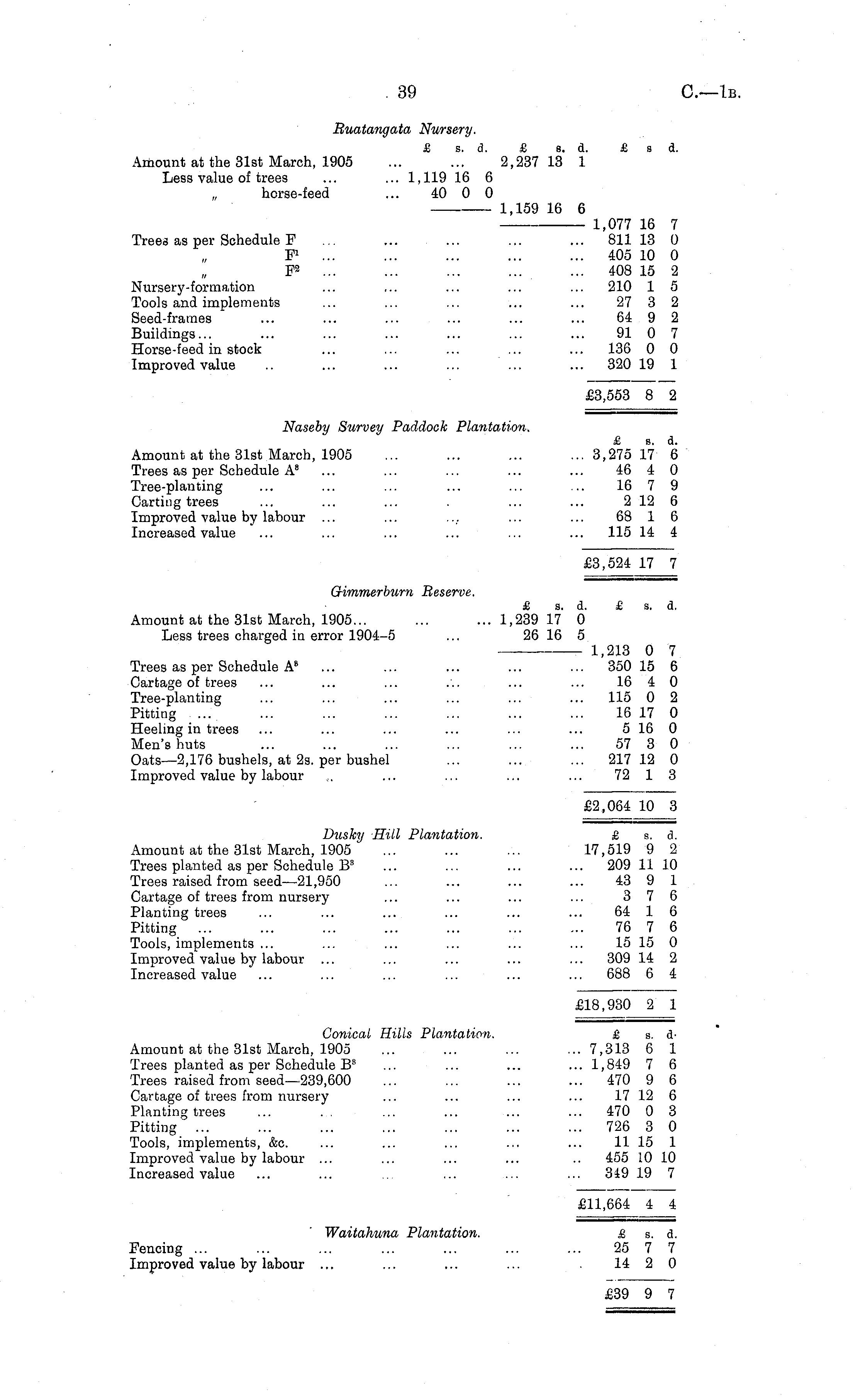 Ruatangata Nursery. £ s. d. £ s. d. £ s d. Amount at the 31st March, 1905 ... ... 2,237 13 1 Less value of trees ... ... 1,119 16 6 horse-feed ... 40 0 0 1,159 16 6 1,077 16 7 Trees as per Schedule F ~. ... ... ... ... 81113 0 F 1 ... ... ... ... ... 405 10 0 F 3 t ... 408 15 2 Nursery-formation ... ... ... ... ... 210 1 5 Tools and implements ... ... ... ... ... 27 3 2 Seed-frames ... ... ... ... ... ... 64 9 2 Buildings... ... ... ... ... ... ... 91 0 7 Horse-feed in stock ... ... ... ... ... 136 0 0 Improved value .. ... ... ... ... ... 320 19 1 £3,553 8 2 Naseby Survey Paddock Plantation. £ s. d. Amount at the 31st March, 1905 ... ... ... ... 3,275 17 6 Trees as per Schedule A 8 ... ... ... ... ... 46 4 0 Tree-planting ... ... ... ... ... ... 16 7 9 Carting trees ... ... ... . ... ... 2 12 6 Improved value by labour ... ... .... ... ... 68 1 6 Increased value ... ... ... ... ... ... 115 14 4 £3,524 17 7 Gimmerburn Reserve. £ s. d. £ s. d. Amount at the 31st March, 1905... ... ...1,239 17 0 Less trees charged in error 1904-5 ... 26 16 5 1,213 0 7 Trees as per Schedule A 8 ... ... ... ... ... 350 15 6 Cartage of trees ... ... ... ... ... ... 16 4 0 Tree-planting ... ... ... ... ... ... 115 0 2 Pitting ... ... ... ... ... ... ... 16 17 0 Heeling in trees ... ... ... ... ... ... 516 0 Men's huts ... ... ... ... ... ... 57 3 0 0at5—2,176 bushels, at 2s. per bushel ... ... ... 217 12 0 Improved value by labour ~ ... ... ... ... 72 1 3 £2,064 10 3 Dusky Hill Plantation. £ s. d. Amount at the 31st March, 1905 ... ... ... 17,519 9 2 Trees planted as per Schedule B 3 ... ... ... ... 209 1110 Trees raised from seed—2l,9so ... ... ... ... 43 9 1 Cartage of trees from nursery ... ... ... ... 376 Planting trees ... ... ... ... ... ... 64 1 6 Pitting ... ... ... ... ... ... ... 76 7 6 Tools, implements ... ... ... ... ... ... 15 15 0 Improved value by labour ... ... ... ... ... 309 14 2 Increased value ... ... ... ... ... ... 688 6 4 £18,930 2 1 Conical Hills Plantation. £ s. dAmount at the 31st March, 1905 ... ... ... ...7,313 6 1 Trees planted as per Schedule B s ... ... ... ... 1,849 7 6 Trees raised from 5eed—239,600 ... ... ... ... 470 9 6 Cartage of trees from nursery ... ... ... ... 17 12 6 Planting trees ... ... ... ... ... ... 470 0 3 Pitting ... ... ... ... ... ... ... 726 3 0 Tools, implements, &c. ... ... ... ... ... 11 15 1 Improved value by labour ... ... ... ... .. 455 10 10 Increased value ... ... ... ... ... ... 349 19 7 £11,664 4 4 Waitahuna Plantation. £ s. d. Fencing ... ... ... ... ... ... ... 25 7 7 Improved value by labour ... ... ... ... . 14 2 0 £39 9 7