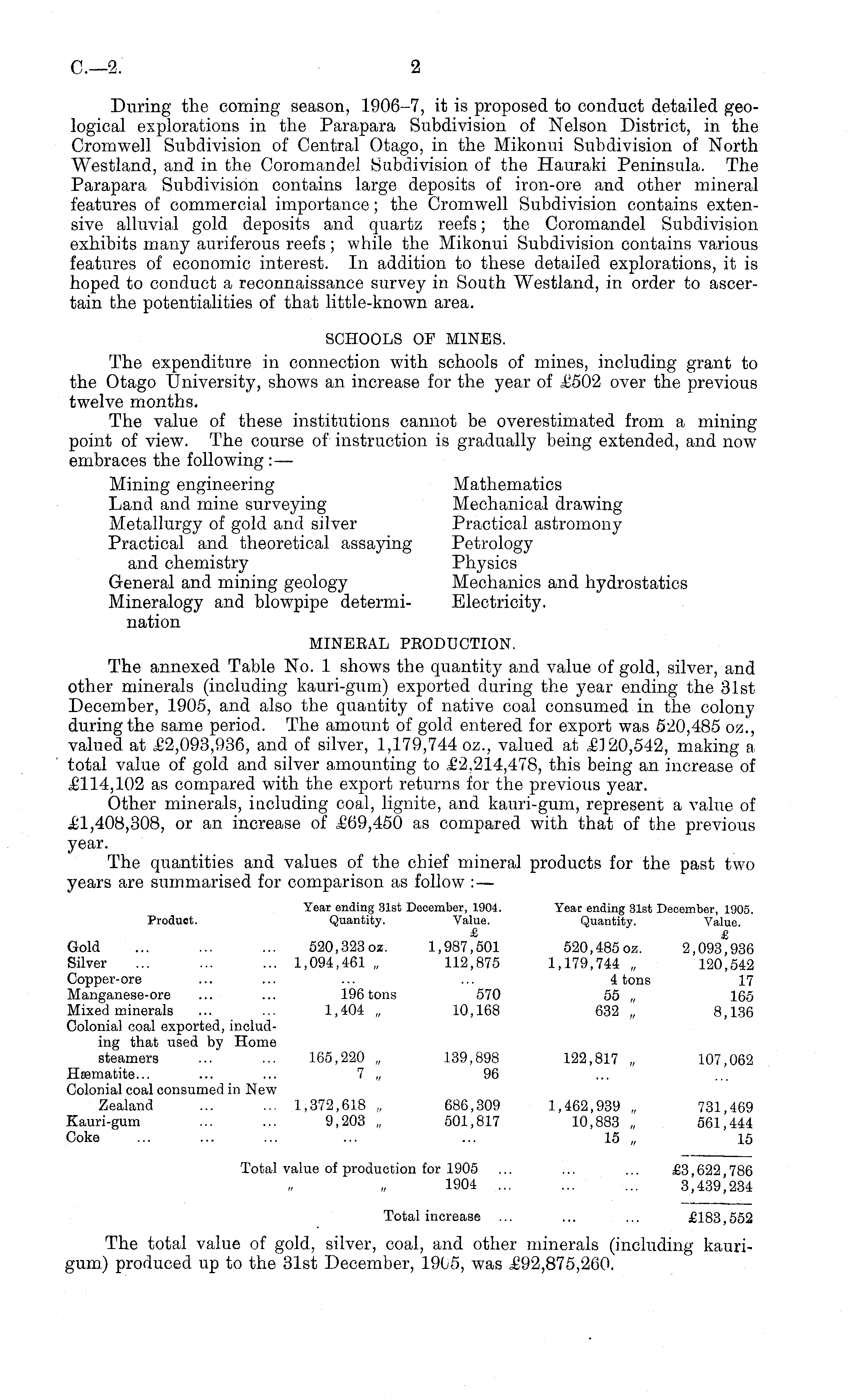 During the coming season, 1906-7, it is proposed to conduct detailed geological explorations in the Parapara Subdivision of Nelson District, in the Cromwell Subdivision of Central Otago, in the Mikonui Subdivision of North Westland, and in the Coromandel Subdivision of the Hauraki Peninsula. The Parapara Subdivision contains large deposits of iron-ore and other mineral features of commercial importance; the Cromwell Subdivision contains extensive alluvial gold deposits and quartz reefs; the Coromandel Subdivision exhibits many auriferous reefs; while the Mikonui Subdivision contains various features of economic interest. In addition to these detailed explorations, it is hoped to conduct a reconnaissance survey in South Westland, in order to ascertain the potentialities of that little-known area. SCHOOLS OP MINES. The expenditure in connection with schools of mines, including grant to the Otago University, shows an increase for the year of £502 over the previous twelve months. The value of these institutions cannot be overestimated from a miningpoint of view. The course of instruction is gradually being extended, and now embraces the following : — Mining engineering Mathematics Land and mine surveying Mechanical drawing Metallurgy of gold and silver Practical astromony Practical and theoretical assaying Petrology and chemistry Physics General and mining geology Mechanics and hydrostatics Mineralogy and blowpipe determi- Electricity, nation MINEEAL PEODUCTION. The annexed Table No. 1 shows the quantity and value of gold, silver, and other minerals (including kauri-gum) exported during the year ending the 31st December, 1905, and also the quantity of native coal consumed in the colony during the same period. The amount of gold entered for export was 520,485 oz., valued at £2,093,936, and of silver, 1,179,744 oz., valued at £120,542, making a total value of gold and silver amounting to £2,214,478, this being an increase of £114,102 as compared with the export returns for the previous year. Other minerals, including coal, lignite, and kauri-gum, represent a value of £1,408,308, or an increase of £69,450 as compared with that of the previous year. The quantities and values of the chief mineral products for the past two years are summarised for comparison as follow :— Year ending 31st December, 1904. Year ending 31st December, 1905. Product. Quantity. Value. Quantity. Value. £ £ Gold ... ... ... 520,323 oz. 1,987,501 520,485 oz. 2,093,936 Silver ... ... ... 1,094,461 „ 112,875 1,179,744 „ 120,542 Copper-ore ... ... ... ... 4 tons 17 Manganese-ore ... ... 196 tons 570 55 „ 165 Mixed minerals ... ... 1,404 „ 10,168 632 „ 8,136 Colonial coal exported, including that used by Home steamers ... ... 165,220 „ 139,898 122,817 „ 107,062 Haematite... ... ... 7 „ 96 Colonial coal consumed in New Zealand ... ... 1,372,618 „ 686,309 1,462,939 „ 731,469 Kauri-gum ... ... 9,203 „ 501,817 10,883 „ 561,444 Coke ... ... ... ... ... 15 „ 15 Total value of production for 1905 ... ... ... £3,622,786 1904 ... ... ... 3,439,234 Total increase ... ... ... £183,552 The total value of gold, silver, coal, and other minerals (including kaurigum) produced up to the 31st December, 1905, was £92,875,260.