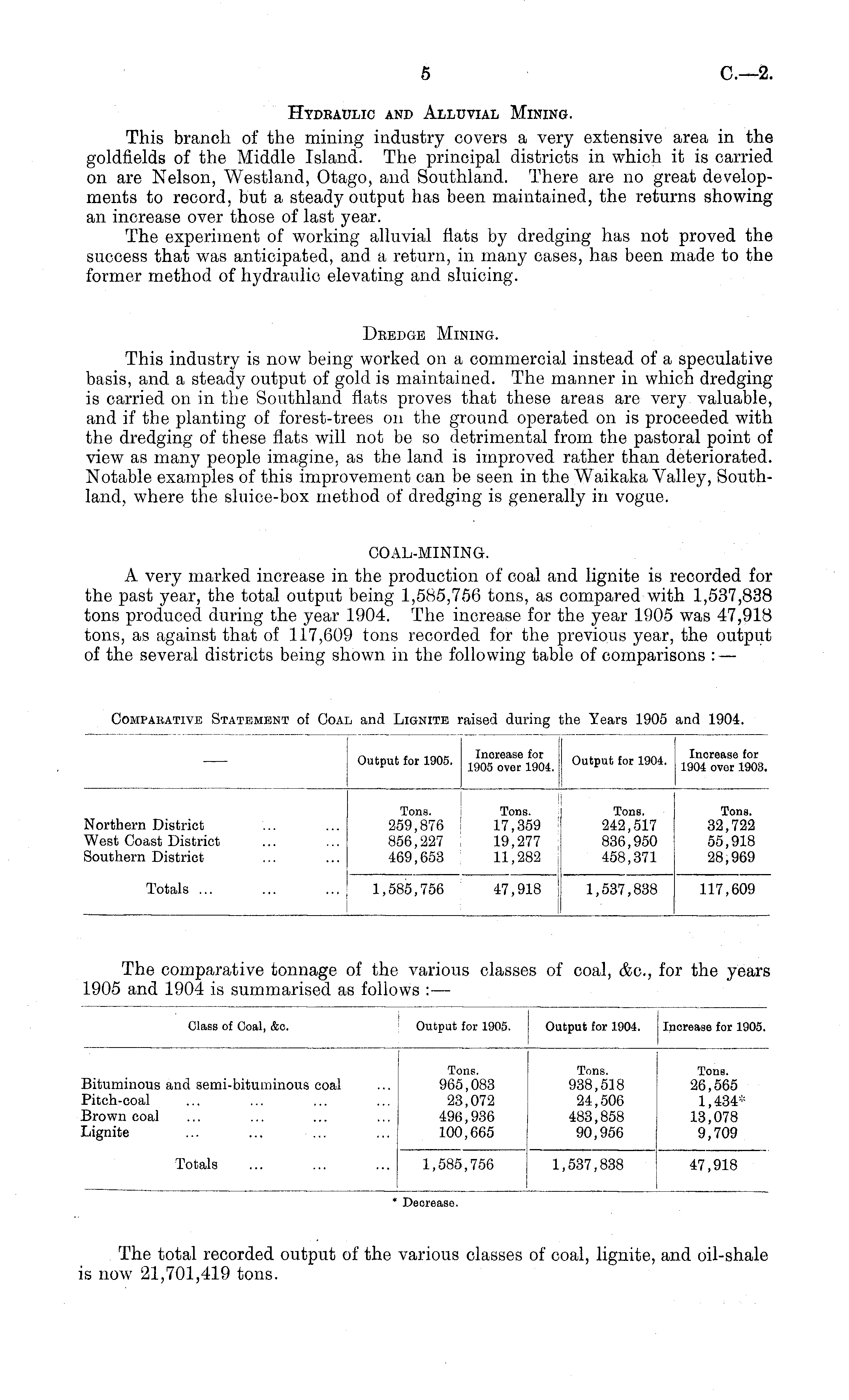 Hydraulic and Alluvial Mining. This branch of the mining industry covers a very extensive area in the goldfields of the Middle Island. The principal districts in which it is carried on are Nelson, Westland, Otago, and Southland. There are no great developments to record, but a steady output has been maintained, the returns showing an increase over those of last year. The experiment of working alluvial flats by dredging has not proved the success that was anticipated, and a return, in many cases, has been made to the former method of hydraulic elevating and sluicing. Dredge Mining. This industry is now being worked on a commercial instead of a speculative basis, and a steady output of gold is maintained. The manner in which dredging is carried on in the Southland flats proves that these areas are very valuable, and if the planting of forest-trees on the ground operated on is proceeded with the dredging of these flats will not be so detrimental from the pastoral point of view as many people imagine, as the land is improved rather than deteriorated. Notable examples of this improvement can be seen in the Waikaka Valley, Southland, where the sluice-box method of dredging is generally in vogue. COAL-MINING. A very marked increase in the production of coal and lignite is recorded for the past year, the total output being 1,585,756 tons, as compared with 1,537,838 tons produced during the year 1904. The increase for the year 1905 was 47,918 tons, as against that of 117,609 tons recorded for the previous year, the output of the several districts being shown in the following table of comparisons :—•