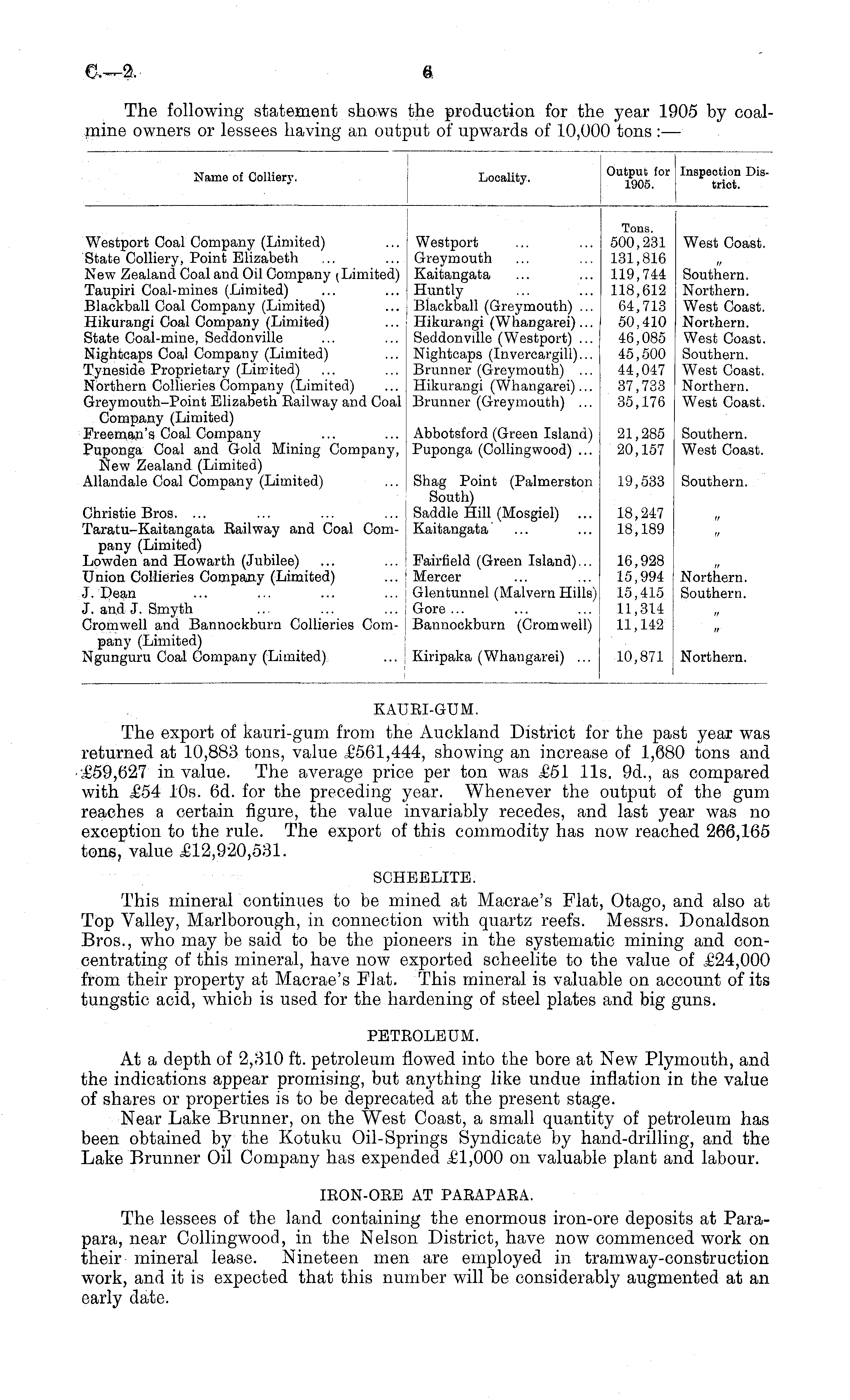 Name of Colliery. Locality. Output for 1905. Inspection District. Westport Coal Company (Limited) State Colliery, Point Elizabeth New Zealand Coal and Oil Company (Limited) Taupiri Coal-mines (Limited) Blackball Coal Company (Limited) Hikurangi Coal Company (Limited) State Coal-mine, Seddonville Nightcaps Coal Company (Limited) Tyneside Proprietary (Limited) Northern Collieries Company (Limited) Greymouth-Point Elizabeth Railway and Coal Company (Limited) Freeman's Coal Company Puponga Coal and Gold Mining Company, New Zealand (Limited) Allandale Coal Company (Limited) Westport Greymouth Kaitangata Huntly Blackball (Greymouth) ... Hikurangi (Whangarei)... Seddonville (Westport) ... Nightcaps (Invercargill)... Brunner (Greymouth) ... Hikurangi (Whangarei)... Brunner (Greymouth) ... Tons. 500,231 131,816 119,744 118,612 64,713 50,410 46,085 45,500 44,047 37,733 35,176 West Coast. //■ Southern. Northern. West Coast. Northern. West Coast. Southern. West Coast. Northern. West Coast. Abbotsford (Green Island) Puponga (Collingwood) ... 21,285 20,157 Southern. West Coast. Shag Point (Palmerston South) Saddle Hill (Mosgiel) ... Kaitangata 19,533 Southern. Christie Bros. ... Taratu-Kaitangata Railway and Coal Company (Limited) Lowden and Howarth (Jubilee) Union Collieries Company (Limited) J. Dean J. and J. Smyth Cromwell and Bannockburn Collieries Company (Limited) Ngunguru Coal Company (Limited) 18,247 18,189 n it Fairfield (Green Island)... Mercer Glentunnel (Malvern Hills) Gore ... Bannockburn (Cromwell) 16,928 15,994 15,415 11,314 11,142 Northern. Southern. n a Kiripaka (Whangarei) ... 10,871 Northern.