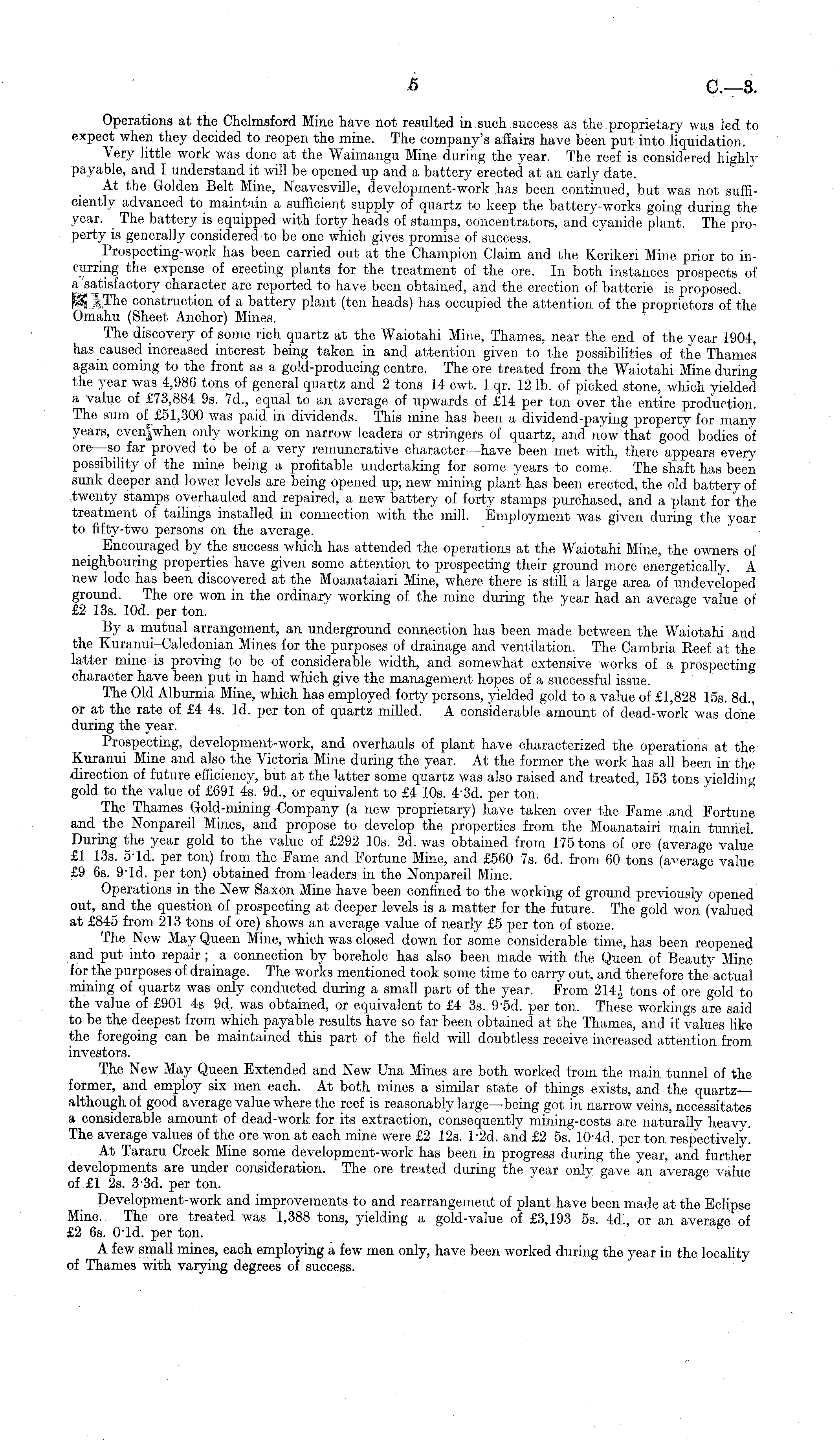 Operations at the Chelmsford Mine have not resulted in such success as the proprietary was led to expect when they decided to reopen the mine. The company's affairs have been put into liquidation. Very little work was done at the Waimangu Mine during the year. The reef is considered highly payable, and I understand it will be opened up and a battery erected at an early date. At the Golden Belt Mine, Neavesville, development-work has been continued, but was not sufficiently advanced to maintain a sufficient supply of quartz to keep the battery-works going during the year. The battery is equipped with forty heads of stamps, concentrators, and cyanide plant. The property is generally considered to be one which gives promise of success. Prospecting-work has been carried out at the Champion Claim and the Kerikeri Mine prior to incurring the expense of erecting plants for the treatment of the ore. In both instances prospects of a "satisfactory character are reported to have been obtained, and the erection of batterie is proposed. pA ', The construction of a battery plant (ten heads) has occupied the attention of the proprietors of the Omahu (Sheet Anchor) Mines. The discovery of some rich quartz at the Waiotahi Mine, Thames, near the end of the year 1904, has caused increased interest being taken in and attention given to the possibilities of the Thames again coming to the front as a gold-producing centre. The ore treated from the Waiotahi Mine during the year was 4,986 tons of general quartz and 2 tons 14 cwt. 1 qr. 12 lb. of picked stone, which yielded a value of £73,884 9s. 7c1., equal to an average of upwards of £14 per ton over the entire production. The sum of £51,300 was paid in dividends. This mine has been a dividend-paying property for many years, only working on narrow leaders or stringers of quartz, and now that good bodies of ore —so far proved to be of a very remunerative character—have been met with, there appears every possibility of the mine being a profitable undertaking for some years to come. The shaft has been sunk deeper and lower levels are being opened up, new mining plant has been erected, the old battery of twenty stamps overhauled and repaired, a new battery of forty stamps purchased, and a plant for the treatment of tailings installed in connection with the mill. Employment was given during the year to fifty-two persons on the average. Encouraged by the success which has attended the operations at the Waiotahi Mine, the owners of neighbouring properties have given some attention to prospecting their ground more energetically. A new lode has been discovered at the Moanataiari Mine, where there is still a large area of undeveloped ground. The ore won in the ordinary working of the mine during the year had an average value of £2 13s. lOd. per ton. By a mutual arrangement, an underground connection has been made between the Waiotahi and the Kuranui-Caledonian Mines for the purposes of drainage and ventilation. The Cambria Eeef at the latter mine is proving to be of considerable width, and somewhat extensive works of a prospecting character have been put in hand which give the management hopes of a successful issue. The Old Alburnia Mine, which has employed forty persons, yielded gold to a value of £1,828 15s. Bd., or at the rate of £4 4s. Id. per ton of quartz milled. A considerable amount of dead-work was done during the year. Prospecting, development-work, and overhauls of plant have characterized the operations at the Kuranui Mine and also the Victoria Mine during the year. At the former the work has all been in the direction of future efficiency, but at the latter some quartz was also raised and treated, 153 tons yielding gold to the value of £691 4s. 9d., or equivalent to £4 10s. 4'3d. per ton. The Thames Gold-mining Company (a new proprietary) have taken over the Fame and Fortune and the Nonpareil Mines, and propose to develop the properties from the Moanatairi main tunnel. During the year gold to the value of £292 10s. 2d. was obtained from 175 tons of ore (average value £1 13s. 5Td. per ton) from the Fame and Fortune Mine, and £560 7s. 6d. from 60 tons (average value £9 6s. 9Td. per ton) obtained from leaders in the Nonpareil Mine. Operations in the New Saxon Mine have been confined to the working of ground previously opened out, and the question of prospecting at deeper levels is a matter for the future. The gold won (valued at £845 from 213 tons of ore) shows an average value of nearly £5 per ton of stone. The New May Queen Mine, which was closed down for some considerable time, has been reopened and put into repair ; a connection by borehole has also been made with the Queen of Beauty Mine for the purposes of drainage. The works mentioned took some time to carry out, and therefore the actual mining of quartz was only conducted during a small part of the year. From 214 J tons of ore gold to the value of £901 4s 9d. was obtained, or equivalent to £4 3s. 9-sd. per ton. These workings are said to be the deepest from which payable results have so far been obtained at the Thames, and if values like the foregoing can be maintained this part of the field will doubtless receive increased attention from investors. The New May Queen Extended and New Una Mines are both worked from the main tunnel of the former, and employ six men each. At both mines a similar state of things exists, and the quartz— although of good average value where the reef is reasonably large—being got in narrow veins, necessitates a considerable amount of dead-work for its extraction, consequently mining-costs are naturally heavy. The average values of the ore won at each mine were £2 12s. l'2d. and £2 ss. 10'4d. per ton respectively. At Tararu Creek Mine some development-work has been in progress during the year, and further developments are under consideration. The ore treated during the year only gave an average value of £1 2s. 3-3 d. per ton. Development-work and impro
