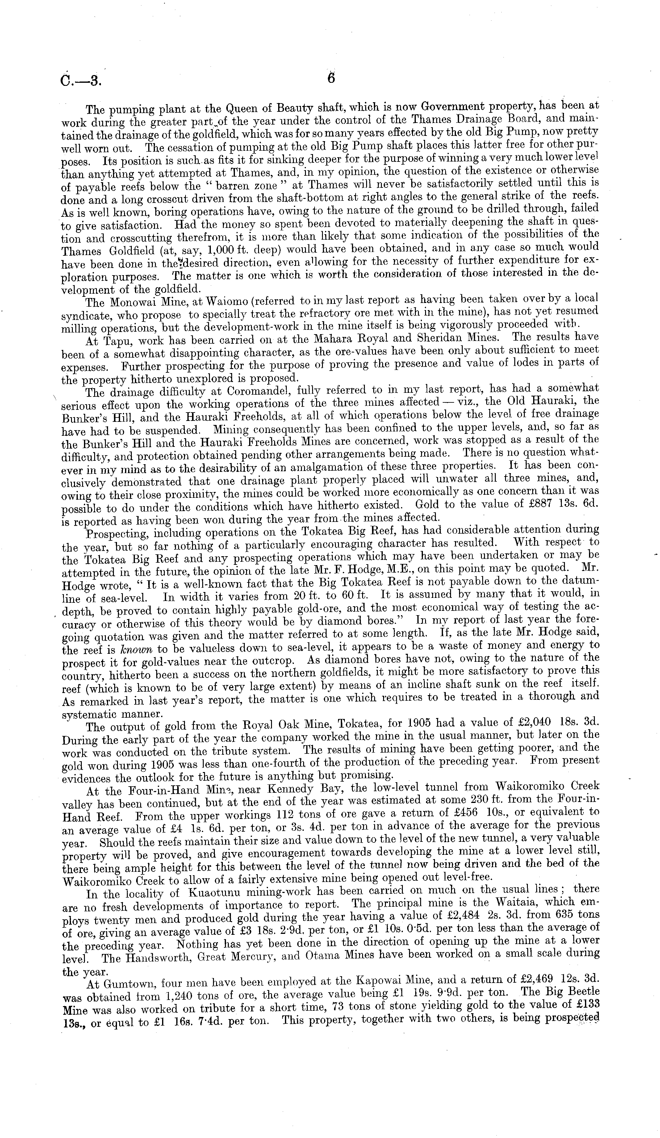 The pumping plant at the Queen of Beauty shaft, which is now Government property, has been at work during the greater part .of the year under the control of the Thames Drainage Board, and maintained the drainage of the goldfield, which was for so many years effected by the old Big Pump, now pretty well worn out. The cessation of pumping at the old Big Pump shaft places this latter free for other purposes. Its position is such, as fits it for sinking deeper for the purpose of winning a very much lower level than anything yet attempted at Thames, and, in my opinion, the question of the existence or otherwise of payable reefs below the " barren zone " at Thames will never be satisfactorily settled until this is done and a long crosscut driven from the shaft-bottom at right angles to the general strike of the reefs. As is well known, boring operations have, owing to the nature of the ground to be drilled through, failed to give satisfaction. Had the money so spent been devoted to materially deepening the shaft in question and crosscutting therefrom, it is more than likely that some indication of the possibilities of the Thames Goldfield (at, say, 1,000 ft. deep) would have been obtained, and in any case so much would have been done in theVdesired direction, even a'lowing for the necessity of further expenditure for exploration purposes. The matter is one which is worth the consideration of those interested m the development of the goldfield. The Monowai Mine, at Waiomo (referred to in my last report as having been taken over by a local syndicate, who propose to specially treat the refractory ore met with in the mine), has not yet resumed milling operations, but the development-work in the mine itself is being vigorously proceeded with. At Tapu, work has been carried on at the Mahara Royal and Sheridan Mines. The results have been of a somewhat disappointing character, as the ore-values have been only about sufficient to meet expenses. Further prospecting for the purpose of proving the presence and value of lodes in parts of the property hitherto unexplored is proposed. The drainage difficulty at Coromandel, fully referred to in my last report, has had a somewhat serious effect upon the working operations of the three mines affected — viz., the Old Hauraki, the Bunker's Hill, and the Hauraki Freeholds, at all of which operations below the level, of free drainage have had to be suspended. Mining consequently has been confined to the upper levels, and, so far as the Bunker's Hill and the Hauraki Freeholds Mines are concerned, work was stopped as a result of the difficulty, and protection obtained pending other arrangements being made. There is no question whatever in my mind as to the desirability of an amalgamation of these three properties. It has been conclusively "demonstrated that one drainage plant properly placed will unwater all three mines, and, owing to their close proximity, the mines could be worked more economically as one concern than it was possible to do under the conditions which have hitherto existed. Gold to the value of £887 13s. 6d. is reported as having been won during the year from the mines affected. Prospecting, including operations on the Tokatea Big Reef, has had considerable attention during the year, but so far nothing of a particularly encouraging character has resulted. With respect to the Tokatea Big Reef and any prospecting operations which may have been undertaken or may be attempted in the future, the opinion of the late Mr. F. Hodge, M.E., on this point may be quoted. Mr. Hodge wrote " It is a well-known fact that the Big Tokatea Reef is not payable down to the datumline of sea-level. In width it varies from 20 ft. to 60 ft. It is assumed by many that it would, in depth be proved to contain highly payable gold-ore, and the most economical way of testing the accuracy or otherwise of this theory would be by diamond bores." In my report of last year the foregoing' quotation was given and the matter referred to at some length. If, as the late Mr. Hodge said, the reef is known to be valueless down to sea-level, it appears to be a waste of money and energy to prospect it for gold-values near the outcrop. As diamond bores have not, owing to the nature of the country hitherto been a success on the northern goldfields, it might be more satisfactory to prove this reef (which is known to be of very large extent) by means of an incline shaft sunk on the reef itself. As remarked in last year's report, the matter is one which requires to be treated m a thorough and systematic manner. , „„,„ ~ „, ' The output of gold from the Royal Oak Mine, Tokatea, for 1905 had a value of £2,040 18s. 3d. During the early part of the year the company worked the mine in the usual manner, but later on the work was conducted on the tribute system. The results of mining have been getting poorer, and the gold won during 1905 was less than one-fourth of the production of the preceding year. Irom present evidences the outlook for the future is anything but promising. At the Four-in-Hand Mm% near Kennedy Bay, the low-level tunnel from Waikoronuko Creek valley has been continued, but at the end of the year was estimated at some 230 ft, from the Four-m-Hand Reef From the upper workings 112 tons of ore gave a return of £456 10s., or equivalent to an average value of £4 Is. 6d. per ton, or 3s. 4d. per ton in advance of the average for the previous year Should the reefs maintain their size and value down to the level of the new tunnel, a very valuable property will be proved, and give encouragement towards developing the mine at a lower level still, there being ample height for this between the level of the tunnel now being driven and the bed of the Waikoromiko Creek to allow of a fairly extensive mine being opened out level-free. In the locality of Kuaotunu mining-work has been carried on much on the usual lines ; there are no fresh developments of importance to report. The principal min