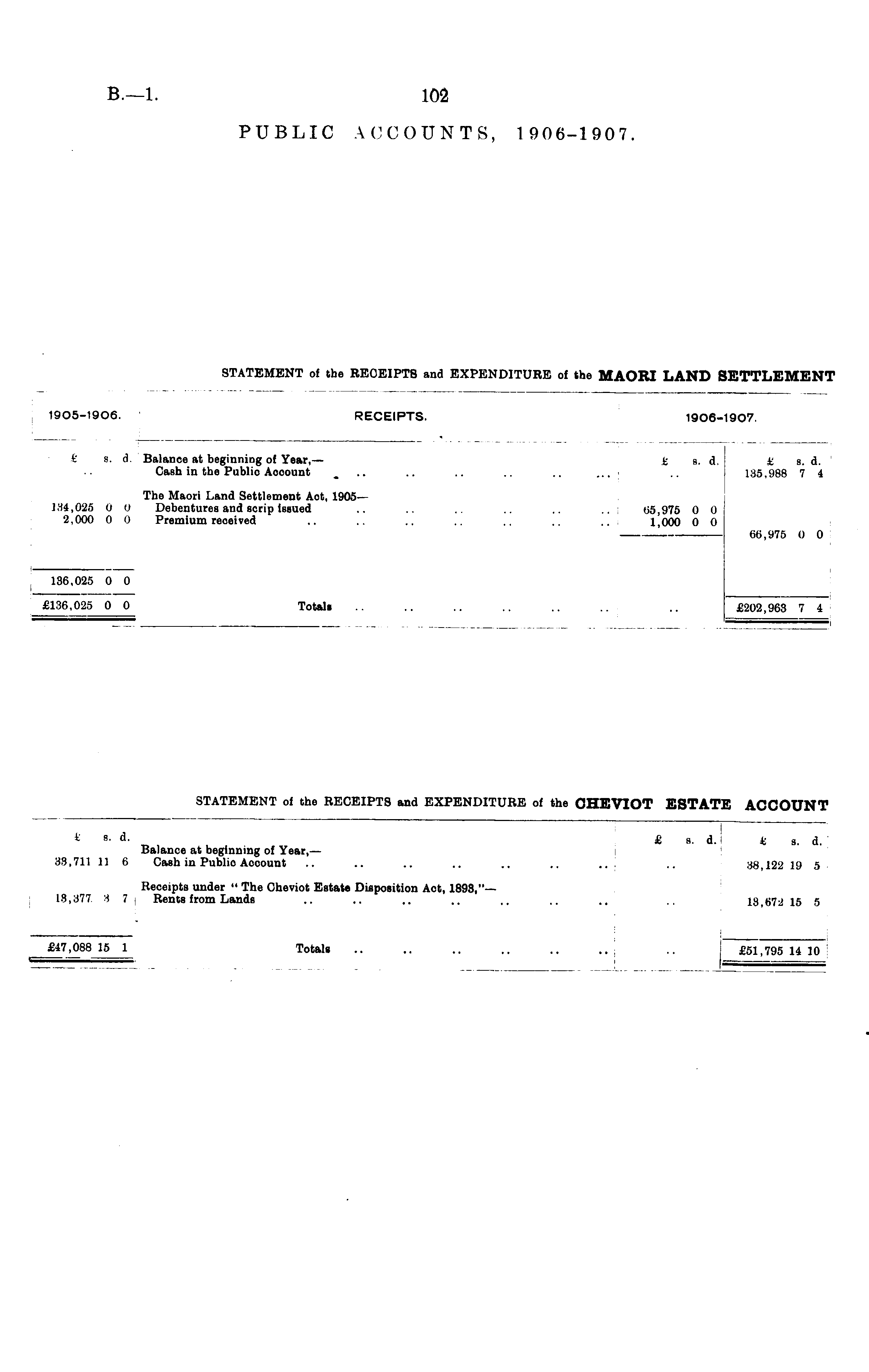 t s. d. Balance at beginning of Year, — 33,711 11 6 Cash in Public Aooount £ s. d. ' k a. d. 38,122 19 5 Receipts under " The Cheviot Estate Disposition Aot, 1898,"— 18,377. 8 7 Rente from Lands 18,672 15 5 £47,088 15 1 Totals £47,088 15 1 •• I £51,795 U 10