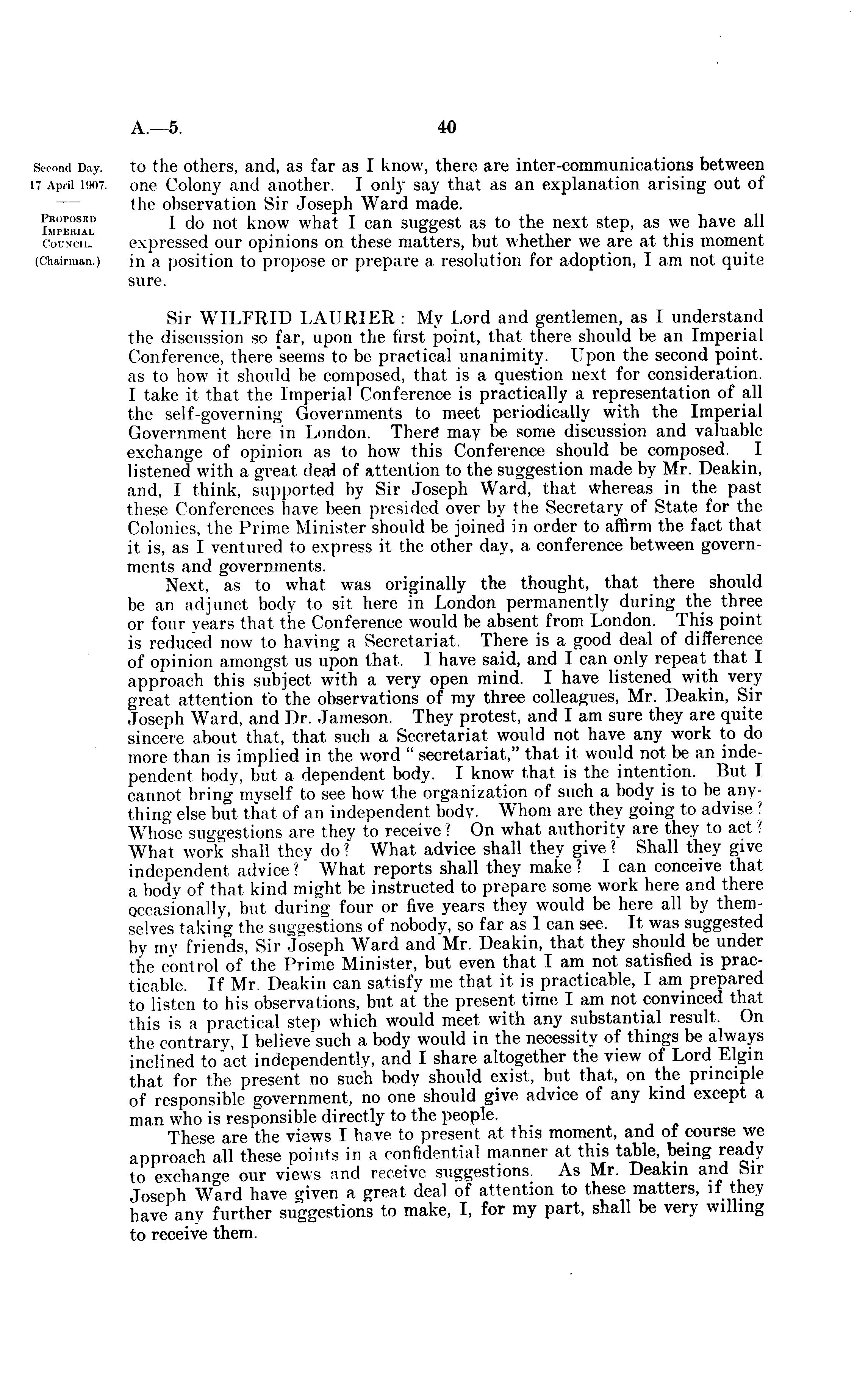 to the others, and, as far as I know, there are inter-communications between one Colony and another. I only say that as an explanation arising out of the observation Sir Joseph Ward made. 1 do not know what I can suggest as to the next step, as we have all expressed our opinions on these matters, but whether we are at this moment in a position to propose or prepare a resolution for adoption, I am not quite sure. Sir WILFRID LAURIER : My Lord and gentlemen, as I understand the discussion so far, upon the first point, that there should be an Imperial Conference, there seems to be practical unanimity. Upon the second point, as to how it should be composed, that is a question next for consideration. I take it that the Imperial Conference is practically a representation of all the self-governing Governments to meet periodically with the Imperial Government here in London. There* may be some discussion and valuable exchange of opinion as to how this Conference should be composed. I listened with a great deal of attention to the suggestion made by Mr. Deakin, and, I think, supported by Sir Joseph Ward, that Whereas in the past these Conferences have been presided over by the Secretary of State for the Colonies, the Prime Minister should be joined in order to affirm the fact that it is, as I ventured to express it the other day, a conference between governments and governments. Next, as to what was originally the thought, that there should be an adjunct body to sit here in London permanently during the three or four years that the Conference would be absent from London. This point is reduced now to having a Secretariat. There is a good deal of difference of opinion amongst us upon that, I have said, and I can only repeat that I approach this subject with a very open mind. I have listened with very great attention to the observations of my three colleagues, Mr. Deakin, Sir Joseph Ward, and Dr. Jameson. They protest, and lam sure they are quite sincere about that, that such a Secretariat would not have any work to do more than is implied in the word " secretariat," that it would not be an independent body, but a dependent body. I know that is the intention. But I cannot bring myself to see how the organization of such a body is to be anything else but that of an independent body. Whom are they going to advise ! Whose suggestions are they to receive? On what authority are they to act '. What work shall they do ? What advice shall they give ? Shall they give independent advice '. ' What reports shall they make ? I can conceive that a body of that kind might be instructed to prepare some work here and there occasionally, but during four or five years they would be here all by themselves taking the suggestions of nobody, so far as 1 can see. It was suggested by my friends, Sir Joseph Ward and Mr. Deakin, that they should be under the control of the Prime Minister, but even that I am not satisfied is practicable. If Mr. Deakin can satisfy me that it is practicable, lam prepared to listen to his observations, but at the present time I am not convinced that this is a practical step which would meet with any substantial result. On the contrary, I believe"such a body would in the necessity of things be always inclined to "act independently, and I share altogether the view of Lord Elgin that for the present no such body should exist, but that, on the principle of responsible government, no one should give advice of any kind except a man who is responsible directly to the people. These are the views I have to present at this moment, and of course we approach all these points in a confidential manner at this table, being ready to exchange our views and receive suggestions. As Mr. Deakin and Sir Joseph Ward have given a great deal of attention to these matters, if they have any further suggestions to make, I, for my part, shall be very willing to receive them.