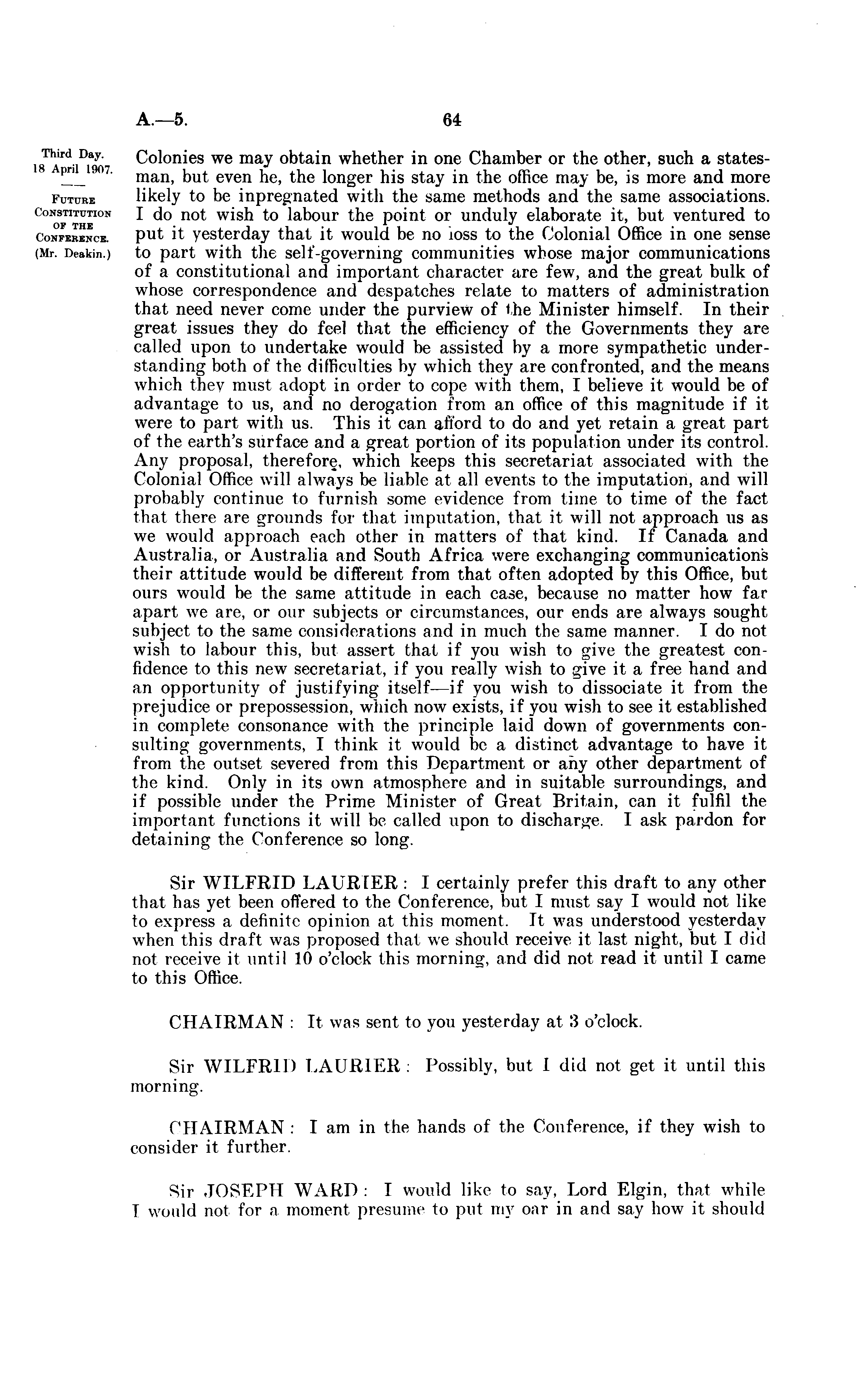 Colonies we may obtain whether in one Chamber or the other, such a statesman, but even he, the longer his stay in the office may be, is more and more likely to be inpregnated with the same methods and the same associations. I do not wish to labour the point or unduly elaborate it, but ventured to put it yesterday that it would be no ioss to the Colonial Office in one sense to part with the self-governing communities whose major communications of a constitutional and important character are few, and the great bulk of whose correspondence and despatches relate to matters of administration that need never come under the purview of the Minister himself. In their great issues they do feel that the efficiency of the Governments they are called upon to undertake would be assisted by a more sympathetic understanding both of the difficulties by which they are confronted, and the means which they must adopt in order to cope with them, I believe it would be of advantage to us, and no derogation from an office of this magnitude if it were to part with us. This it can afford to do and yet retain a great part of the earth's surface and a great portion of its population under its control. Any proposal, therefore, which keeps this secretariat associated with the Colonial Office will always be liable at all events to the imputation, and will probably continue to furnish some evidence from time to time of the fact that there are grounds for that imputation, that it will not approach us as we would approach each other in matters of that kind. If Canada and Australia, or Australia and South Africa were exchanging communication's their attitude would be different from that often adopted by this Office, but ours would be the same attitude in each case, because no matter how far apart we are, or our subjects or circumstances, our ends are always sought subject to the same considerations and in much the same manner. Ido not wish to labour this, but assert that if you wish to give the greatest confidence to this new secretariat, if you really wish to give it a free hand and an opportunity of justifying itself—if you wish to dissociate it from the prejudice or prepossession, which now exists, if you wish to see it established in complete consonance with the principle laid down of governments consulting governments, I think it would be a distinct advantage to have it from the outset severed from this Department or any other department of the kind. Only in its own atmosphere and in suitable surroundings, and if possible under the Prime Minister of Great Britain, can it fulfil the important functions it will be called upon to discharge. I ask pardon for detaining the Conference so long. Sir WILFRID LAURIER : I certainly prefer this draft to any other that has yet been offered to the Conference, but I must say I would not like to express a definite opinion at this moment. It was understood yesterday when this draft was proposed that we should receive it last night, but I did not receive it until 10 o'clock this morning, and did not read it until I came to this Office. CHAIRMAN : It was sent to you yesterday at 3 o'clock. Sir WILFRID LAURIER : Possibly, but I did not get it until this morning. CHAIRMAN : I am in the hands of the Conference, if they wish to consider it further. Sir JOSEPH WARD : I would like to say, Lord Elgin, that while I would not for a moment presume to put my oar in and say how it should