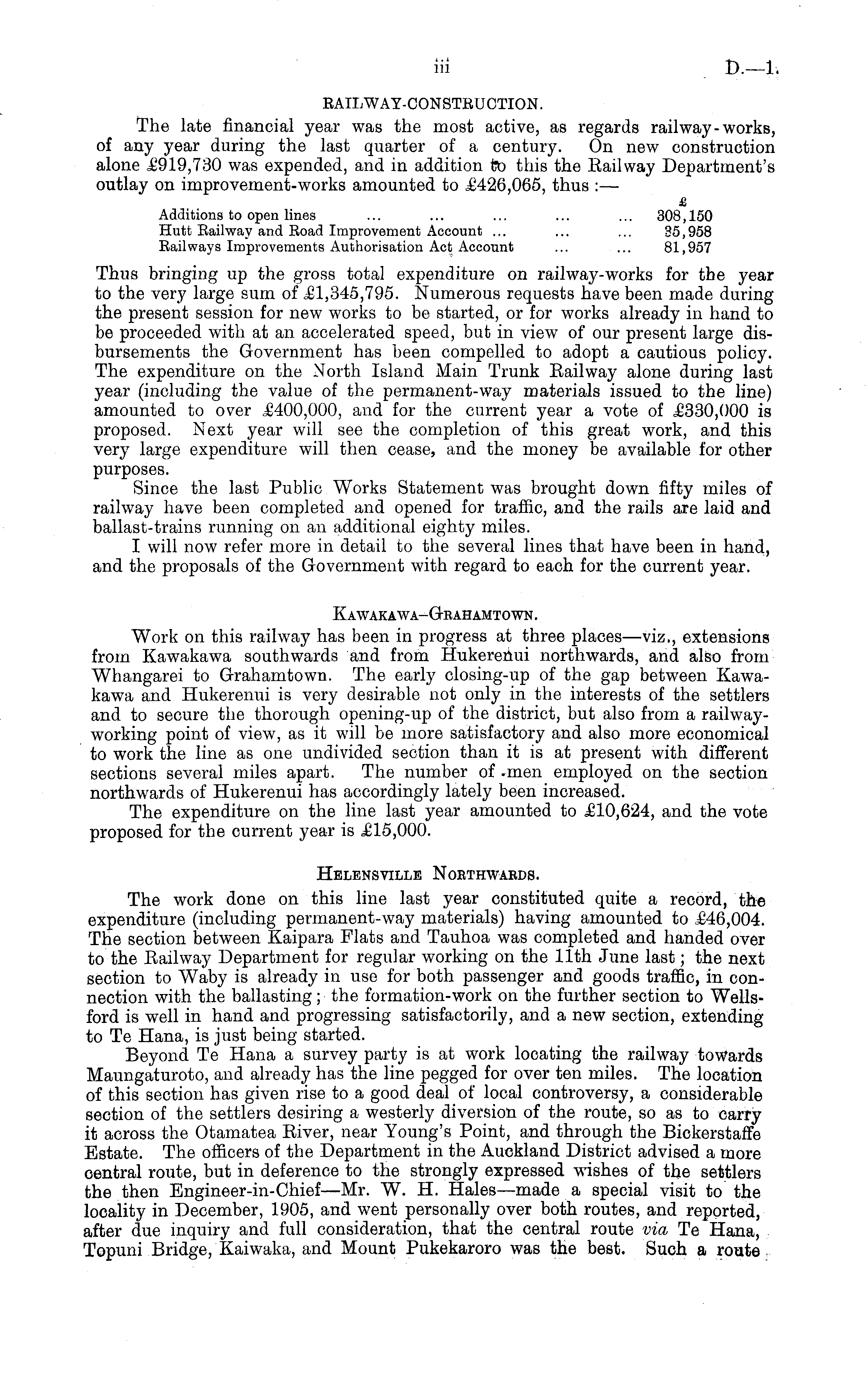 EAILWAY-CONSTRUCTION. The late financial year was the most active, as regards railway - works, of any year during the last quarter of a century. On new construction alone £919,730 was expended, and in addition to this the Kailway Department's outlay on improvement-works amounted to £426,065, thus : — £ Additions to open lines ... ... ... ... ... 308,150 Hutt Eailway and Eoad Improvement Account ... ... ... 35,958 Railways Improvements Authorisation Act Account ... ... 81,957 Thus bringing up the gross total expenditure on railway-works for the year to the very large sum of £1,345,795. Numerous requests have been made during the present session for new works to be started, or for works already in hand to be proceeded with at an accelerated speed, but in view of our present large disbursements the Government has been compelled to adopt a cautious policy. The expenditure on the North Island Main Trunk Eailway alone during last year (including the value of the permanent-way materials issued to the line) amounted to over £400,000, and for the current year a vote of £330,000 is proposed. Next year will see the completion of this great work, and this very large expenditure will then cease, and the money be available for other purposes. Since the last Public Works Statement was brought down fifty miles of railway have been completed and opened for traffic, and the rails are laid and ballast-trains running on an additional eighty miles. I will now refer more in detail to the several lines that have been in hand, and the proposals of the Government with regard to each for the current year. Kawakawa-Geahamtown. Work on this railway has been in progress at three places—viz., extensions from Kawakawa southwards and from Hukerenui northwards, and also from Whangarei to Grahamtown. The early closing-up of the gap between Kawakawa and Hukerenui is very desirable not only in the interests of the settlers and to secure the thorough opening-up of the district, but also from a railwayworking point of view, as it will be more satisfactory and also more economical to work the line as one undivided section than it is at present with different sections several miles apart. The number of .men employed on the section northwards of Hukerenui has accordingly lately been increased. The expenditure on the line last year amounted to £10,624, and the vote proposed for the current year is £15,000. Helensville Nobthwards. The work done on this line last year constituted quite a record, the expenditure (including permanent-way materials) having amounted to £46,004. The section between Kaipara Flats and Tauhoa was completed and handed over to the Eailway Department for regular working on the 11th June last; the next section to Waby is already in use for both passenger and goods traffic, in connection with the ballasting; the formation-work on the further section to Wellsford is well in hand and progressing satisfactorily, and a new section, extending to Te Hana, is just being started. Beyond Te Hana a survey party is at work locating the railway towards Maungaturoto, and already has the line pegged for over ten miles. The location of this section has given rise to a good deal of local controversy, a considerable section of the settlers desiring a westerly diversion of the route, so as to carry it across the Otamatea Eiver, near Young's Point, and through the Bickerstaffe Estate. The officers of the Department in the Auckland District advised a more central route, but in deference to the strongly expressed wishes of the settlers the then Engineer-in-Chief—Mr. W. H. Hales —made a special visit to the locality in December, 1905, and went personally over both routes, and reported, after due inquiry and full consideration, that the central route via Te Hana, Topuni Bridge, Kaiwaka, and Mount Pukekaroro was the best. Such a route