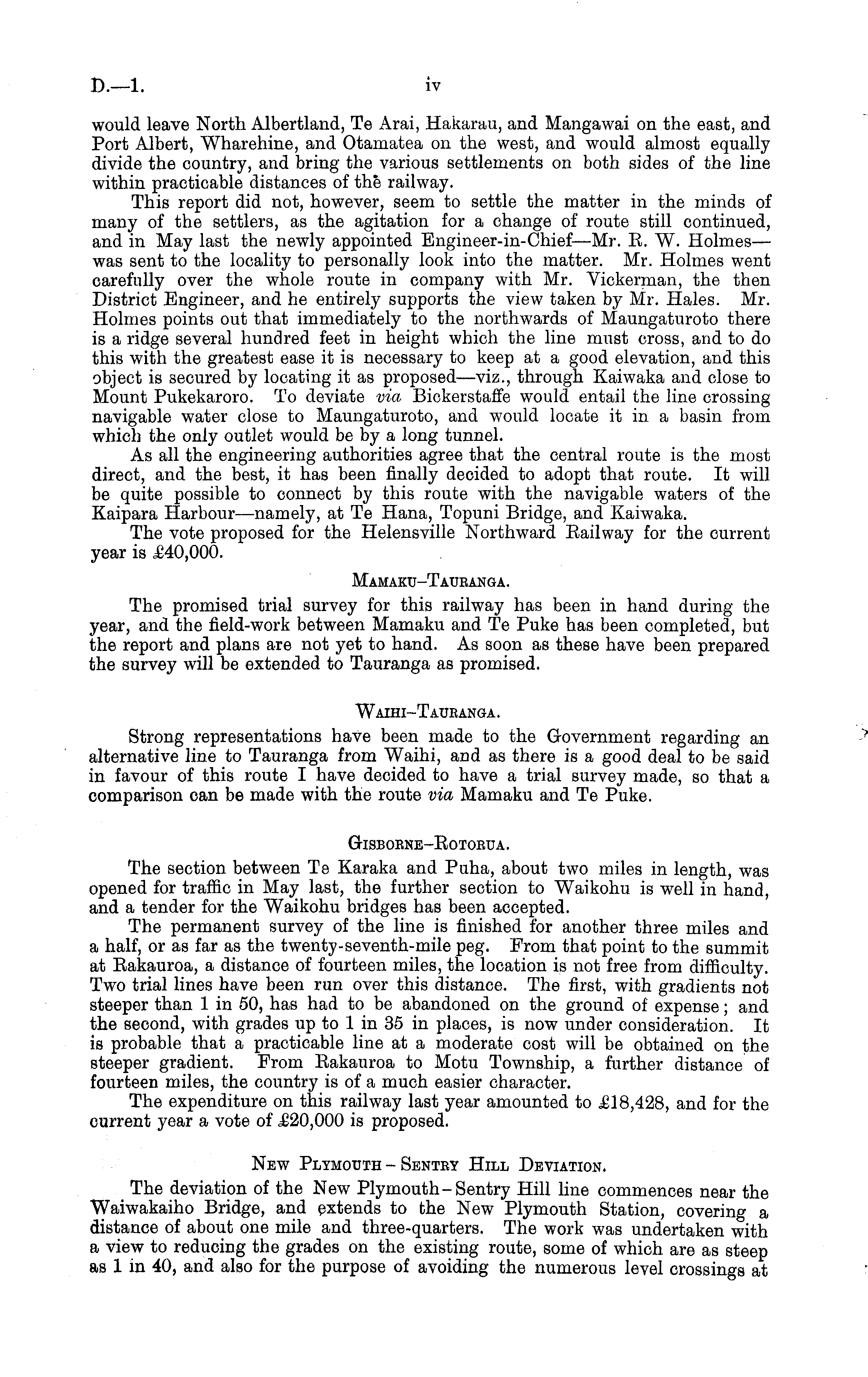 would leave North Albertland, Te Arai, Hakarau, and Mangawai on the east, and Port Albert, Wharehine, and Otamatea on the west, and would almost equally divide the country, and bring the various settlements on both sides of the line within practicable distances of the railway. This report did not, however, seem to settle the matter in the minds of many of the settlers, as the agitation for a change of route still continued, and in May last the newly appointed Engineer-in-Chief—Mr. E. W. Holmes— was sent to the locality to personally look into the matter. Mr. Holmes went carefully over the whole route in company with Mr. Yickerman, the then District Engineer, and he entirely supports the view taken by Mr. Hales. Mr. Holmes points out that immediately to the northwards of Maungaturoto there is a ridge several hundred feet in height which the line must cross, and to do this with the greatest ease it is necessary to keep at a good elevation, and this object is secured by locating it as proposed—viz., through Kaiwaka and close to Mount Pukekaroro. To deviate via Bickerstaffe would entail the line crossing navigable water close to Maungaturoto, and would locate it in a basin from which the only outlet would be by a long tunnel. As all the engineering authorities agree that the central route is the most direct, and the best, it has been finally decided to adopt that route. It will be quite possible to connect by this route with the navigable waters of the Kaipara Harbour —namely, at Te Hana, Topuni Bridge, and Kaiwaka. The vote proposed for the Helensville Northward Eailway for the current year is ,£40,000. Mamaku-Taueanga. The promised trial survey for this railway has been in hand during the year, and the field-work between Mamaku and Te Puke has been completed, but the report and plans are not yet to hand. As soon as these have been prepared the survey will be extended to Tauranga as promised. Waihi-T aueanga . Strong representations have been made to the Government regarding an alternative line to Tauranga from Waihi, and as there is a good deal to be said in favour of this route I have decided to have a trial survey made, so that a comparison can be made with the route via Mamaku and Te Puke. GISBORNE-EoTOEUA. The section between Te Karaka and Puha, about two miles in length, was opened for traffic in May last, the further section to Waikohu is well in hand, and a tender for the Waikohu bridges has been accepted. The permanent survey of the line is finished for another three miles and a half, or as far as the twenty-seventh-mile peg. From that point to the summit at Eakauroa, a distance of fourteen miles, the location is not free from difficulty. Two trial lines have been run over this distance. The first, with gradients not steeper than lin 50, has had to be abandoned on the ground of expense; and the second, with grades up to lin3s in places, is now under consideration. It is probable that a practicable line at a moderate cost will be obtained on the steeper gradient. From Eakauroa to Motu Township, a further distance of fourteen miles, the country is of a much easier character. The expenditure on this railway last year amounted to £18,428, and for the current year a vote of £20,000 is proposed. New Plymouth - Sentey Hill Deviation. The deviation of the New Plymouth-Sentry Hill line commences near the Waiwakaiho Bridge, and extends to the New Plymouth Station, covering a distance of about one mile and three-quarters. The work was undertaken with a view to reducing the grades on the existing route, some of which are as steep as 1 in 40, and also for the purpose of avoiding the numerous level crossings at