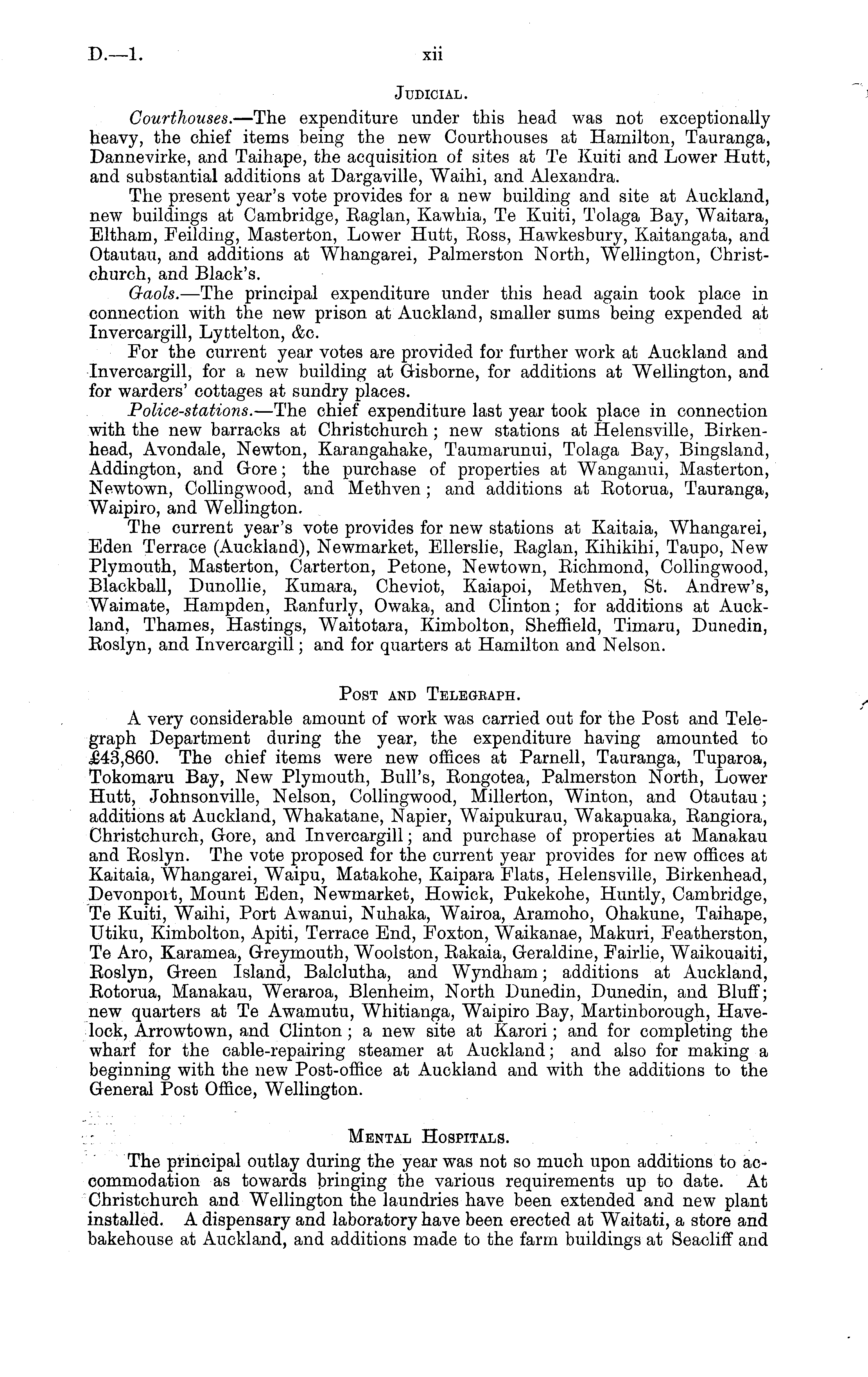 Judicial. Courthouses. —The expenditure under this head was not exceptionally heavy, the chief items being the new Courthouses at Hamilton, Tauranga, Dannevirke, and Taihape, the acquisition of sites at Te Kuiti and Lower Hutt, and substantial additions at Dargaville, Waihi, and Alexandra. The present year's vote provides for a new building and site at Auckland, new buildings at Cambridge, Raglan, Kawhia, Te Kuiti, Tolaga Bay, Waitara, Eltham, Feilding, Masterton, Lower Hutt, Ross, Hawkesbury, Kaitangata, and Otautau, and additions at Whangarei, Palmerston North, Wellington, Christchurch, and Black's. Gaols. —The principal expenditure under this head again took place in connection with the new prison at Auckland, smaller sums being expended at Invercargill, Lyttelton, &c. For the current year votes are provided for further work at Auckland and Invercargill, for a new building at Gisborne, for additions at Wellington, and for warders' cottages at sundry places. Police-stations. —The chief expenditure last year took place in connection with the new barracks at Christchurch ; new stations at Helensville, Birkenhead, Avondale, Newton, Karangahake, Taumarunui, Tolaga Bay, Bingsland, Addington, and Gore; the purchase of properties at Wanganui, Masterton, Newtown, Collingwood, and Methven; and additions at Rotorua, Tauranga, Waipiro, and Wellington. The current year's vote provides for new stations at Kaitaia, Whangarei, Eden Terrace (Auckland), Newmarket, Ellerslie, Raglan, Kihikihi, Taupo, New Plymouth, Masterton, Carterton, Petone, Newtown, Richmond, Collingwood, Blackball, Dunollie, Kumara, Cheviot, Kaiapoi, Methven, St. Andrew's, Waimate, Hampden, Ranfurly, Owaka, and Clinton; for additions at Auckland, Thames, Hastings, Waitotara, Kimbolton, Sheffield, Timaru, Dunedin, Roslyn, and Invercargill; and for quarters at Hamilton and Nelson. Post and Telegraph. A very considerable amount of work was carried out for the Post and Telegraph Department during the year, the expenditure having amounted to j£43,860. The chief items were new offices at Parnell, Tauranga, Tuparoa, Tokomaru Bay, New Plymouth, Bull's, Rongotea, Palmerston North, Lower Hutt, Johnsonville, Nelson, Collingwood, Millerton, Winton, and Otautau; additions at Auckland, Whakatane, Napier, Waipukurau, Wakapuaka, Rangiora, Christchurch, Gore, and Invercargill; and purchase of properties at Manakau and Roslyn. The vote proposed for the current year provides for new offices at Kaitaia, Whangarei, Waipu, Matakohe, Kaipara Flats, Helensville, Birkenhead, Devonport, Mount Eden, Newmarket, Howick, Pukekohe, Huntly, Cambridge, Te Kuiti, Waihi, Port Awanui, Nuhaka, Wairoa, Aramoho, Ohakune, Taihape, Utiku, Kimbolton, Apiti, Terrace End, Foxton, Waikanae, Makuri, Featherston, Te Aro, Karamea, Greymouth, Woolston, Rakaia, Geraldine, Fairlie, Waikouaiti, Roslyn, Green Island, Balclutha, and Wyndham; additions at Auckland, Rotorua, Manakau, Weraroa, Blenheim, North Dunedin, Dunedin, and Bluff; new quarters at Te Awamutu, Whitianga, Waipiro Bay, Martinborough, Havelock, Arrowtown, and Clinton ; a new site at Karori; and for completing the wharf for the cable-repairing steamer at Auckland; and also for making a beginning with the new Post-office at Auckland and with the additions to the General Post Office, Wellington. Mental Hospitals. The principal outlay during the year was not so much upon additions to accommodation as towards bringing the various requirements up to date. At Christchurch and Wellington the laundries have been extended and new plant installed. A dispensary and laboratory have been erected at Waitati, a store and bakehouse at Auckland, and additions made to the farm buildings at Seacliff and
