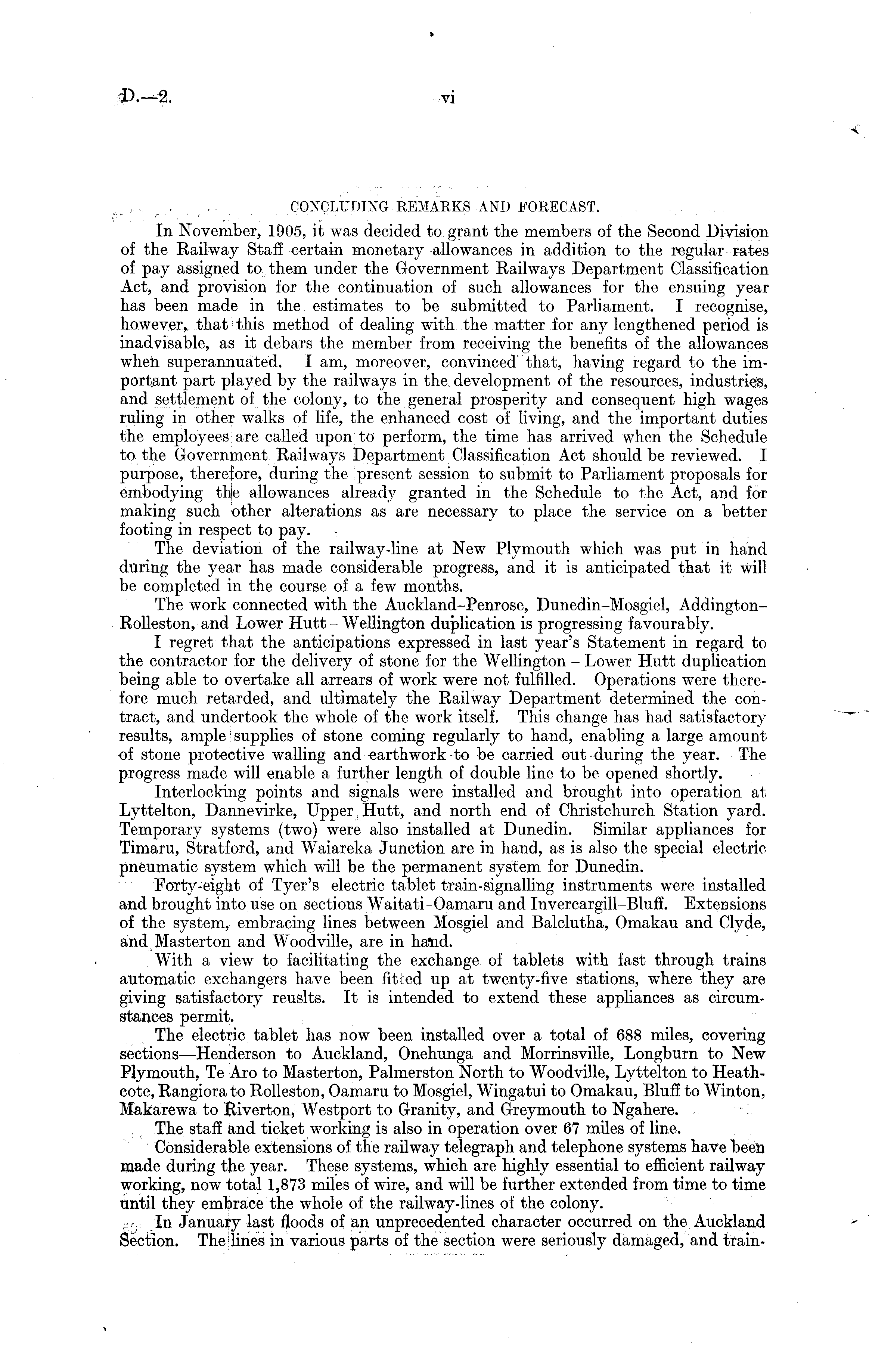 . . , CONCLUDING REMARKS AND FORECAST. In November, 1905, it was decided to grant the members of the Second Division of the Railway Staff certain monetary allowances in addition to the regular rates of pay assigned to them under the Government Railways Department Classification Act, and provision for the continuation of such allowances for the ensuing year has been made in the estimates to be submitted to Parliament. I recognise, however, that this method of dealing with the matter for any lengthened period is inadvisable, as it debars the member from receiving the benefits of the allowances when superannuated. I am, moreover, convinced that, having regard to the important part played by the railways in the development of the resources, industries, and settlement of the colony, to the general prosperity and consequent high wages ruling in other walks of life, the enhanced cost of living, and the important duties the employees are called upon to perform, the time has arrived when the Schedule to the Government Railways Department Classification Act should be reviewed. I purpose, therefore, during the present session to submit to Parliament proposals for embodying the allowances already granted in the Schedule to the Act, and for making such other alterations as are necessary to place the service on a better footing in respect to pay. The deviation of the railway-line at New Plymouth which was put in hand during the year has made considerable progress, and it is anticipated that it will be completed in the course of a few months. The work connected with the Auckland-Penrose, Dunedin-Mosgiel, AddingtonRolleston, and Lower Hutt - Wellington duplication is progressing favourably. I regret that the anticipations expressed in last year's Statement in regard to the contractor for the delivery of stone for the Wellington - Lower Hutt duplication being able to overtake all arrears of work were not fulfilled. Operations were therefore much retarded, and ultimately the Railway Department determined the contract, and undertook the whole of the work itself. This change has had satisfactory results, ample '■ supplies of stone coming regularly to hand, enabling a large amount of stone protective walling and earthwork to be carried out during the year. The progress made will enable a further length of double line to be opened shortly. Interlocking points and signals were installed and brought into operation at Lyttelton, Dannevirke, Upper Hutt, and north end of Christchurch Station yard. Temporary systems (two) were also installed at Dunedin. Similar appliances for Timaru, Stratford, and Waiareka Junction are in hand, as is also the special electric pneumatic system which will be the permanent system for Dunedin. Forty-eight of Tyer's electric tablet train-signalling instruments were installed and brought into use on sections Waitati Oamaru and Invercargill Bluff. Extensions of the system, embracing lines between Mosgiel and Balclutha, Omakau and Clyde, and Masterton and Woodville, are in hand. With a view to facilitating the exchange of tablets with fast through trains automatic exchangers have been fitted up at twenty-five stations, where they are giving satisfactory reuslts. It is intended to extend these appliances as circumstances permit. The electric tablet has now been installed over a total of 688 miles, covering sections—Henderson to Auckland, Onehunga and Morrinsville, Longburn to New Plymouth, Te Aro to Masterton, Palmerston North to Woodville, Lyttelton to Heathcote, Rangiora to Rolleston, Oamaru to Mosgiel, Wingatui to Omakau, Bluff to Winton, Makarewa to Riverton, Westport to Granity, and Greymouth to Ngahere. The staff and ticket working is also in operation over 67 miles of line. Considerable extensions of the railway telegraph and telephone systems have been made during the year. These systems, which are highly essential to efficient railway working, now total 1,873 miles of wire, and will be further extended from time to time until they embrace the whole of the railway-lines of the colony. In January last floods of an unprecedented character occurred on the Auckland Section. The lines in various parts of the section were seriously damaged, and train-