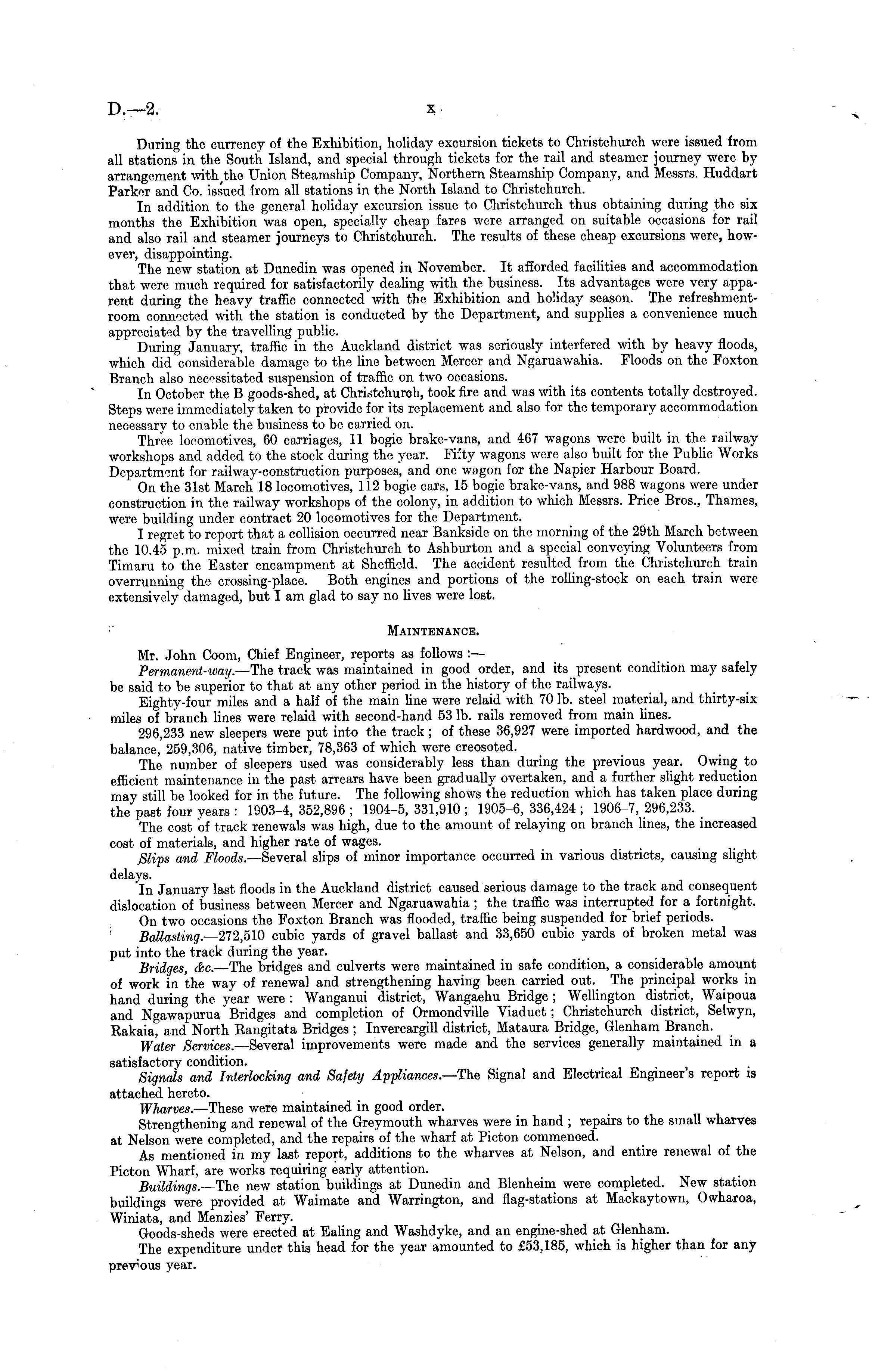 During the currency of the Exhibition, holiday excursion tickets to Christchurch were issued from all stations in the South Island, and special through tickets for the rail and steamer journey were by arrangement Union Steamship Company, Northern Steamship Company, and Messrs. Huddart Parker and Co. issued from all stations in the North Island to Christchurch. In addition to the general holiday excursion issue to Christchurch thus obtaining during the six months the Exhibition was open, specially cheap fares were arranged on suitable occasions for rail and also rail and steamer journeys to Christchurch. The results of these cheap excursions were, however, disappointing. The new station at Dunedin was opened in November. It afforded facilities and accommodation that were much required for satisfactorily dealing with the business. Its advantages were very apparent during the heavy traffic connected with the Exhibition and holiday season. The refreshmentroom connected with the station is conducted by the Department, and supplies a convenience much appreciated by the travelling public. During January, traffic in the Auckland district was seriously interfered with by heavy floods, which did considerable damage to the line between Mercer and Ngaruawahia. Floods on the Foxton Branch also necessitated suspension of traffic on two occasions. In October the B goods-shed, at ChrLstchurcb, took fire and was with its contents totally destroyed. Steps were immediately taken to provide for its replacement and also for the temporary accommodation necessary to enable the business to be carried on. Three locomotives, 60 carriages, 11 bogie brake-vans, and 467 wagons were built in the railway workshops and added to the stock during the year. Fifty wagons were also built for the Public Works Department for railway-construction purposes, and one wagon for the Napier Harbour Board. On the 31st March 18 locomotives, 112 bogie cars, 15 bogie brake-vans, and 988 wagons were under construction in the railway workshops of the colony, in addition to which Messrs. Price Bros., Thames, were building under contract 20 locomotives for the Department. I regret to report that a collision occurred near Bankside on the morning of the 29th March between the 10.45 p.m. mixed train from Christchurch to Ashburton and a special conveying Volunteers from Timaru to the Easter encampment at Sheffield. The accident resulted from the Christchurch train overrunning the crossing-place. Both engines and portions of the rolling-stock on each train were extensively damaged, but I am glad to say no lives were lost. Maintenance. Mr. John Coom, Chief Engineer, reports as follows : — Permanent-way.— The track was maintained in good order, and its present condition may safely be said to be superior to that at any other period in the history of the railways. Eighty-four miles and a half of the main line were relaid with 70 lb. steel material, and thirty-six miles of branch lines were relaid with second-hand 53 lb. rails removed from main lines. 296,233 new sleepers were put into the track ; of these 36,927 were imported hardwood, and the balance, 259,306, native timber, 78,363 of which were creosoted. The number of sleepers used was considerably less than during the previous year. Owing to efficient maintenance in the past arrears have been gradually overtaken, and a further slight reduction may still be looked for in the future. The following shows the reduction which has taken place during the past four years : 1903-4, 352,896 ; 1904-5, 331,910 ; 1905-6, 336,424 ; 1906-7, 296,233. The cost of track renewals was high, due to the amount of relaying on branch lines, the increased cost of materials, and higher rate of wages. .Slips and Floods. —Several slips of minor importance occurred in various districts, causing slight delays. In January last floods in the Auckland district caused serious damage to the track and consequent dislocation of business between Mercer and Ngaruawahia ; the traffic was interrupted for a fortnight. On two occasions the Foxton Branch was flooded, traffic being suspended for brief periods. Ballasting.—2l2,slo cubic yards of gravel ballast and 33,650 cubic yards of broken metal was put into the track during the year. Bridges, &c. —The bridges and culverts were maintained in safe condition, a considerable amount of work in the way of renewal and strengthening having been carried out. The principal works in hand during the year were : Wanganui district, Wangaehu Bridge ; Wellington district, Waipoua and Ngawapurua Bridges and completion of Ormondville Viaduct; Christchurch district, Selwyn, Rakaia, and North Rangitata Bridges ; Invercargill district, Mataura Bridge, Glenham Branch. Water Services. —Several improvements were made and the services generally maintained in a satisfactory condition. _ | Signals and Interlocking and Safety Appliances.—The Signal and Electrical Engineer s report is attached hereto. Wharves. —These were maintained in good order. Strengthening and renewal of the Greymouth wharves were in hand ; repairs to the small wharves at Nelson were completed, and the repairs of the wharf at Picton commenced. As mentioned in my last report, additions to the wharves at Nelson, and entire renewal of the Picton Wharf, are works requiring early attention. Buildings. —The new station buildings at Dunedin and Blenheim were completed. New station buildings were provided at Waimate and Warrington, and flag-stations at Mackaytown, Owharoa, Winiata, and Menzies' Ferry. Goods-sheds were erected at Ealing and Washdyke, and an engine-shed at Glenham. The expenditure under this head for the year amounted to £53,185, which is higher than for any previous year.