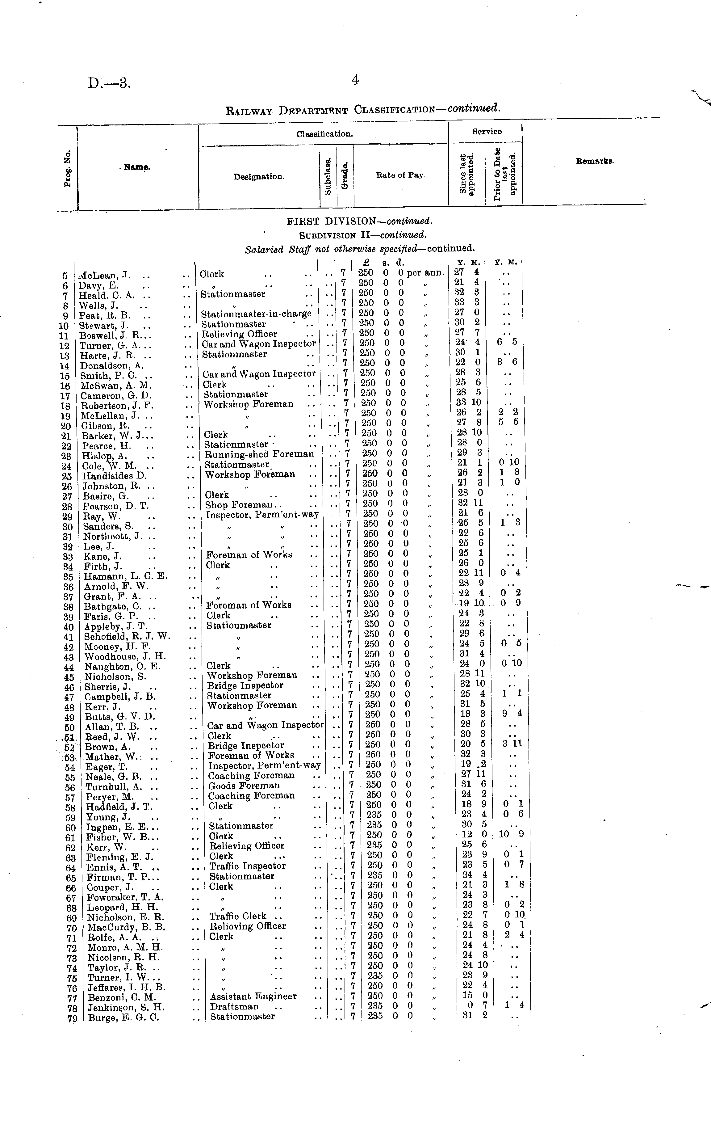 Classification. Service 6 ojb o Name. Designation. 1 co Cd n-J CO Cfl r, tH Si Q 03 Ratio of Pay. CD Sg PS • •9 si-s •»& | §* Remarks. FIRST D _VII SION— continued. SUBD] >IVI BIOl n II— continued. 5 . 6 7 8 9 10 11 12 13 14 15 16 17 18 19 20 21 22 23 24 25 26 27 28 29 30 31 32 33 34 35 36 37 38 39 40 41 42 43 44 45 46 47 48 49 50 51 52 53 54 55 56 57 58 59 60 61 62 63 64 65 66 67 68 69 70 71 72 73 74 75 76 77 78 79 McLean, J. Davy, E. Heald, 0. A. .. Wells, J. Peat, R. B. Stewart, J. Boswell, J. R... Turner, G. A. .. Harte, J. R. Donaldson, A. Smith, P.O. .. McSwan, A. M. Cameron, G. D. Robertson, J. F. McLellan, J. .. Gibson, R. Barker, W. J... Pearce, H. Hislop, A. Cole, W. M. .. Handisides D. Johnston, R. .. Basire, G. Pearson, D. T. Ray, W. Sanders, S. Nortlicott, J. .. Lee, J. Kane, J. Firth, J. Hamann, L. C. E. Arnold, F. W. Grant, P. A. .. Bathgate, 0. .. Faris, G. P. .. Appleby, J. T. Schofield, R. J. W. Mooney, H. F. Woodhouse, J. H. Naughton, O. E. Nicholson, S. Sherris, J. Campbell, J. B. Kerr, J. Butts, G. V. D. Allan, T. B. .. Reed, J. W. .. Brown, A. Mather, W. Eager, T. Neale, G. B. Turnbull, A. .. Peryer, M. Hadfield, J. T. Young, J. Ingpen, E. E... Fisher, W. B... Kerr, W. Fleming, E. J. Ennis, A. T. .. Firman, T. P... Couper, J. Foweraker, T. A. Leopard, H. H. Nicholson, E. R. MacCurdy, B. B. Rolfe, A. A. Monro, A. M. H. Nicolson, R. H. Taylor, J. R. Turner, I. W. .. , Jeffares, I. H. B. Benzoni, 0. M. I Jenkinson, S. H. i Burge, E. G. C. .. i :: Salaried Staff no Clerk .. .. Stationmaster Stationmaster-in-charge Stationmaster ' .. Relieving Officer Car and Wagon Inspector Stationmaster Car and Wagon Inspector Clerk Stationmaster Workshop Foreman Clerk Stationmaster i Running-shed Foreman Stationmaster Workshop Foreman Clerk Shop Foreman Inspector, Perm'ent-way Foreman of Works Clerk " Foreman of Works Clerk Stationmaster iot " othe 7 7 7 7 7 7 7 7 7 7 7 7 7 7 7 7 7 7 7 7 7 7 ■ 7 ! 7 7 7 7 7 7 7 7 7 7 7 7 7 7 7 7 7 7 7 7 7 7 7 7 , 7 , 7 . 7 . 7 . 7 . 7 . 7 . 7 . 7 . 7 . 7 . 7 . 7 . 7 . 7 . 7 . 7 . 7 . 7 . 7 . 7 . 7 . 7 . 7 . 7 . 7 . 7 trwise specified —conti £ s. d. 250 0 0 per ann. 250 0 0 250 0 0 250 0 0 250 0 0 250 0 0 250 0 0 250 0 0 250 0 0 250 0 0 250 0 0 250 0 0 250 0 0 250 0 0 250 0 0 250 0 0 250 0 0 250 0 0 250 0 0 250 0 0 250 0 0 250 0 0 250 0 0 250 0 0 250 0 0 250 0 0 250 0 0 250 0 0 250 0 0 250 0 0 250 0 0 250 0 0 250 0 0 250 0 0 ' 250 0 0 ' 250 0 0 ' 250 0 0 ' 250 0 0 ' 250 0 0 r 250 0 0 r 250 0 0 r 250 0 0 f 250 0 0 ■ 250 0 0 I 250 0 0 r 250 0 0 7 250 0 0 7 250 0 0 7 250 0 0 J 250 0 0 7 250 0 0 7 250 0 0 7 250 0 0 7 250 0 0 7 235 0 0 7 235 0 0 7 250 0 0 7 235 0 0 7 250 0 0 7 250 0 0 7 235 0 0 7 250 0 0 7 250 0 0 7 250 0 0 7 250 0 0 7 250 0 0 7 250 0 0 7 250 0 0 7 250 0 0 7 250 0 0 7 235 0 0 7 250 0 0 7 250 0 0 7 235 0 0 7 235 0 0 inued. Y. M. 27 4 21 4 32 3 33 3 27 0 30 2 27 7 24 4 : 30 l j 22 0 i 28 3 25 6 I 28 5 33 10 26 2 | 27 8 28 10 28 0 29 3 21 1 26 2 21 3 I 28 0 32 11 21 6 •25 5 22 6 25 6 25 1 26 0 22 11 28 9 22 4 19 10 24 8 22 8 29 6 24 5 31 4 24 0 28 11 32 10 25 4 31 5 18 3 28 5 30 3 20 5 32 3 19 .2 27 11 31 6 24 2 18 9 23 4 30 5 12 0 25 6 23 9 23 5 24 4 21 3 24 3 23 8 22 7 24 8 21 8 24 4 24 8 24 10 23 9 22 4 15 0 0 7 31 2 Y. M, .. 6 3 8"c 2"2 5 5 0 10 1 8 1 0 1*8 o"4 o"2 0 9 o"5 o'io Clerk Workshop Foreman Bridge Inspector Stationmaster Workshop Foreman i"i 9"4 Car and Wagon Inspector Clerk Bridge Inspector Foreman of Works Inspeotor, Perm'ent-way Coaching Foreman Goods Foreman Coaching Foreman Clerk 3'il o"i 0 6 i Stationmaster Clerk Relieving Officer Clerk Traffic Inspector Stationmaster Clerk io"o o"i 0 7 i"s ! Traffic Clerk Relieving Officer , Clerk 0 2 0 10 0 1 2 4 , Assistant Engineer . Draftsman . Stationmaster 1 4