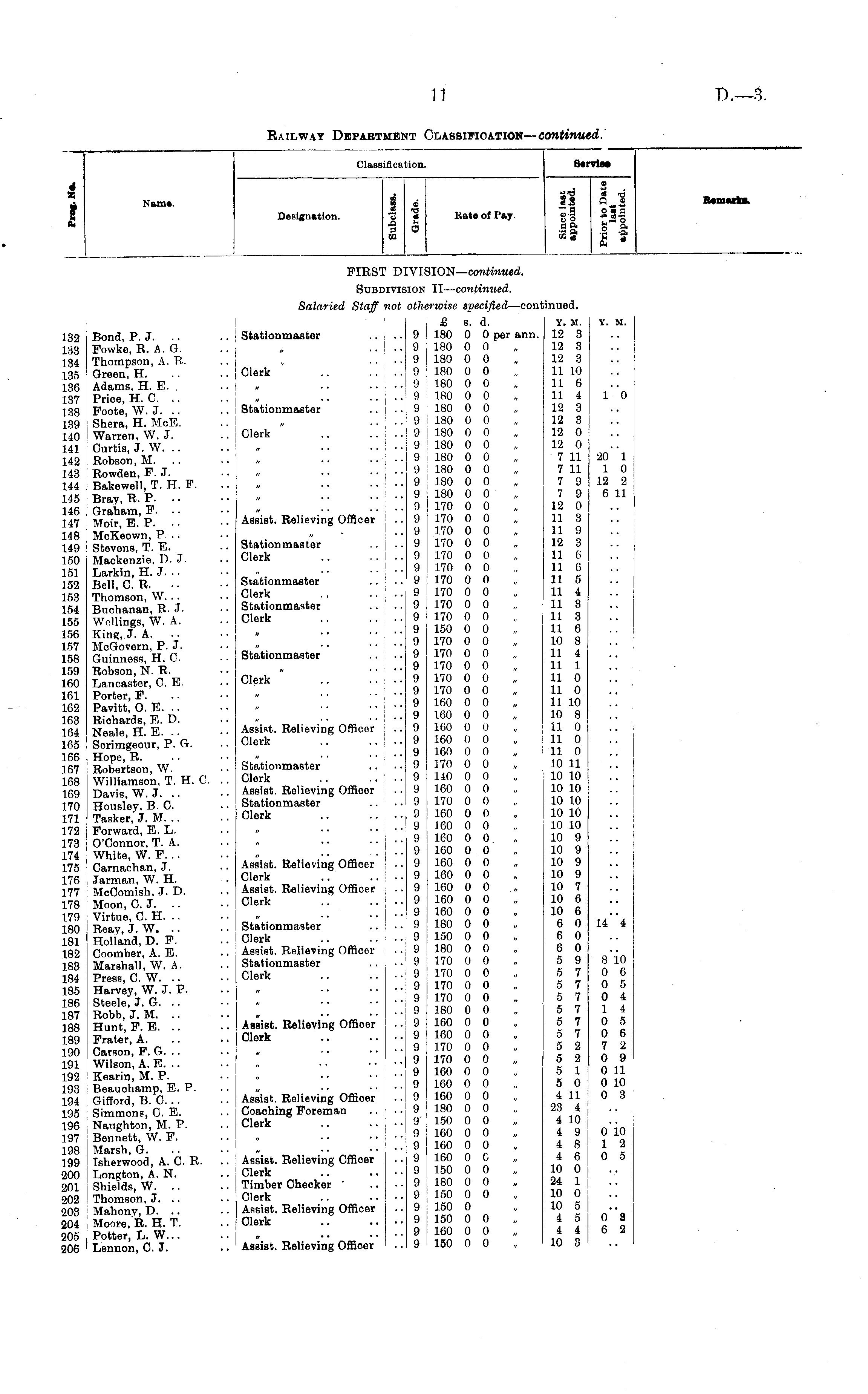 Classificatio] 6 X I Name. Designation. m co OS "3 Si 0 m ■a 5 Rate of Pay. si •1 mi 9 ° 3 3 rM - FIRST d [VISION— continued. Subdivis ;ion II— continued. Salaried Staff not otherwise specified —com j £ s. d. 9 180 0 0 per ann. 9 , 180 0 0 9 ! 180 0 0 9 180 0 0 9 180 0 0 9 180 0 0 9 180 0 0 9 180 0 0 9 ! 180 0 0 9 ! 180 0 0 9 180 0 0 9 1 180 0 0 9 180 0 0 9 180 0 0 9 170 0 0 9 170 0 0 9 170 0 0 9 170 0 0 9 170 0 0 9 170 0 0 9 170 0 0 9 ' 170 0 0 9 170 0 0 9 170 0 0 9 150 0 0 9 170 0 0 9 170 0 0 9 170 0 0 9 170 0 0 9 170 0 0 9 160 0 0 9 160 0 0 9 160 0 0 9 160 0 0 9 160 0 0 9 170 0 0 9 140 0 0 9 1 160 0 0 9 ! 170 0 0 9 160 0 0 9 ! 160 0 0 9 160 0 0 9 160 0 0 9 160 0 0 9 160 0 0 9 160 0 0 9 160 0 0 9 160 0 0 9 180 0 0 9 150 0 0 9 ! 180 0 0 9 I 170 0 0 9 170 0 0 9 170 0 0 9 170 0 0 9 180 0 0 9 160 0 0 9 160 0 0 9 170 0 0 9 170 0 0 9 160 0 0 9 160 0 0 9 160 0 0 9 180 0 0 9 150 0 0 9 ! 160 0 0 9 160 0 0 9 160 0 C 9 150 0 0 9 180 0 0 9 150 0 0 9 150 0 9 , 150 0 0 9 I 160 0 0 9 ! 150 0 0 iinued. 132 133 134 135 136 137 138 139 140 141 142 143 144 145 146 147 148 149 150 151 152 153 154 155 156 157 158 159 160 161 162 163 164 165 166 167 168 169 170 171 172 173 174 175 176 177 178 179 180 181 182 183 184 185 186 187 188 189 190 191 192 193 194 195 196 197 198 199 200 201 202 203 204 205 Bond, P. J. Fowke, R. A. G. Thompson, A. R. Green, H. Adams, H. E. . Price, H. C Foote, W. J. Shera, H, McE. Warren, W. J. Curtis, J. W. Robson, M. .. Rowden, F. J. Bakewell, T. H. P. Bray, R. P. Graham, F. • • Moir, E. P. McKeown, P •. Stevens, T. E. Mackenzie, D. J. Larkin, H. J. • • Bell, C. R. •■ Thomson, W. .. Buchanan, R. J. Wnllings, W. A. King, J. A. McGovern, P. J. Guinness, H. 0. Robson, N. R. Lancaster, 0. E. Porter, F. Pavitt, 0. E. Riohards, E. D. Neale, H. E. Scrimgeour, P. G. Hope, R. Robertson, W. Williamson, T. H. C. Davis, W. J. .. Honsley, B C. Tasker, J. M. .. Forward, E. L. O'Connor, T. A. White, W. F. .. Carnachan, J. Jarman, W. H. McComish, J. D. Moon, C.J. Virtue, 0. H. Reay, J. W. Holland, D. F. Coomber, A. E. Marshall, W. A. Press, C. W. Harvey, W. J. P. Steele, J. G. Robb, J. M. Hunt, P. E. .. Frater, A. Carson, F. G. .. Wilson, A. E. .. Kearin, M. P. Beauohamp, E. P. Gifford, B. C. .. Simmons, C E. Nanghton, M. P. Bennett, W. F. Marsh, G. Tsherwood, A. 0. R. Longton, A. N. Shields, W. .. Thomson, J. .. Mahonv, D. .. Moore, R. H. T. Potter, L. W... Lennon, 0. J. Stationmaster Clerk .. .. I .. Stationmaster .. .. Clerk " .. .'. .. i, • • . . • j . . i :: :: :: Assist. Relieving Officer Stationmaster .. .. Clerk .. .. .. Stationmaster Clerk .. .. -. Stationmaster Clerk .. .. .. Stationmaster Clerk .. .. .. Assist. Relieving Officer Clerk .. Stationmaster Clerk .. Aisllt. Relieving Offioer Stationmaster Clerk .. .. •• Y. M. 12 3 12 3 12 3 11 10 11 6 11 4 12 3 12 3 12 0 12 0 7 11 7 11 7 9 7 9 12 0 11 3 11 9 12 3 11 6 11 6 11 5 11 4 11 3 11 3 11 6 10 8 11 4 11 1 11 0 11 0 11 10 10 8 11 0 11 0 11 0 10 11 10 10 10 10 10 10 10 10 10 10 10 9 10 9 10 9 10 9 10 7 10 6 10 6 6 0 6 0 6 0 5 9 5 7 5 7 5 7 5 7 5 7 5 7 5 2 5 2 5 1 5 0 4 11 23 4 4 10 4 9 4 8 4 6 10 0 24 1 10 0 10 5 4 5 4 4 10 3 Y. M. 1 0 20 1 1 0 12 2 6 11 .. I .. Assist. Relieving Officer Clerk .. .. j .. Assist. Relieving Officer Clerk .. Stationmaster .. • • Clerk .. .. •• Assist. Relieving Officer Stationmaster Clerk .. .. •• 14"4 Assist. Relieving Officer Clerk 8 10 0 6 0 5 0 4 1 4 0 5 0 6 7 2 0 9 0 11 0 10 0 3 " Assist. Relieving Officer Coaching Foreman .. i .. Clerk .. .. •• 0 10 1 2 0 5 Assist. Relieving Cffioer Clerk .. .. •• Timber Checker ' Clerk .. .. •• Assist. Relieving Officer Clerk o"a 6 2 Assist. Relieving Officer