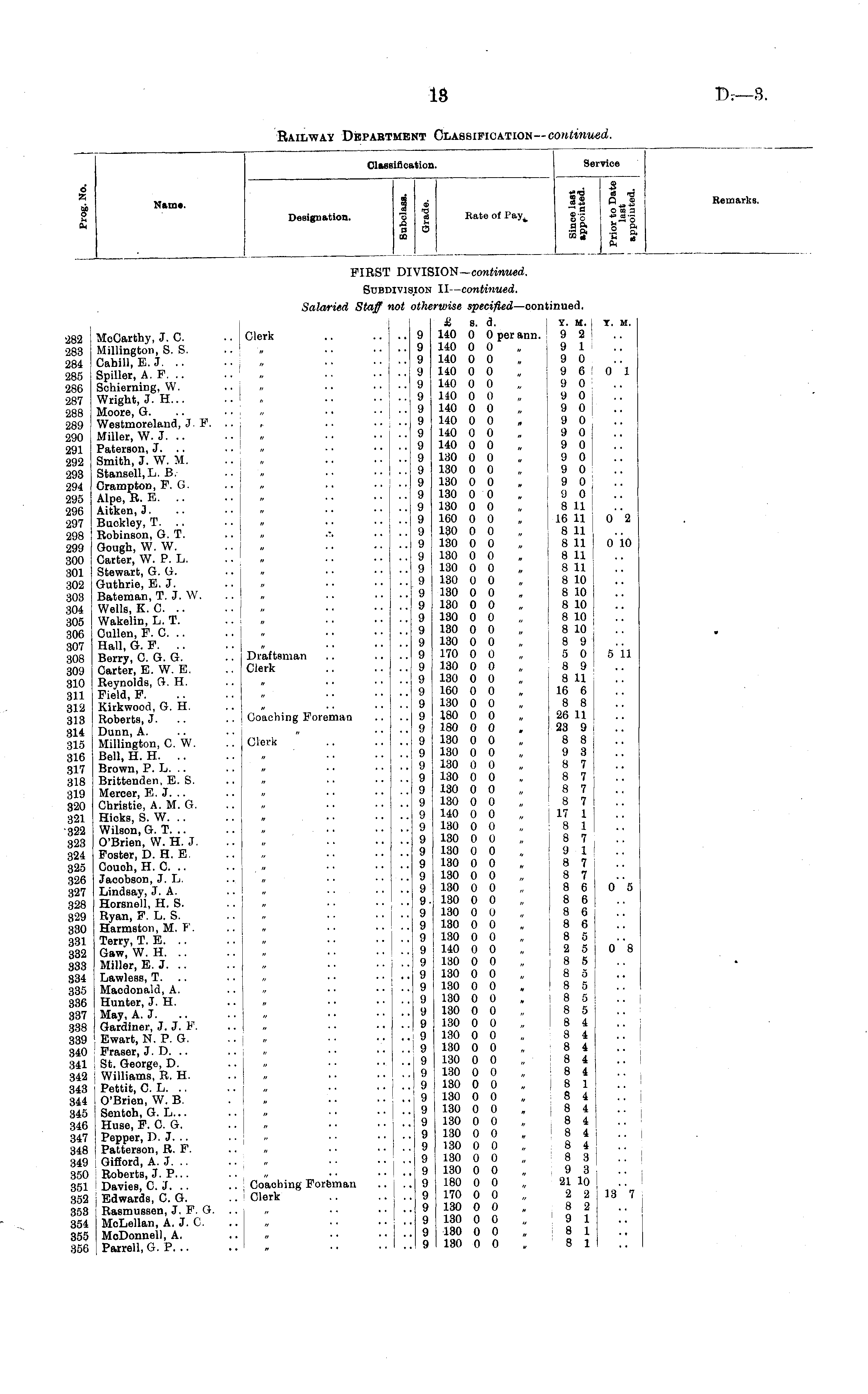 Classifici ition. Service 0 X ci o Jh 0h Name. Designation. CO CO cd "o rCO 3 crRate of i-ay ( S"d •I co £ a ft 35 8CO HH 03 n-J Q CD 0 CO 3 1 a rf <* Ph Remarks. FIRS! I)i VII HON—continued. SUBI ivi KM II— continued. 282 283 284 285 286 287 288 289 290 291 292 293 294 295 296 297 298 299 300 301 302 303 304 305 306 307 308 309 310 311 312 313 314 315 316 317 318 319 320 321 322 323 324 325 326 327 328 329 330 331 332 333 334 335 336 337 338 339 340 341 342 343 344 345 346 347 348 349 350 351 352 353 354 355 9Kfi MoCarthy, J. C. Millington, S. S. Cahill, E. J. .. Spiller, A. F. .. Schierning, W. Wright, J. H... Moore, G. Westmoreland, J. F. Miller, W. J. Paterson, J. .. Smith, J. W. M. Stansell.L. B. Crampton, F. G. Alpe, R. E. .. Aitken, J. Buckley, T. .. Robinson, G. T. Gough, W. W. Carter, W. P. L. Stewart, G. G. Guthrie, E. J. Bateman, T. J. W. Wells, K. C .. Wakelin, L. T. Cullen, P. C Hall, G. P. Berry, C G. G. Carter, E. W. E. Reynolds, G. H. Field, F. Kirkwood, G. H. Roberts, J. Dunn, A. Millington, 0. W. Bell, H. H. Brown, P. L. Brittenden. E. S. Meroer, E. J. Christie, A. M. G. Hicks, S. W. Wilson, G. T. .. O'Brien, W. H. J. Foster, D. H. E Couch, H. 0. Jacobson, J. L. Lindsay, J. A. Horsnell, H. S. Ryan, F. L. S. Harmston, M. F. Terry, T. E. Gaw, W. H. Miller, E. J. Lawless, T. Macdonald, A. Hunter, J. H. May, A. J. Gardiner, J. J. F. Ewart, N. P. G. Fraser, J. D. St. George, D. Williams, R. H. Pettit, C. L. O'Brien, W. B. i Sentoh, G. L... Huse, P. 0. G. ; Pepper, D. J. .. Patterson, R. F. Gifiord, A. J. Roberts, J. P... Davies, C.J, Edwards, 0. G. Rasmussen, J. P. G. j McLellan, A. J. 0. j MoDonnell, A. Parrell, G. P. .. Salaried Staff Clerk Draftsman I Clerk 1 j Coaching Foreman Clerk lot " " tthi 9 9 9 9 9 9 9 9 9 9 9 9 9 9 9 9 9 9 , 9 9 9 9 9 9 9 9 9 9 9 9 9 9 9 9 9 9 9 9 9 9 9 9 9 9 9 9 9 9 9 9 9 9 9 9 9 9 9 9 9 9 9 9 9 9 9 9 9 9 9 9 9 9 9 9 9 wwise specified —cont £ s. d. 140 0 0 per ann. 140 0 0 140 0 0 140 0 0 140 0 0 140 0 0 140 0 0 140 0 0 140 0 0 140 0 0 130 0 0 130 0 0 130 0 0 130 0 0 130 0 0 160 0 0 130 0 0 130 0 0 130 0 0 130 0 0 130 0 0 130 0 0 180 0 0 130 0 0 130 0 0 130 0 0 170 0 0 130 0 0 130 0 0 160 0 0 130 0 0 180 0 0 180 0 0 130 0 0 130 0 0 130 0 0 130 0 0 130 0 0 130 0 0 140 0 0 130 0 0 130 0 0 130 0 0 130 0 0 130 0 0 130 0 0 130 0 0 130 0 0 130 0 0 130 0 0 140 0 0 i 130 0 0 130 0 0 130 0 0 130 0 0 130 0 0 130 0 0 130 0 0 130 0 0 130 0 0 130 0 0 130 0 0 130 0 0 130 0 0 130 0 0 130 0 0 130 0 0 130 0 0 130 0 0 180 0 0 i 170 0 0 130 0 0 130 0 0 130 0 0 130 0 0 tinued. Y. M. 9 2 . 9 1 9 0 9 6 9 0 9 0 9 0 9 0 9 0 9 0 9 0 9 0 9 0 9 0 8 11 16 11 8 11 8 11 1 8 11 8 11 j 8 10 i 8 10 8 10 ■ 8 10 8 10 8 9 5 0 8 9 j 8 11 16 6 8 8 ; 26 11 23 9 8 8 9 3 8 7 8 7 8 7 8 7 17 1 8 1 8 7 9 1 8 7 8 7 8 6 8 6 8 6 8 6 8 8 2 5 8 5 8 5 ' 8 5 : 8 5 8 5 8 4 8 4 8 4 8 4 8 4 8 1 8 4 8 4 8 4 8 4 8 4 8 3 9 3 21 10 2 2 8 2 9 1 8 1 8 1 i : I I I j ! . I I i Y. M. 0 1 0 2 0 10 5 11 0"5 o"8 13" 7 Coaohing Foreman Clerk