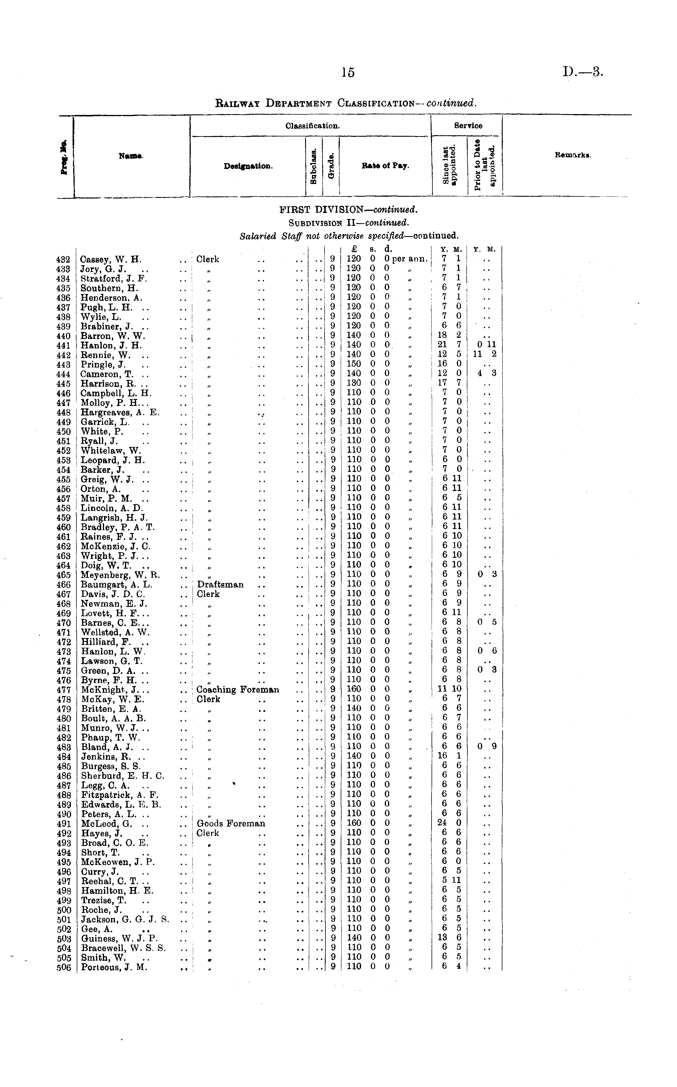Classification. Service ii 1 Name. Designation. rx I "co £ 3 on 6 •fl ce r5 Rate of Pay. c S"S S "d .s o oo a S3 -frSo aa g a Remark FIRS! Dl :vi SION— continued. SUBl IIVI! HOI t II—continued. 32 ,33 34 138 186 ,37 ,38 ,89 ,40 141 142 ,43 44 145 !46 ,47 148 149 150 151 152 153 ,54 155 150 157 ,58 169 160 161 ,62 ,63 ,64 ,65 166 167 ,08 109 170 171 172 173 174 175 176 177 178 179 180 181 182 183 184 185 180 187 188 189 190 191 192 193 194 195 196 197 198 199 )00 iOl 302 ;03 -04 )05 iOG Cassey, W. H. Jory, G. J. Stratford, J. F. Southern, H. Henderson, A. Pugh.L. H. .. Wylie, L. Brabiner, J. .. Barron, W. W. Hanlon, J. H. Rennie, W. Pringle, J. Cameron, T. .. Harrison, R. .. Campbell, L. H. Molloy, P. H... Hargreaves, A. E, Garrick, L. White, P. Ryall, J. Whitelaw, W. Leopard, J. H. Barker, J. Greig, W. J. Orton, A. Muir, P. M. Lincoln, A. D. Langrish, H. J. Bradley, P. A. T. Raines, F. J. McKenzie, J. 0. Wright, P. J. .. Doig, W. T. Meyenberg, W. R. Baumgart, A. L. Davis, J. D. C. Newman, E. J. Lovett, H. P. .. Barnes, C. E... Wellsted, A. W. Hilliard, F. .. Hanlon, L. W. Lawson, G. T. Green, D. A. Byrne, P. H. .. McKnight, J. .. McKay, W. E. Britten, E. A. Boult, A. A. B. Munro, W. J. Phaup, T. W. Bland, A. J. Jenkins, R. .. Burgess, S. S. Sherburd, E. H. C Legg, CA. Fitzpatrick, A. F. Edwards, L. E. B. Peters, A. L. McLeod, G. .. Hayes, J. Broad, 0. O. E. Short, T. McKeowen, J. P. Curry, J. Reehal, O. T. .. Hamilton, H. E. Trezise, T. Roche, J. Jackson, G. G. J. S. Gee A. Guineas, W. j! *P. Bracewell, W. S. S. Smith, W. .. Porteous, J. M. Salaried Staff ' .. Clerk .. ., .. Draftsman .. Clerk .. Coaching Foreman .. Clerk .. j ., .. I .. Goods Foreman .. Clerk •. | 0 •. •. lOt i itht (I 9 9 '.) 9 9 9 9 9 9 9 9 9 9 9 9 9 9 9 '.) 9 9 9 9 9 9 9 9 9 9 9 9 9 9 9 9 9 9 9 9 9 9 9 9 9 9 9 9 9 9 9 9 9 9 9 9 9 9 9 9 9 9 9 9 9 9 9 9 9 9 9 9 9 9 9 '.rwise specified—oow j £ s. d. 120 0 0 per ann. 120 0 0 120 0 0 120 0. 0 120 0 0 120 0 0 120 0 0 120 0 0 140 0 0 , 140 0 0 140 0 0 | 150 0 0 140 0 0 130 0 0 110 0 0 110 0 0 110 0 0 110 0 0 110 0 0 110 0 0 110 0 0 110 0 0 110 0 0 110 0 0 110 0 0 110 0 0 110 0 0 110 0 0 110 0 0 110 0 0 110 0 0 110 0 0 110 0 0 110 0 0 110 0 0 110 0 0 110 0 0 110 0 0 110 0 0 110 0 0 110 0 0 110 0 0 110 0 0 110 0 0 110 0 0 160 0 0 110 0 0 140 0 0 110 0 0 110 0 0 110 0 0 110 0 0 „ . 140 0 0 110 0 0 110 0 0 110 0 0 110 0 0 110 0 0 110 0 0 160 0 0 110 0 0 110 0 0 110 0 0 110 0 0 110 0 0 110 0 0 110 0 0 110 0 0 110 0 0 i 110 0 0 110 0 0 140 0 0 110 0 0 110 0 0 no 0 0 ;inued. I Y. M. ! 7 1 : 7 1 7 1 6 7 7 1 7 0 7 0 6 6 18 2 21 7 12 5; 16 0 12 0 17 7 7 0 7 0 7 0 I o 7 0 7 0 7 0 1 6 0 7 0 6 11 6 11 6 5 6 11 6 11 6 11 6 10 6 10 6 10 6 10 i 6 9 i 6 9 i 6 9 6 9 6 11 6 8 ! 6 8 ; 6 8 6 8 I 6 8 6 8 i 6 8 11 10 6 7 6 6 ■ 6 7 6 6 6 6 6 6 16 1 6 6 6 6 6 6 6 6 6 6 6 6 24 0 6 6 6 6 6 6 6 0 6 5 5 11 6 5 6 5 6 5 6 5 6 5 13 6 6 5 6 5 6 4 Y. M. oil 11 2 4 3 *• 0 3 OS 0 6 o"3 0 9 oil 11 2 4 3 0 3 OS 0 6 o"3 0 9