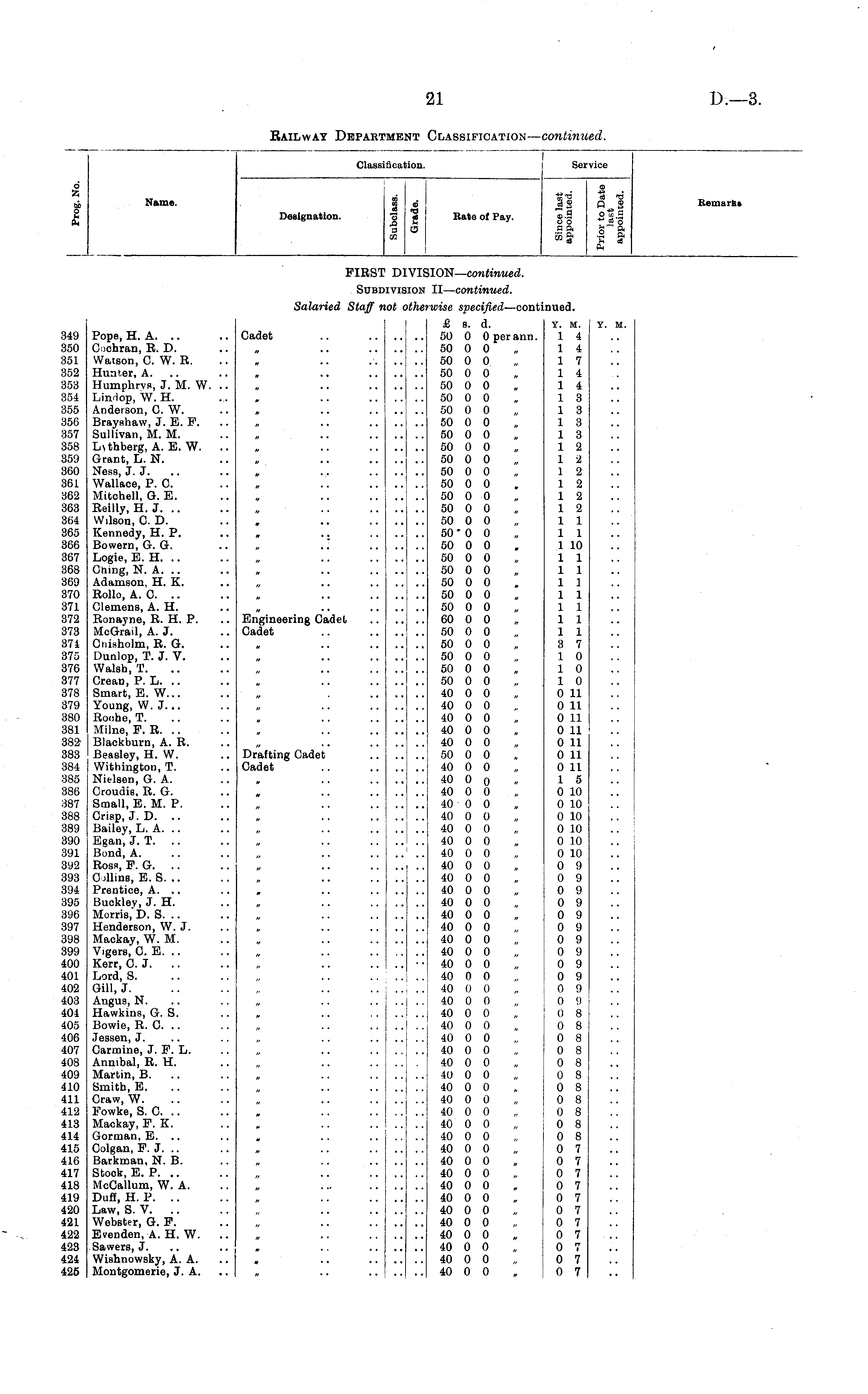 Classirical lion. Service d X cc O r. a Name. Designation. M CO a 3 CO ■O ed -. o Rate of Pay. CO tt V ta >d S co p CO 15 Sl3 co o .5 o .sg 3 g m ca S ce a Remark* FIRS. ' D [VI! 5ION— continued. SUBl UVIi SION II — continued. 349 350 351 352 353 354 355 356 357 358 359 360 361 362 363 364 365 366 367 368 369 370 371 372 373 374 375 376 377 378 379 380 381 382 383 384 385 386 387 388 389 390 391 392 393 394 395 396 397 398 399 400 401 402 403 404 405 406 407 408 409 410 411 412 413 414 415 416 417 418 419 420 421 422 423 424 425 Pope, H. A. .. Cochran, R. D. Watson, 0. W. R. Hunter, A. Humphrvs, J. M. W. Lindop, W. H. Anderson, C. W. Brayshaw, J. E. F. Sullivan, M. M. L.thberg, A. E. W. .. Grant, L. N. Ness, J. J. .. Wallace, P. 0. Mitchell, G. E. Reilly, H. J. .. Wilson, CD. Kennedy, H. P. Bowern, G. G. Logic, E. H. .. Cuing, N. A. .. Adamson, H. K. Rollo, A. 0. .. Clemens, A. H. Ronayne, R. H. P. McGrail, A. J. Onisholm, R. G. Dunlop, T. J. V. Walsh, T. Crean, P. L. .. Smart, E. W... Young, W.J... Roche, T. Milne, P. R. .. Blackburn, A. R. Beasley, H. W. Withington, T. Nielsen, G. A. Croudis, R. G. Small, E. M. P. Crisp, J. D. .. Bailey, L. A. .. Egan, J. T. .. Bond, A. Ross, F. G. .. OJlins, E. S. .. Prentice, A. .. Buckley, J. H. Morris, D. S. .. Henderson, W. J. Mackay, W. M. Vigors, 0. E. .. Kerr, 0. J. Lord, S. Gill, J. Angus, N. Hawkins, G. S. Bowie, R. 0. .. Jessen, J. Carmine, J. F. L. Annibal, R. H. Martin, B. Smith, E. Craw, W. Fowke, S. 0. .. Mackay, P. K. Gorman, E. .. Colgan, F. J. .. Barkman, N. B. Stock, E. P. .. McCallum, W. A. Duff, H. P. .. Law, S. V. Webster, G. F. Evenden, A. H. W. Sawers, J. Wishnowsky, A. A. Montgomerie, J. A. Salaried Staff i Cadet Engineering Cadet Cadet Drafting Cadet Cadet lot ,the rwise specified —cont: £ s. d. 50 0 0 per ann. 50 0 0 50 0 0 50 0 0 50 0 0 50 0 0 50 0 0 50 0 0 50 0 0 50 0 0 50 0 0 50 0 0 50 0 0 50 0 0 50 0 0 50 0 0 50 • 0 0 50 0 0 50 0 0 50 0 0 50 0 0 50 0 0 50 0 0 60 0 0 50 0 0 50 0 0 50 0 0 50 0 0 50 0 0 40 0 0 40 0 0 40 0 0 40 0 0 40 0 0 50 0 0 40 0 0 40 0 o 40 0 0 40 0 0 40 0 0 40 0 0 40 0 0 40 0 0 40 0 0 40 0 0 40 0 0 40 0 0 40 0 0 40 0 0 40 0 0 40 0 0 40 0 0 40 0 0 40 0 0 40 0 0 40 0 0 40 0 0 ; 40 o o 40 0 0 40 0 0 40 0 0 40 0 0 40 0 0 40 0 0 40 0 0 40 0 0 40 0 0 40 0 0 40 0 0 40 0 0 40 0 0 40 0 0 40 0 0 40 0 0 40 0 0 40 0 0 40 0 0 inued. Y. M. 1 4 1 4 1 7 1 4 1 4 1 3 1 3 1 3 1 3 1 2 1 2 1 2 1 2 1 2 1 2 1 1 1 1 1 10 1 1 1 1 1 1 1 1 1 1 1 1 1 1 3 7 1 0 1 0 1 0 0 11 0 11 0 11 0 11 0 11 0 11 0 11 1 5 0 10 0 10 0 10 0 10 0 10 0 10 0 9 0 9 0 9 0 9 0 9 0 9 0 9 0 9 0 9 0 9 0 9 0 9 : o 8 0 8 i 0 8 ; 0 8 0 8 0 8 0 8 0 8 0 8 , 0 8 0 8 0 7 0 7 0 7 i 0 7 0 7 0 7 0 7 0 7 0 7 0 7 0 7 Y. M.