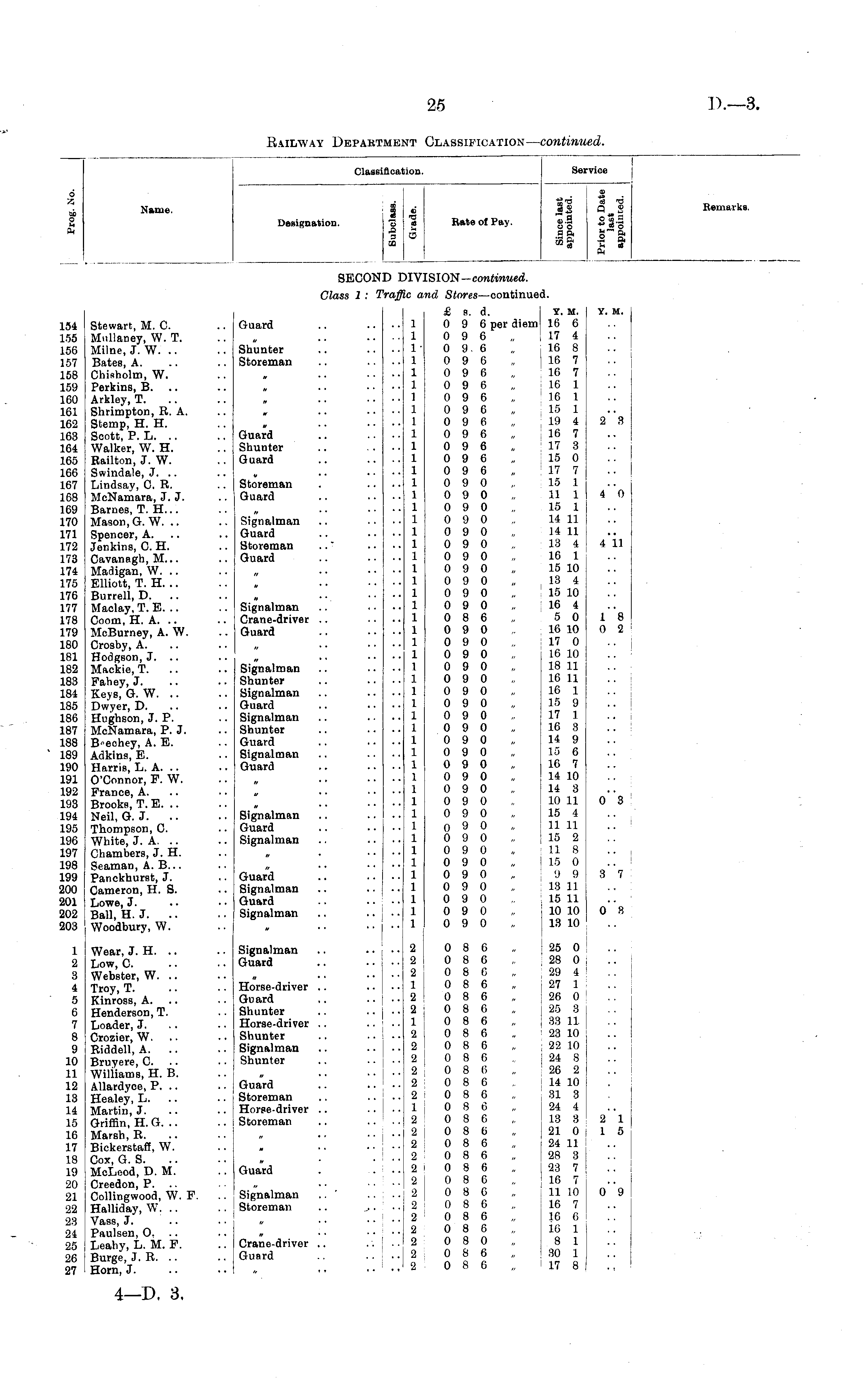 Classi ifloation. Service I 6 a 2 Name. Designation. I I QQ «5 5 Rate of Pay. "2.3 ° ? .5 o o * o S| I ! Remarks. SECON )iv: IVISION -continued. Class 1 : 1 Vα, lc a 3 and Stores —continue! id. 154 155 156 157 158 159 160 161 162 163 164 165 166 167 168 169 170 171 172 173 174 175 176 177 178 179 180 181 182 183 184 185 186 187 188 189 190 191 192 193 194 195 196 197 198 199 200 201 202 203 Stewart, M. C. Mnllaney, W. T. Milne, J. W. .. Bates, A. Chieholm, W. Perkins, B. .. Arkley, T. Shrimpton, R. A. Stemp, H. H. Scott, P. L. Walker, W. H. Railton, J. W. Swindale, J. .. Lindsay, C. R. McNamara, J. J. Barnes, T. H... Mason, G. W. Spencer, A. Jenkins, C. H. Cavanagh, M... Madigan, W. .. Elliott, T. H. .. Burrell, D. Maclay, T. E. .. Coom, H. A. McBurney, A. W. Crosby, A. Hodgson, J. .. Mackie, T. Fahey, J. Keys, G. W. Dwyer, D. Hughson, J. P. McNamara, P. J. B»eohey, A. E. Adkins, E. Harris, L. A. O'Connor, P. W. PraDce, A. Brooks, T. E. Neil, G. J. Thompson, C. White, J. A. .. Chambers, J. H. Seaman, A. B... Panckhurst, J. Cameron, H. S. Lowe, J. Ball, H. 3. .. Woodbury, W. Guard Shunter Storeman Guard Shunter Guard Storeman Guard Signalman Guard Storeman Guard * * * • • Signalman Crane-driver Guard £ s. d. 1 0 9 6 per diem 1 0 9 6 1 • 0 9-6 1 0 9 6 1 0 9 6 1 0 9 6 1 0 9 6 1 0 9 6 1 0 9 6 1 0 9 6 1 0 9 6 1 0 9 6 1 0 9 6 1 0 9 0 1 0 9 0 1 0 9 0 1 0 9 0 1 0 9 0 1 0 9 0 1 0 9 0 I 0 9 0 1 0 9 0 1 0 9 0 1 0 9 0 1 0 8 6 1 0 9 0 1 0 9 0 1 0 9 0 „ j 1 0 9 0 1 0 9 0 1 0 9 0 1 0 9 0 1 0 9 0 1 0 9 0 1 0 9 0 1 0 9 0 1 0 9 0 1 0 9 0 1 0 9 0 1 0 9 0 1 0 9 0 1 o 9 0 , 1 0 9 0 1 0 9 0 1 0 9 0 1 0 9 0 1 0 9 0 1 0 9 0 1 0 9 0 1 0 9 0 y. m. i 16 6 : 17 4 16 8 16 7 16 7 16 1 16 1 15 1 19 4 16 7 17 3 15 0 17 7 15 1 11 1 15 1 14 11 14 11 13 4 16 1 15 10 13 4 15 10 16 4 5 0 16 10 17 0 16 10 18 11 16 11 16 1 15 9 17 1 16 8 14 9 15 6 16 7 14 10 14 3 10 11 15 4 11 11 : 15 2 11 8 15 0 'J 9 : 13 11 15 11 10 10 1 13 10 Y. M. 2*8 4"o 411 l"8 0 2 Signalman Shunter Signalman Guard Signalman Shunter Guard Signalman Guard o'"3 Signalman Guard Signalman Guard Signalman Guard Signalman .. 37 0* 8 1 2 3 4 5 6 7 8 9 10 11 12 13 14 15 16 17 18 19 20 21 22 23 24 25 26 27 Wear, J. H. .. Low, C. Webster, W. .. Troy, T. Kinross, A. Henderson, T. Loader, J. Crozier, W. Riddell, A. .. Bruyere, C. Wiliiams, H. B. Allardyoe, P. .. Healey, L. Martin, J. Griffin, H.G. .. Marsh, R. Bickerstafi, W. Cox, G. S. McLeod, D, M. Creedon, P. .. Collingwood, W. F. Halliday, W. .. Vass, J. Paulsen, O. .. Leahy, L. M. F. Burge, J. R. Horn, J. Signalman .. Guard Horse-driver Guard .. Shunter Horse-driver Shunter Signalman Shunter Guard Storeman Horse-driver Storeman 2 0 8 6 2 0 8 6 2 0 8 0 1 0 8 6,, 2 0 8 6 2 0 8 6 1 0 8 6 2 0 8 6 2 0 8 6,, 2 0 8 6 2 0 8 (i 2 0 8 6 2 0 8 6 1 0 8 6 2 0 8 6 2 i 0 8 6 2 0 8 6 2 0 8 6 2 0 8 6 2 0 8 0 2 0 8 6 2 0 8 6 2 0 8 6 2 0 8 6 2 0 8 0 2 0 8 6 2 0 8 6,, 25 0 28 0 29 4 27 1 26 0 25 8 88 11 23 10 22 10 24 8 26 2 14 10 31 3 24 4 13 8 21 0 ■ 24 11 28 8 23 7 16 7 11 10 16 7 16 6 16 1 8 1 30 1 17 8 ' ■ ■ 2 1 1 5 Guard Signalman Storeman .. _,. 0 9 Crane-driver .. Guard