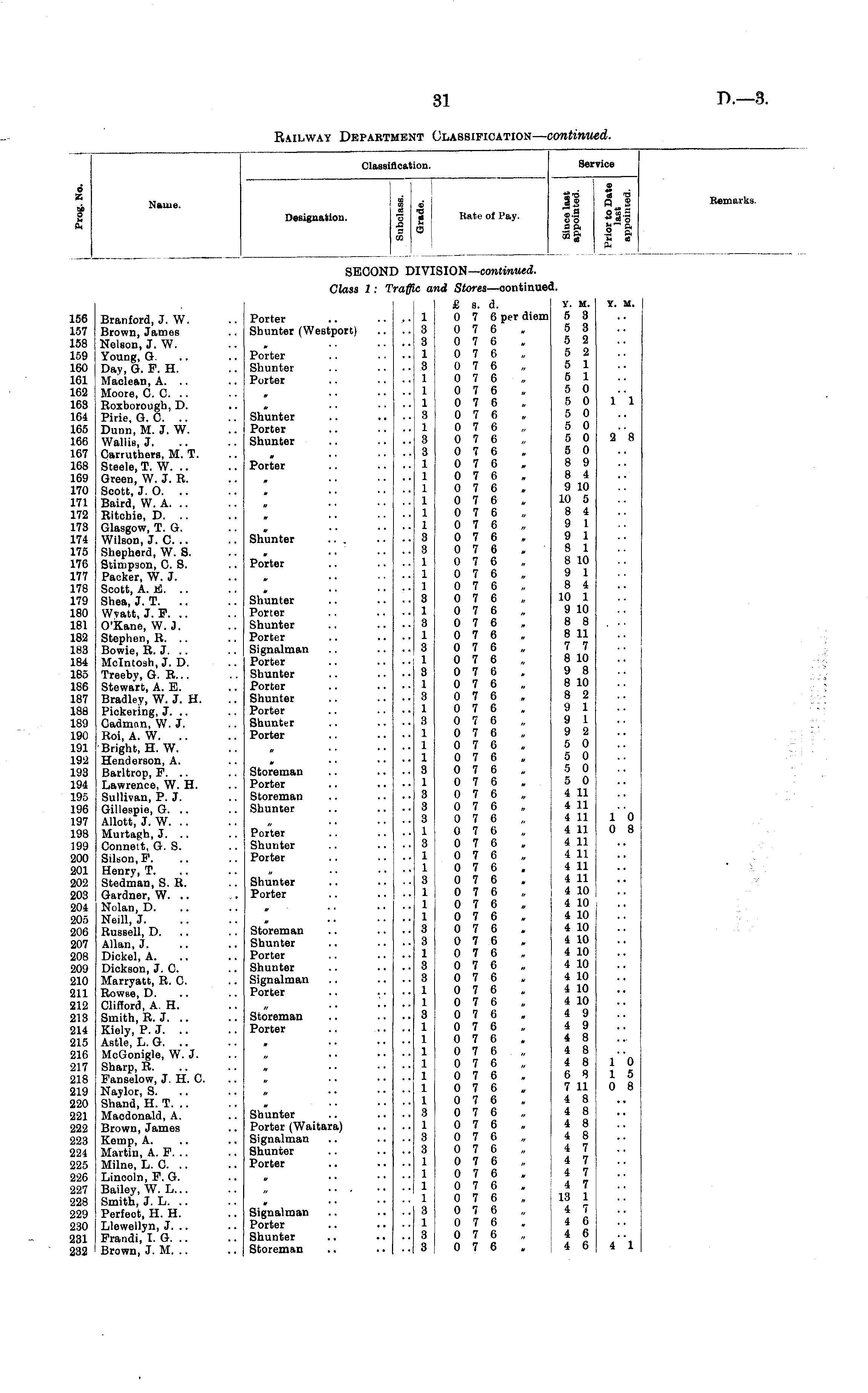 Classificai iion. Service 6 X i a Name. Designation. i 3 "o rO 3 CO CO s Rate of Pay. Hfrrj ("j rrj S jo Q 2 Remarks. Is s».s co o .* o a a g ft a& | tt a seoon: :SION— continued. Branford, J. W. Brown, James Nelson, J. W. Young, G. Day, G. F. H. Maclean, A. .. Moore, 0.0. .. Roxborougb, D. Pirie, G. 0. Dunn, M. J. W. Wallia, J. Carruthers, M. T. Steele, T. W. .. Green, W. J. R. Scott, J. 0. Baird, W. A. Ritchie, D. .. Glasgow, T. G. Wilson, J. C. .. Shepherd, W. S. Stimpson, 0. S. Packer, W. J. Scott, A. E. Shea, J. T. Wvatt, J. F. O'Kane, W. 3. Stephen, R. .. Bowie, R. J. Mcintosh, J. D. Treeby, G. R... Stewart, A. E. Bradley, W. J. H. Pickering, J. .. Cadmnn, W. J. Roi, A. W. Bright, H. W. Henderson, A. Barltrop, F. .. Lawrence, W. H. Sullivan, P. J. Gillespie, G. .. Allott, J. W. Murtagh, J. .. Conneit, G. S. Silson.P. Henry, T. Stedman, S. R. Gardner, W. .. Nolan, D. Neill, J. Russell, D. .. Allan, J. Dickel, A. Dickson, J. 0. Marryatt, R. 0. Rowse, D. Clifford, A. H. Smith, R.J. .. Kiely, P. J. Astle, L. G. McGonigle, W. J. Sharp, R. Fanselow, J. H. 0. Naylor, S. Shand, H. T. Macdonald, A. Brown, James Kemp, A. Martin, A. P. .. Milne, L. 0. Linooln, P. G. Bailey, W. L... Smith, J. L. Perfeot, H. H. Llewellyn, J. .. Frandi, I. G. Brown, J. M. .. Class 1 : 1 nd Stores —continuec I. rm ic a: 156 157 158 159 160 161 162 163 164 165 166 167 168 169 170 171 172 173 174 175 176 177 178 179 180 181 182 183 184 185 186 187 188 189 190 191 192 193 194 195 196 197 198 199 200 201 202 203 204 205 206 207 208 209 210 211 212 213 214 215 216 217 218 219 220 221 222 223 224 225 226 227 228 229 230 231 232 Porter Shunter (Westport) Porter Shunter Porter Shunter Porter Shunter Porter Shunter ... Porter Shunter Porter Shunter Porter Signalman Porter Shunter Porter Shunter Porter Shunter Porter Storeman Porter Storeman Shunter 1 8 3 1 3 1 1 1 8 1 3 3 1 1 1 1 1 1 3 8 1 1 1 3 1 3 1 3 1 3 1 3 1 3 1 1 1 3 1 3 3 8 1 3 1 1 3 1 1 1 8 3 1 3 3 1 1 3 1 1 1 1 1 1 1 3 1 8 3 1 1 1 1 3 1 3 3 £ s. d. 0 7 6 per diem 0 7 6 0 7 6 0 7 6 0 7 6 0 7 6 0 7 6 0 7 6 0 7 6 0 7 6 0 7 6 0 7 6 0 7 6 0 7 6 0 7 6 0 7 6 0 7 6 0 7 6 0 7 6 0 7 6 0 7 6 0 7 6 0 7 6 0 7 6 0 7 6 0 7 6 0 7 6 0 7 6 0 7 6 0 7 6 0 7 6 0 7 6 0 7 6 0 7 6 0 7 6 0 7 6 0 7 6 0 7 6 0 7 6 0 7 6 0 7 6 0 7 6 0 7 6 0 7 6 0 7 6 0 7 6 0 7 6 0 7 6 0 7 6 0 7 6 0 7 6 0 7 6 0 7 6 0 7 6 0 7 6 0 7 6 0 7 6 0 7 6 0 7 6 0 7 6 0 7 6 0 7 6 0 7 6 0 7 6 0 7 6 0 7 6 0 7 6 0 7 6 0 7 6 0 7 6 0 7 6 0 7 6 0 7 6 0 7 6 0 7 6 0 7 6 0 7 6 Y. M. Y. M. 5 3 5 3 5 2 5 2 5 1 5 1 5 0 5 0 11 5 0 5 0 5 0 2 8 5 0 8 9 8 4 9 10 10 5 8 4 9 1 9 1 8 1 8 10 9 1 8 4 10 1 9 10 8 8 ... 8 11 7 7 8 10 9 8 8 10 8 2 9 1 9 1 9 2 5 0 5 0 5 0 5 0 4 11 4 11 4 11 10 4 11 0 8 4 11 4 11 4 11 ' 4 11 4 10 4 10 . 4 10 4 10 4 10 4 10 4 10 4 10 4 10 4 10 4 9 4 9 4 8 4 8 4 8 10 6 8 15 7 11 0 8 4 8 4 8 4 8 4 8 4 7 4 7 4 7 4 7 13 1 4 7 4 6 4 6 4 6 4 1 Porter Shunter Porter Shunter Porter Storeman Shunter Porter Shunter Signalman Porter Storeman Porter Shunter Porter (Waitara) Signalman Shunter Porter Signalman Porter Shunter Storeman