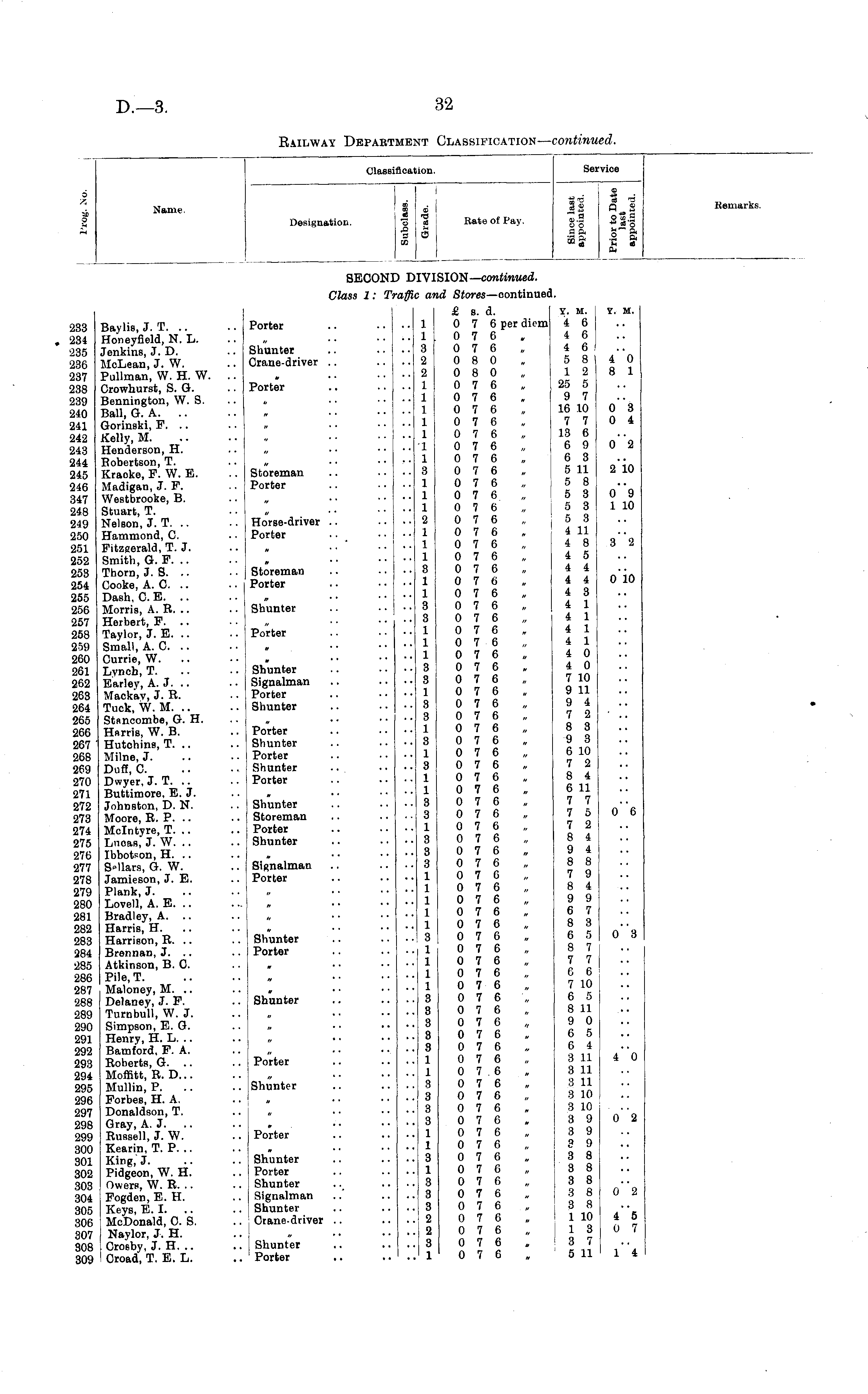 Classification. Service a A 5 Name. Designation. » ■ I CO CO rS "O CO ea "° rS 3 55 ; CO Rate of Pay. I CD St ea "3 -52 OS IS o|3 co o 7 js o a& o Sf •.3 a .Co a <°«a u 2 a Remark: SECON] )IVJ SION—continued. Class 1: T 'ra, ic m %d Stores —continued 233 234 235 236 237 238 239 240 241 242 243 244 245 246 347 248 249 250 251 252 258 254 255 256 257 258 259 260 261 262 263 264 265 266 267 268 269 270 271 272 273 274 275 276 277 278 279 280 281 282 283 284 285 286 287 288 289 290 291 292 293 294 295 296 297 298 299 300 301 302 303 304 305 306 307 308 309 Baylis, J. T. Honeyfield, N. L. Jenkins, J. D. McLean, J. W. Pullman, W. H. W. Crowhurst, S. G. Bennington, W. S. Ball, G. A. Gorinski, F. .. Kelly, M. Henderson, H. Robertson, T. Kraoke, F. W. E. Madigan, 3. F. Westbrooke, B. Stuart, T. Nelson, J. T. .. Hammond, 0. Fitzgerald, T. J. Smith, G. F. .. Thorn, J. S. .. Cooke, A. 0. .. Dash, 0. E. Morris, A. R. .. Herbert, F. .. Taylor, J. E. Small, A. C .. Currie, W. Lynch, T. Earley, A. J. Mackav, J. R. Tuck, W. M. .. Stnncombe, G. H. Harris. W. B. Hutchins, T. .. Milne, J. Duff, C. Dwyer, J. T. Buttimore, E. J. Johnston, D. N. Moore, R. P. Mclntyre, T. .. Lnoas, J. W. Ibbotson, H. .. S'llars, G. W. Jamieson, J. E. Plank, J. Lovell, A. E. Bradley, A. .. Harris, H. Harrison, R. .. Brennan, J. .. Atkinson, B. 0. Pile, T. Maloney, M. .. Delaney, J. F. Turnbull, W. J. Simpson, E. G. Henry, H. L. .. Bamford, F. A. Roberts, G. .. Moffitt, R. D... Mullin, P. Forbes, H. A. Donaldson, T. Gray, A. J. Russell, J. W. Kearin, T. P. .. King, J. Pidgeon, W. H. Owers, W. R. .. Fogden, E. H. Keys, E. I. McDonald, C. S. Naylor, J. H. Crosby, J. H. .. Croad, T. E. L. Porter Shunter Crane-driver Porter Storeman Porter Horse-driver Porter Storeman Porter Shunter Porter Shunter Signalman Porter Shunter Porter Shunter Porter Shunter Porter 1 1 3 2 2 1 1 1 1 1 1 1 3 1 1 1 2 1 1 1 8 1 1 3 3 1 1 1 3 3 1 3 3 1 3 1 3 1 1 3 3 1 3 3 3 1 1 1 1 1 3 1 1 1 1 3 3 3 3 3 1 1 3 3 3 3 1 1 3 1 3 3 3 2 2 3 1 £ s. d. 0 7 6 per diem 0 7 6 0 7 6 0 8 0 0 8 0 0 7 6 0 7 6 0 7 6 0 7 6 0 7 6 0 7 6 0 7 6 0 7 6 0 7 6 0 7 6 0 7 6 0 7 6 0 7 6 0 7 6 0 7 6 0 7 6 0 7 0 0 7 6 0 7 6 0 7 6 0 7 6 0 7 6 0 7 6 0 7 6 0 7 6 0 7 6 0 7 6 0 7 6 0 7 6 0 7 6 0 7 6 0 7 6 0 7 6 0 7 6 0 7 6 0 7 6 0 7 6 0 7 6 0 7 6 0 7 6 0 7 6 0 7 6 0 7 6 0 7 6 0 7 6 0 7 6 0 7 6 0 7 6 0 7 6 0 7 6 0 7 6 0 7 6 0 7 6 0 7 6 0 7 6 0 7 6 0 7.6 0 7 6 0 7 6 0 7 6 0 7 6 0 7 6 0 7 6 0 7 6 0 7 6 0 7 0 0 7 6 0 7 6 0 7 6 0 7 6 0 7 6 0 7 6 Y. M. 4 6 4 6 4 6 5 8 1 2 25 5 9 7 16 10 7 7 13 6 6 9 6 3 5 11 5 8 5 3 5 3 5 3 4 11 4 8 4 5 4 4 4 4 4 3 4 1 4 1 4 1 4 1 4 0 4 0 7 10 9 11 9 4 7 2 8 3 9 3 6 10 7 2 8 4 6 11 7 7 7 5 7 2 8 4 9 4 8 8 7 9 8 4 9 9 6 7 8 3 6 5 8 7 7 7 6 6 7 10 6 5 8 11 9 0 6 5 6 4 3 11 3 11 3 11 8 10 3 10 3 9 3 9 3 9 i 3 8 '88 3 8 3 8 3 8 1 10 1 3 3 7 5 11 Y. M. 4"o 8 1 0"3 0 4 o"2 2 io o"9 1 10 3 2 o io Shunter Storeman Porter Shunter o"6 Signalman Porter Shunter Porter 0 3 Shunter Porter 4 - 0 Shunter 0 2 Porter Shunter Porter Shunter Signalman Shunter Crane-driver .. o"2 4"5 0 7 [ Shunter 1 Porter 14