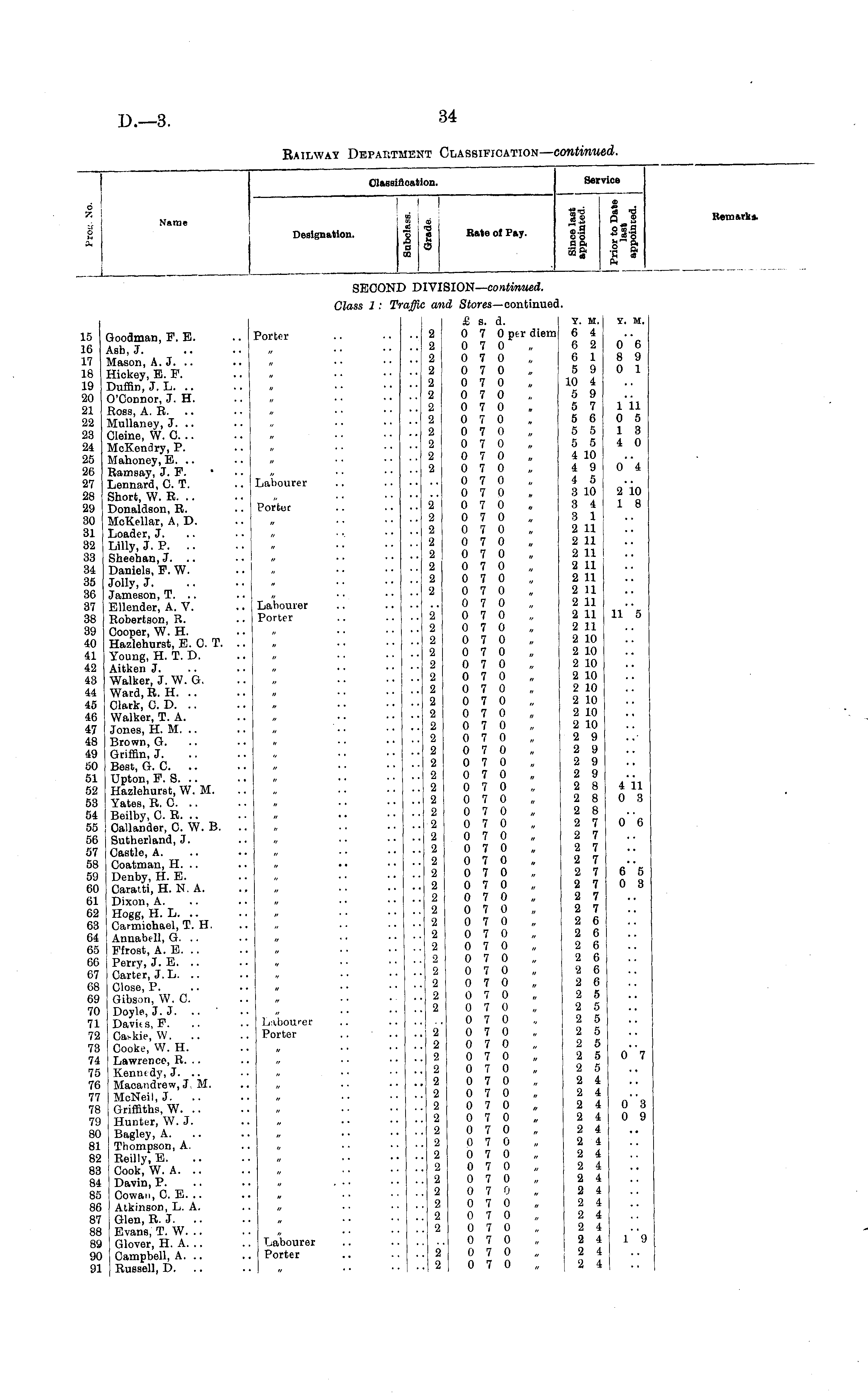 Classification. Service . 1 o X o IH a Name 1 CD 0 s —1 te "-) Q 2 o ».2 ■" ea'g H" ft rf < a Designation. cd i 8 rS S CO ai Mi s rrj t Rate of Pay. ■5-3 «2 la CO o 3 ft Remark*. SECONI ) D :SION— continued. Class 1 : Tt •affic id Stores— continued I. 15 16 17 18 19 20 21 22 23 24 25 26 27 28 29 30 31 32 33 34 35 36 37 38 39 40 41 42 43 44 45 46 47 48 49 50 51 52 53 54 55 56 57 58 59 60 61 62 63 64 65 66 67 68 69 70 71 72 73 74 75 76 77 78 79 80 81 82 83 84 85 86 87 88 89 90 91 Goodman, P. E. Ash, J. Mason, A.J. Hickey, E. F. Duffin, J. L. O'Connor, J. H. Ross, A, R. Mullaney, J. .. Cleine, W. 0. .. McKendry, P. Mahoney, E. .. Ramsay, J. F. • Lennard, 0. T. Short, W. R. Donaldson, R. McKellar, A, D. Loader, J. Lilly, J. P. Sheehan, J. .. Daniels, P. W. Jolly, J. Jameson, T. .. Ellender, A. V. Robertson, R. Cooper, W. H. Hazlehurst, E. 0. T. Young, H. T. D. Aitken J. Walker, J. W. G. Ward, R. H. Clark, CD. Walker, T. A. Jones, H. M. .. Brown, G. Griffin, J. Best, G. C. .. Upton, P. S. Hazlehurst, W. M. Yates, R. 0. Beilby, 0. R. .. Callander, 0. W. B. Sutherland, J. Castle, A. Coatman, H. .. Denby, H. E. Caratti, H. N. A. Dixon, A. Hogg, H. L. .. Carmichael, T. H. Annabell, G. .. Pfrost, A. E. Perry, J. E. .. Carter, J. L. .. Close, P. Gibson, W. C Doyle, J. J. Davits, F. Cai-kie, W. .. Cooke, W. H. Lawrence, R. .. Kenntdy, J. .. Macandrew, J, M. McNeil, J. .. Griffiths, W. .. Hunter, W. J. Bagley, A. Thompson, A. Reilly, E. Cook, W. A. Davin, P. Cowan, 0. E. .. Atkinson, L. A. Glen, R. J. Evans, T. W. .. Glover, H. A. .. Campbell, A. .. Russell, D. Porter Labourer Porter Labourer Porter 2 2 2 2 2 2 2 2 2 2 2 2 2 2 2 2 2 2 2 2 2 2 2 2 2 2 2 2 2 2 2 2 2 2 2 2 2 2 2 2 2 2 2 2 2 2 2 2 2 2 2 2 2 £ s. d. 0 7 0 per diem 0 7 0 0 7 0 0 7 0 0 7 0 0 7 0 0 7 0 0 7 0 0 7 0 0 7 0 0 7 0 0 7 0 0 7 0 0 7 0 0 7 0 0 7 0 0 7 0 0 7 0 0 7 0 0 7 0 0 7 0 0 7 0 0 7 0 0 7 0 0 7 0 0 7 0 0 7 0 0 7 0 0 7 0 0 7 0 0 7 0 0 7 0 0 7 0 0 7 0 0 7 0 0 7 0 0 7 0 0 7 0 0 7 0 0 7 0 0 7 0 0 7 0 0 7 0 0 7 0 0 7 0 0 7 0 0 7 0 0 7 0 0 7 0 0 7 0 0 7 0 0 7 0 0 7 0 0 7 0 0 7 0 0 7 0 0 7 0 0 7 0 0 7 0 0 7 0 0 7 0 0 7 0 0 7 0 0 7 0 0 7 0 0 7 0 0 7 0 0 7 0 0 7 0 0 7 0 0 7 0 0 7 0 0 7 0 0 7 0 0 7 0 0 7 0 0 7 0 Y. M. 6 4 6 2 6 1 5 9 10 4 5 9 5 7 5 6 5 5 5 5 4 10 4 9 4 5 3 10 3 4 3 1 2 11 2 11 2 11 2 11 2 11 2 11 2 11 2 11 2 11 2 10 2 10 2 10 2 10 2 10 2 10 2 10 2 10 2 9 2 9 2 9 2 9 2 8 2 8 2 8 2 7 2 7 2 7 2 7 2 7 2 7 2 7 2 7 2 6 2 6 2 6 2 6 2 6 2 6 2 5 2 5 2 5 2 5 2 5 2 5 2 5 2 4 2 4 2 4 2 4 2 4 2 4 2 4 2 4 2 4 2 4 2 4 2 4 2 4 2 4 2 4 2 4 Y. M. 0 6 8 9 0 1 1 11 0 5 1 3 4 0 o"4 2 io 1 8 n"s 411 0 8 o"6 6"5 0 3 Labourer Porter 2 2 2 2 2 2 2 2 2 2 2 2 2 2 2 2 2 o"7 o"3 0 9 Labourer Porter 19 2 2