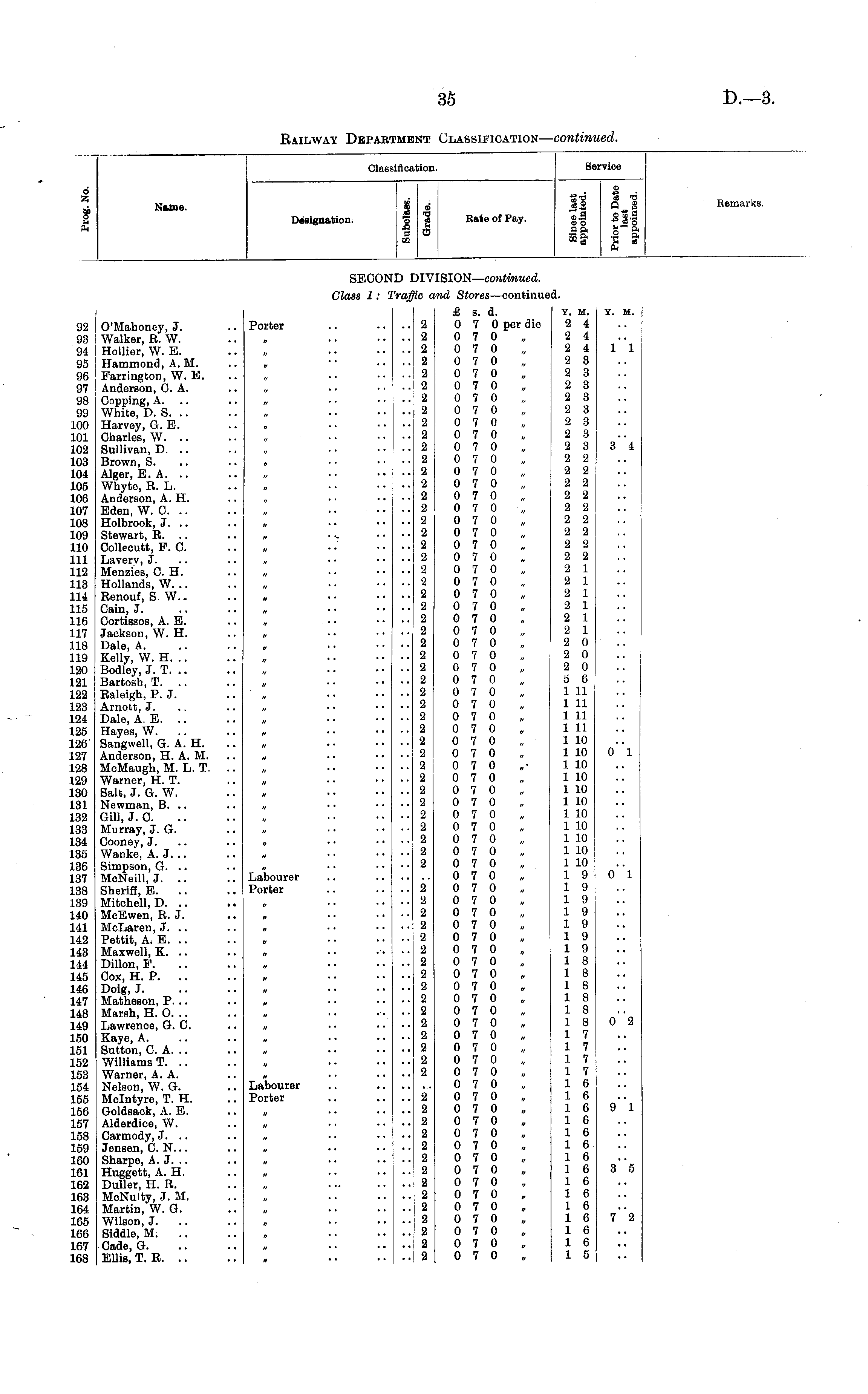 Classificai iion. Service 6 X a Name. Designation. CO CO 3 13 HO 3 CO CO IB ea Sh 53 Rate of Pay. II la CO o 3 ft Kg Q ■*° _J ce i0 o to s Z3o 2 a a Remarks. SECOI D )iv: !SION— continued. Class 1 : "ra-i \c a id Stores —oontinuei 92 93 94 95 96 97 98 99 100 101 102 103 104 105 106 107 108 109 110 111 112 113 114 115 116 117 118 119 120 121 122 123 124 125 126' 127 128 129 130 131 132 133 134 135 136 137 138 139 140 141 142 143 144 145 146 147 148 149 150 151 152 153 154 155 156 157 158 159 160 161 162 163 164 165 166 167 168 O'Mahoney, J. Walker, R. W. Hollier, W. E. Hammond, A. M. Farrington, W. E. Anderson, C A. Copping, A. White, D. S. Harvey, G. E. Charles, W. .. Sullivan, D. .. Brown, S. Alger, E. A. .. Whyte, R. L. Anderson, A. H. Eden, W. 0. Holbrook, J. Stewart, R. .. Collecutt, F. 0. Lavery, J. Menzies, 0. H. Hollands, W. .. Renouf, S. W.. Cain, J. Cortissos, A. E. Jackson, W. H. Dale, A. Kelly, W. H. .. Bodley, J. T. .. Bartosh, T. .. Raleigh, P. J. Arnott, J. Dale, A. E. Hayes, W. Sangwell, G. A. H. Anderson, H. A. M. MoMaugh, M. L. T. Warner, H. T. Salt, J. G. W, Newman, B. .. Gill, J. 0. Murray, J. G. Cooney, J. Wanke, A. J. .. Simpson, G. .. McNeill, J. .. Sheriff, E. .. Mitchell, D. .. McEwen, R. J. McLaren, J. .. Pettit, A. E. Maxwell, K. .. Dillon, F. Cox, H. P. Doig, J. Matheson, P. .. Marsh, H. O. .. Lawrenoe, G. O. Kaye, A. Sutton, CA,,. Williams T. .. Warner, A. A. Nelson, W. G. Mclntyre, T. H. Goldsack, A. E. Alderdice, W. Carmody, J. .. Jensen, C. N... Sharpe, A.J. Huggett, A. H. Duller, H. R. McNuity, J. M. Martin, W. G. Wilson, J. Siddle, M. Cade, G. Ellis, T. R. .. Porter a 2 2 2 2 2 2 2 2 2 2 2 2 2 2 2 2 2 2 2 2 2 2 2 2 2 2 2 2 2 2 2 2 2 2 2 2 2 2 2 2 2 2 2 2 2 £ s. d. 0 7 0 per die 0 7 0 0 7 0 0 7 0 0 7 0 0 7 0 0 7 0 0 7 0 0 7 0 0 7 0 0 7 0 0 7 0 0 7 0 0 7 0 0 7 0 0 7 0 „ 0 7 0 0 7 0 0 7 0 0 7 0 0 7 0 0 7 0 0 7 0 0 7 0 0 7 0 0 7 0 0 7 0 0 7 0 0 7 0 0 7 0 0 7 0 0 7 0 0 7 0 0 7 0 0 7 0 0 7 0 0 7 0 0 7 0 0 7 0 0 7 0 0 7 0 0 7 0 0 7 0 0 7 0 0 7 0 0 7 0 0 7 0 0 7 0 0 7 0 0 7 0 0 7 0 0 7 0 0 7 0 0 7 0 0 7 0 0 7 0 0 7 0 0 7 0 0 7 0 0 7 0 0 7 0 0 7 0 0 7 0 0 7 0 0 7 0 0 7 0 0 7 0 0 7 0 0 7 0 0 7 0 0 7 0 0 7 0 0 7 0 0 7 0 0 7 0 0 7 0 0 7 0 Y. M. 2 4 2 4 2 4 2 3 2 3 2 3 2 3 2 3 2 3 2 3 2 3 2 2 2 2 2 2 2 2 2 2 2 2 2 2 2 2 2 2 2 1 2 1 2 1 2 1 2 1 2 1 2 0 2 0 2 0 5 6 1 11 1 11 1 11 1 11 1 10 1 10 1 10 1 10 1 10 1 10 1 10 1 10 1 10 1 10 1 10 1 9 1 9 1 9 1 9 1 9 1 9 1 9 1 8 1 8 1 8 1 8 1 8 1 8 1 7 1 7 1 7 1 7 1 6 1 6 1 6 1 6 1 6 1 6 1 6 1 6 1 6 1 6 1 6 1 6 1 6 1 6 1 5 Y. M. 11 3 4 o"i Labourer Porter o"i 2 2 2 2 2 2 2 2 2 2 2 2 2 2 2 2 o"2 Labourer Porter 2 2 2 2 2 2 2 2 2 2 2 2 2 2 o"i 3"5 7"2