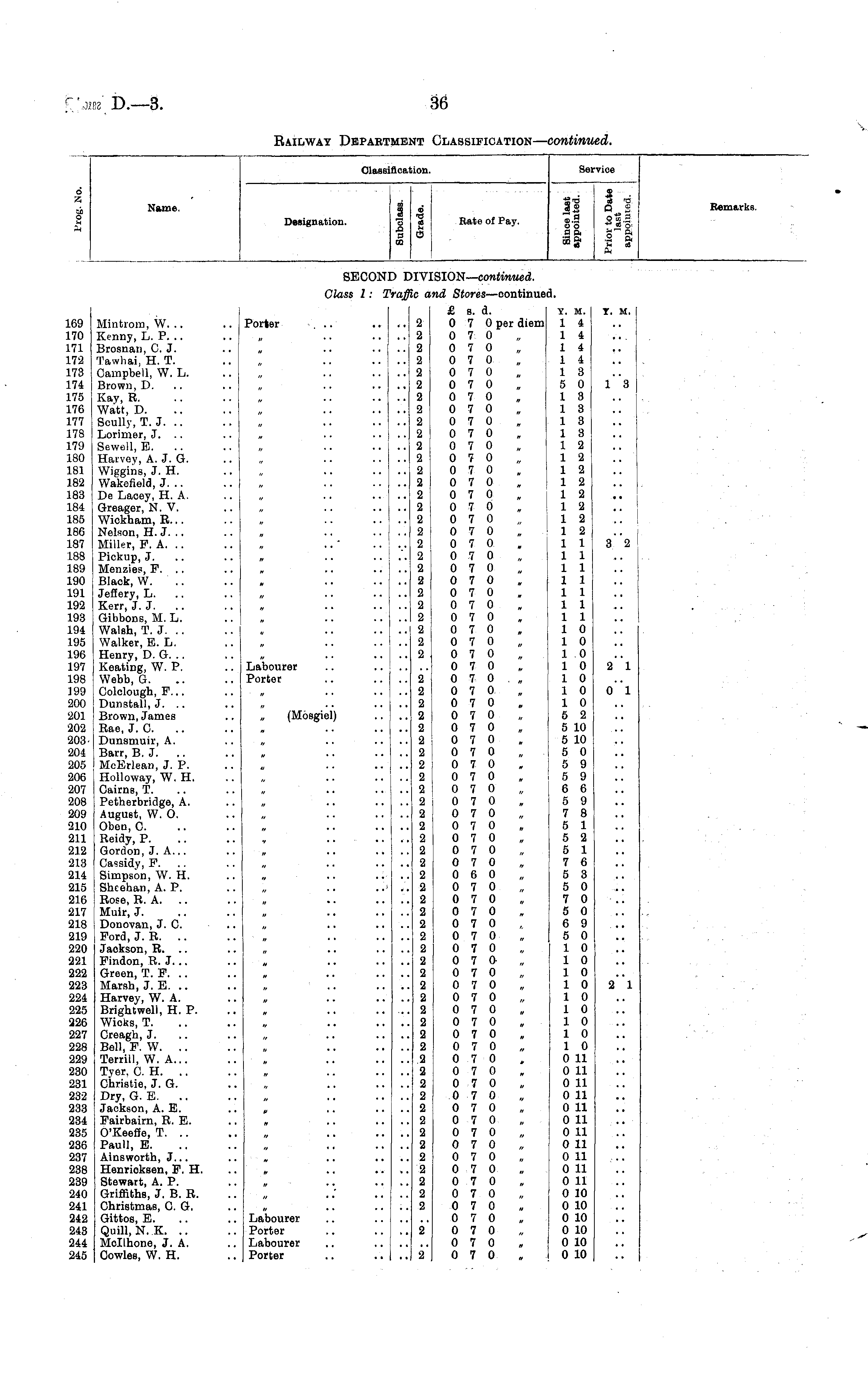 Classj ifical lion. Service 6 X Name. Designation. 1 O OD CD •e ea 53 li 33 CO .9 CO O a a ingi 9 4* ■ O DO .— Is Remarks. Rate of Pay. SECONJ HV ISION— continued. Class I: T ra) .nd Stores —continue i. 169 170 171 172 173 174 175 176 177 178 179 180 181 182 183 184 185 186 187 188 189 190 191 192 193 194 195 196 197 198 199 200 201 202 203204 205 206 207 208 209 210 211 212 213 214 215 216 217 218 219 220 221 222 223 224 225 226 227 228 229 230 231 232 233 234 235 236 237 238 239 240 241 242 243 244 245 Mintrom, W. .. Kenny, L. P. .. Brosnan, 0. J. Tawhai, H. T. Campbell, W. L. Brown, D. Kay, R. Watt, D. Scully, T. J. Lorimer, J. Sewell, E. Harvey, A. J. G. Wiggins, J. H. Wakefield, J. .. De Lacey, H. A. Greager, N. V. Wiokham, R... Nelson, H. J. .. Miller, F. A. Pickup, J. Menzies, F. .. Black, W. Jeffery, L. Kerr, J. J. Gibbons, M. L. Walsh, T. J. .. Walker, E. L. Henry, D. G. .. Keating, W. P. Webb, G. Colclough, F... Dunstall, J. .. Brown, James Rae, J. C Dunsmuir, A. Barr, B. J. McErlean, J. P. Holloway, W. H. Cairns, T. Petherbriclge, A. August, W. 0. Obeu, C. Reidy, P. Gordon, J. A... Cassidy, P. Simpson, W. H. Shcehan, A. P. Rose, R. A. Muir, J. Donovan, J. C Ford, J. R. Jackson, R. .. Findon, R. J... Green, T. F. Marsh, J. E. Harvey, W. A. Brightwell, H. P. Wicks, T. Creagh, J. Bell, F. W. Terrill, W. A... Tyer. 0. H. Christie, J. G. Dry, G. E. Jackson, A. E. Fairbairn, R. E. O'Keeffe, T. .. Paull, E. Ainsworth, J... Henrioksen, F. H. Stewart, A. P. Griffiths, J. B. R. Christmas, 0. G. Gittos, E. Quill, N. K. .. Mcllhone, J. A. Cowles, W. H. Porter ... Labourer Porter (Mosgiel) 2 2 2 2 2 2 2 2 2 2 2 2 2 2 2 2 2 2 2 2 2 2 2 3 2 2 2 2 2 2 2 2 2 2 2 2 2 2 2 2 2 2 2 2 2 2 2 2 2 2 2 2 2 2 2 2 2 2 2 2 2 2 2 2 2 2 2 2 2 2 2 2 £ s. d. 0 7 0 per diem 0 7 0 0 7 0 0 7 0 0 7 0 0 7 0 0 7 0 0 7 0 0 7 0 0 7 0 0 7 0 0 7 0 0 7 0 0 7 0 0 7 0 0 7 0 0 7 0 0 7 0 0 7 0 0 7 0 0 7 0 0 7 0 0 7 0 0 7 0 0 7 0 0 7 0 0 7 0 0 7 0 0 7 0 0 7 0 . „ 0 7 0 0 7 0 0 7 0 0 7 0 0 7 0 0 7 0 0 7 0 0 7 0 0 7 0 0 7 0 0 7 0 0 7 0 0 7 0 0 7 0 0 7 0 0 6 0 0 7 0 0 7 0 0 7 0 0 7 0 0 7 0 0 7 0 0 7 0 0 7 0 0 7 0 0 7 0 0 7 0 0 7 0 0 7 0 0 7 0 0 7 0 0 7 0 0 7 0 0 7 0 0 7 0 0 7 0 0 7 0 0 7 0 0 7 0 0 7 0 0 7 0 0 7 0 0 7 0 0 7 0 0 7 0 0 7 0 0 7 0 Y. M. 1 4 1 4 1 4 1 4 1 3 5 0 1 3 1 3 1 3 1 3 1 2 1 2 1 2 1 2 1 2 1 2 1 2 1 2 1 1 1 1 1 1 1 1 1 1 1 1 1 1 1 0 1 0 1 0 1 0 1 0 1 0 1 0 5 2 5 10 5 10 5 0 5 9 5 9 6 6 5 9 7 8 5 1 5 2 5 1 7 6 5 3 5 0 7 0 5 0 6 9 5 0 1 0 1 0 1 0 1 0 1 0 1 0 1 0 1 0 1 0 0 11 0 11 0 11 0 11 0 11 0 11 0 11 0 11 0 11 0 11 0 11 0 10 0 10 0 10 0 10 0 10 0 10 Y. M. l"'3 3 - 2 2 1 0 1 ' 2"l a <. • • Labourer Porter Labourer Porter 2 2
