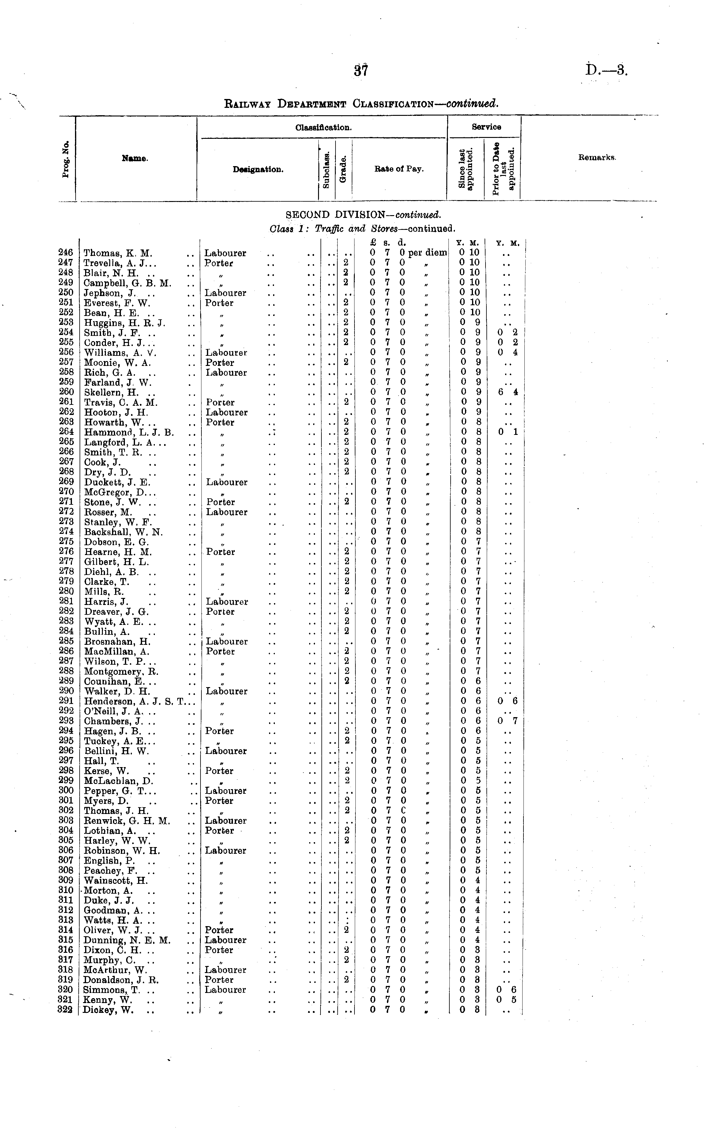 Classificai iion. Service 6 X ab o -, a Name. Designation. CO 8 CO -° 1 3 oa CD iq 1 53 Rate of Pay. CD ■S-3 lis fi 82 Q 2 la sla CO O . <= O b a g -a i i a Remarks SECGt 3IV 1SI0N— continued. Class 1: '. \C W, nd Stores —continuei 246 247 248 249 250 251 252 253 254 255 256 257 258 259 260 261 262 263 264 265 266 267 268 269 270 271 272 273 274 275 276 277 278 279 280 281 282 283 284 285 286 287 288 289 290 291 292 293 294 295 296 297 298 299 300 301 302 303 304 305 306 307 308 309 310 311 312 313 314 315 316 317 318 319 320 321 322 Thomas, K, M. Trevella, A. J... Blair, N. H. .. Campbell, G. B. M. .. Jephson, J. Everest, F. W. Bean, H. E. .. Huggins, H. R. 3. Smith, J. F. .. Conder, H. J. .. Williams, A. V. Moonie, W. A. Rich, G. A. .. Farland, J W. Skellern, H. .. Travis, C. A. M. Hooton, J. H. Howarth, W. .. Hammond, L. J, B. Langford, L. A. .. Smith, T. R. .. Cook, J. Dry, J. D. Duckett, J. E. McGregor, D... Stone, J. W. .. Rosser, M. Stanley, W. P. Backshall, W. N. Dobson, E. G. Hearne, H. M. Gilbert, H. L. Diehl, A. B. .. Clarke, T. Mills, R. Harris, J. Dreaver, J. G. Wyatt, A. E. .. Bullin, A. Brosnahan, H. MacMillan, A. Wilson, T. P. .. Montgomery, R. Counihan, E. .. Walker, D. H. Henderson, A. J. S. T... O'Neill, J. A. .. Chambers, J. .. Hagen, J. B. .. Tuekey, A. E... Bellini, H. W. Hall, T. I Kerse, W. i McLacblan, D. ; Pepper, G. T... | Myers, D. j Thomas, J. H. ! Renwick, G. H. M. Lothian, A. Harley, W. W. Robinson, W. H. English, P. .. Peachey, P. .. Wainscott, H. Morton, A. Duke, J. J. .. Goodman, A. .. Watts. H. A. .. Oliver, W. J. .. Dunning, N. E. M. Dixon, 0. H. .. Murphy, C. .. McArthur, W. Donaldson, J. R. Simmons, T. .. Kenny, W. Diokey, W. .. Labourer Porter Labourer Porter Labourer Porter Labourer Porter Labourer Porter Labourer Porter Labourer Porter Labourer Porter 2 2 2 2 2 2 2 2 2 2 2 2 2 2 2 2 2 2 2 2 2 2 2 2 2 £ s. d. 0 7 0 per diem 0 7 0 0 7 0 0 7 0 0 7 0 0 7 0 0 7 0 0 7 0 0 7 0 0 7 0 0 7 0 0 7 0 0 7 0 0 7 0 0 7 0 0 7 0 0 7 0 0 7 0 0 7 0 0 7 0 0 7 0 0 7 0 0 7 0 0 7 0 0 7 0 0 7 0 0 7 0 0 7 0 0 7 0 0 7 0 0 7 0 0 7 0 0 7 0 0 7 0 0 7 0 0 7 0 0 7 0 0 7 0 0 7 0 0 7 0 0 7 0 0 7 0 0 7 0 0 7 0 0 7 0 0 7 0 0 7 0 0 7 0 0 7 0 0 7 0 0 7 0 0 7 0 0 7 0 0 7 0 0 7 0 0 7 0 0 7 C 0 7 0 0 7 0 0 7 0 0 7 0 0 7 0 0 7 0 0 7 0 0 7 0 0 7 0 0 7 0 0 7 0 0 7 0 0 7 0 0 7 0 0 7 0 0 7 0 0 7 0 0 7 0 0 7 0 0 7 0 Y. M. 0 10 0 10 0 10 0 10 0 10 0 10 0 10 0 9 0 9 0 9 0 9 0 9 0 9 0 9 0 9 0 9 0 9 0 8 0 8 0 8 0 8 0 8 0 8 0 8 0 8 0 8 0 8 0 8 0 8 0 7 0 7 0 7 0 7 0 7 0 7 0 7 0 7 0 7 0 7 0 7 0 7 0 7 0 7 0 6 0 6 0 6 0 G 0 6 0 6 0 5 0 5 0 5 0 5 0 5 0 5 0 5 0 5 0 5 0 5 0 5 0 5 0 5 0 5 0 4 0 4 0 4 0 4 0 4 0 4 0 4 0 3 0 3 0 3 0 3 0 3 0 3 0 8 Y. M. 0 2 0 2 0 4 6 4 0 1 Labourer Porter 2 2 2 2 Labourer 0 6 0 7 Porter 2 2 Labourer Porter 2 2 Labourer Porter 2 2 Labourer Porter 2 2 Labourer Porter Labourer Porter Labourer Porter Labourer 2 2 2 3 0 6 0 5
