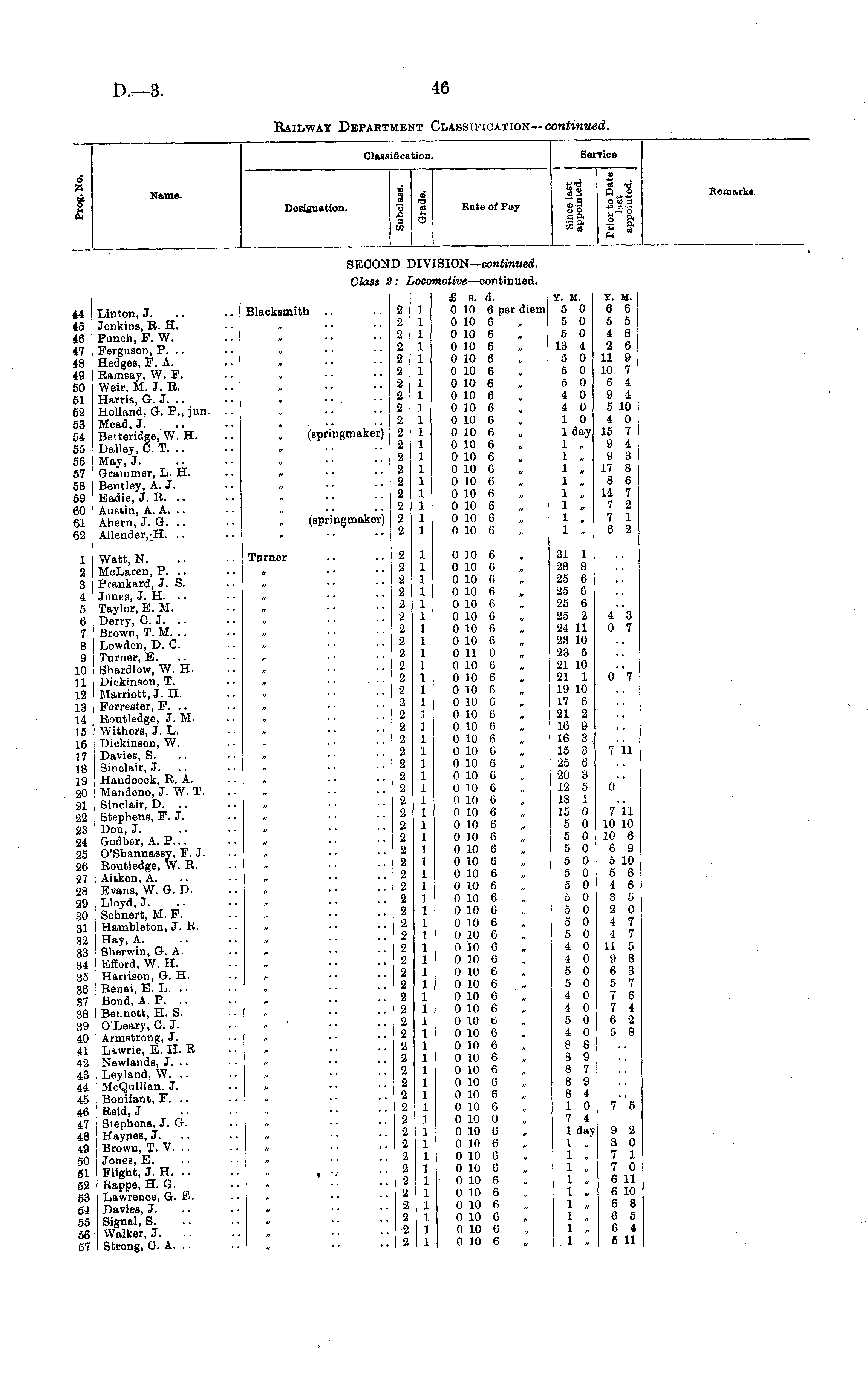 Clas: lification. Service 6 feci o !H a Name. I 0 53 Rate of Pay. co "f tr\ (fl rrj 5 co Q co cd.9 SS-2 a Remarks. Designation. SECON D )IV '. SION— continued. Class 2 ?: ,oco: notive —continued. 44 45 46 47 48 49 50 51 52 53 54 55 56 57 58 59 60 61 62 Linton, J. Jenkins, R. H. Punch, F. W. Ferguson,P. .. Hedges, F. A. Ramsay, W. F. Weir, M. J. R. Harris, G. J. Holland, G. P., jun. Mead, J. .. Betteridge, W. H. Dalley, 0. T. .. May, J. Grammer, L. H. Bentley, A. J. Eadie, J. R. .. Austin, A. A. Ahern, J. G. .. Allender,;H. .. Blacksmith 2 2 2 2 2 2 2 2 2 2 2 2 2 2 2 2 2 2 2 1 1 1 1 1 1 1 1 1 1 1 1 1 1 1 1 1 1 1 £ s. d. 0 10 6 per diem 0 10 6 0 10 6 0 10 6 0 10 6 0 10 6 0 10 6 0 10 6 0 10 6 0 10 6 0 10 6 0 10 6 0 10 6 0 10 6 0 10 6 0 10 6 0 10 6 0 10 6 0 10 6 Y. M. I 5 0 5 0 5 0 13 4 5 0 5 0 5 0 4 0 4 0 1 0 1 day Y. M. 6 6 5 5 4 8 2 6 11 9 10 7 6 4 9 4 5 10 4 0 15 7 9 4 9 3 17 8 8 6 14 7 7 2 7 1 6 2 (springmaker) (springmaker) 1 2 3 4 5 6 7 8 9 10 11 12 13 14 15 16 17 18 19 20 21 22 23 24 25 26 27 28 29 30 31 32 33 34 35 36 37 38 39 40 41 42 43 44 45 46 47 48 49 50 51 52 53 54 55 56 57 Watt, N. McLaren, P. .. Prankard, J. S. Jones, J. H. Taylor, E. M. Derry, C.J. Brown, T. M. .. Lowden, D. C. Turner, E. Shardlow, W. H. Dickinson, T. Marriott, J. H. Forrester, F. .. Routledge, J, M. Withers, J. L. DickinBon, W. Davies, S. Sinclair, J. Handcock, R. A. Mandeno, J. W. T. Sinclair, D. .. Stephens, F. J. Don, J. Godber, A. P... O'Shannassy, P. J. Routledge, W. R. Aitken, A. Evans, W. G. D. Lloyd, J. Sehnert, M. F. Hambleton, J. R. Hay, A. Sherwin, G. A. Efiord, W. H. Harrison, G. H. Renai, E. L. .. Bond, A. P. Bennett, H. S. O'Leary, 0. JArmstrong, J. Lawrie, E. H. R. Newlands, J. .. Leyland, W. .. McQuillan, J. Bonifant, F. .. Reid, J S'ephens, J. G. ■ Haynes, J. Brown, T. V. Jones, E. | Flight, J. H. .. Rappe, H. G. I Lawrence, G. E. Davies, J. Signal, S. Walker, J. I Strong, CA. .. Turner 2 2 2 2 2 2 2 2 2 2 2 2 2 2 2 2 2 2 2 2 2 2 2 2 2 2 2 2 2 2 2 2 2 2 2 2 2 2 2 2 2 2 2 2 2 2 2 2 2 2 2 2 2 2 2 2 2 1 1 1 1 1 1 1 1 1 1 1 1 1 1 1 1 1 1 1 1 1 1 1 1 1 I 1 1 1 1 1 1 1 1 1 1 1 1 1 1 1 1 1 1 1 1 1 1 1 1 1 1 1 1 1 1 1 0 10 6 0 10 6 0 10 6 0 10 6 0 10 6 0 10 6 0 10 6 0 10 6 0 11 0 0 10 6 0 10 6 0 10 6 0 10 6 0 10 6 0 10 6 0 10 6 0 10 6 0 10 6 0 10 6 0 10 6 0 10 G 0 10 6 0 10 6 0 10 6 0 10 G 0 10 6 0 10 6 0 10 6 0 10 6 0 10 6 0 10 6 0 10 0 0 10 6 0 10 6 0 10 6 0 10 6 0 10 6 0 10 6 0 10 0 0 10 6 0 10 6 0 10 6 0 10 6 0 10 6 0 10 6 0 10 6 0 10 0 0 10 6 0 10 6 0 10 6 0 10 6 0 10 6 0 10 6 0 10 6 0 10 6 0 10 6 0 10 6 31 1 28 8 25 6 25 6 25 6 25 2 24 11 23 10 23 5 21 10 21 1 19 10 17 6 21 2 16 9 16 3 15 3 25 6 20 3 12 5 18 1 15 0 5 0 5 0 5 0 5 0 5 0 5 0 5 0 5 0 5 0 5 0 4 0 4 0 5 0 5 0 4 0 4 0 5 0 4 0 8 8 8 9 8 7 8 9 8 4 1 0 7 4 1 day 4 3 0 7 0"7 711 o" 7 11 10 10 10 6 6 9 5 10 5 6 4 6 3 5 2 0 4 7 4 7 11 5 9 8 6 3 5 7 7 6 7 4 6 2 5 8 7"5 " • - .- 9 2 8 0 7 1 7 0 6 11 6 10 6 8 6 5 6 4 5 11