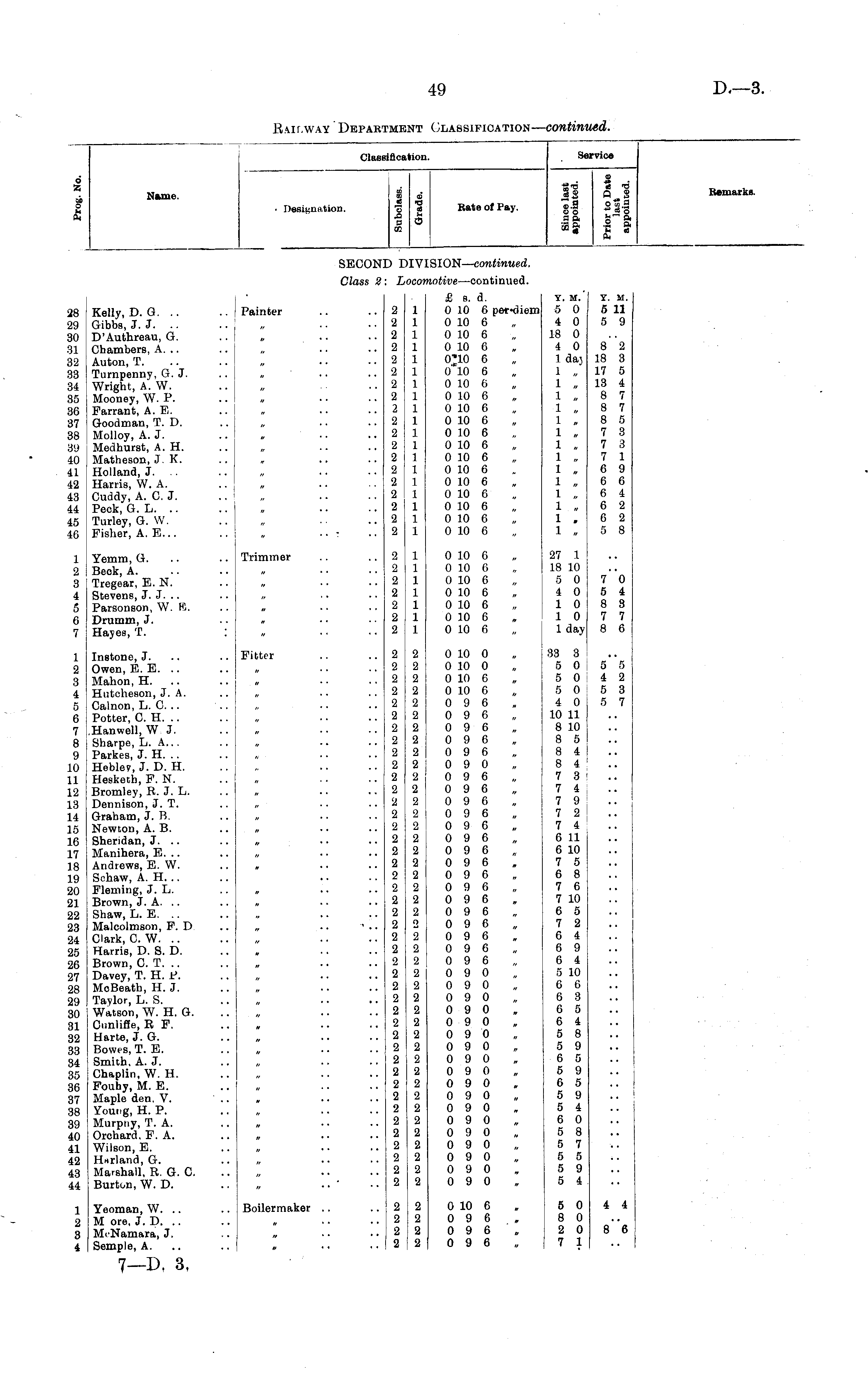 ClaBi ifloal lion. Service 6 z Name. ■ Designation. 1 I 1 Bate of Pay. 9 32 Q 2 ••9 SS-9 o o ™ o it j_^ BemarkB. secon: d: IV SION — continued. Class 2 ICOl totive —continued. 28 29 80 31 32 88 34 Be 86 37 88 89 40 41 42 43 44 45 46 Kelly, D. G. .. Gibbs, J. J. .. D'Authreau, G. Chambers, A. .. Auton, T. Turnpenny, G. J. Wright, A. W. Mooney, W. P. Farrant, A. E. Goodman, T. D. Molloy, A. J. Medhurst, A. H. Matheson, J. K. Holland, J. .. Harris, W. A. Cuddy, A. C. J. Peck, G. L. Turley, G. W. Fisher, A. E... Painter 2 2 2 2 2 2 2 2 2 2 2 2 2 2 2 2 2 2 2 1 1 1 1 1 1 1 1 1 1 1 1 1 1 1 1 1 1 1 £ s. d. 0 10 6 per-diem 0 10 6 0 10 6 0 10 6 0'10 6 0 10 6 0 10 G 0 10 6 0 10 6 0 10 6 0 10 6 0 10 6 0 10 6 0 10 6 0 10 6 0 10 6 0 10 6 0 10 6 0 10 6 Y. M. 5 0 4 0 18 0 4 0 1 da} 1 „ 1 1 . 1 ,, 1 . 1 1 1 "„ 1 „ 1 1 1 . 1 . 1 , Y. M. 5 11 5 9 8 2 18 3 17 5 13 4 8 7 8 7 8 5 7 3 7 3 7 1 6 9 6 6 6 4 6 2 6 2 5 8 // • • 1 2 3 4 5 (J 7 Yemm, G. Beck, A. Tregear, E. N. Stevens, J. J. .. Parsonson, W. B. Drumm, J. Hayes, T. Trimmer « • ■ 2 2 2 2 2 2 2 1 1 1 1 1 1 1 0 10 6 0 10 6 0 10 6 0 10 6 0 10 6 0 10 6 0 10 6 27 1 18 10 5 0 4 0 1 0 1 0 1 day 7 0 5 4 8 3 7 7 8 6 a • • it • * 1 2 3 4 5 6 7 8 9 10 II 12 18 14 Iβ 16 L7 18 19 20 21 22 23 24 25 26 •21 28 29 80 31 32 88 34 35 30 37 38 89 40 41 42 43 44 Instone, J. Owen, E. E. .. Mahon, H. Hutcheson, J. A. Calnon, L. G. .. Potter, C. H. .. .Hanwell, W J. Sharpe, L. A... Parkes, J. H. .. Heblep, J. D. H. Hesketh, F. N. Bromley, B. J. L. Dennison, J. T. Graham, J. B. Newton, A. B. Sheridan, J. .. Manihera, E. .. Andrews, E. W. Schaw, A. H. .. Fleming, J. L. Brown, J. A. Shaw, L. E. Malcolmson, F. D Clark, C. W. Harris, D. S. D. Brown, C. T. .. Davey, T. H. P. ! MoBeath, H. J. I Taylor, L. S. Watson, W. H. G. Ciinliffe, E F. Harte, J. G. Bowes, T. E. Smith. A. J. Chaplin, W. H. Fouhy, M. E. Maple den. V. Young, H. P. Mtirpny, T. A. Orchard. F. A. Wilson, E. H«rland, G. Marshall, R. G. C. Burton, W. D. Fitter 2 2 2 2 2 2 2 2 2 2 2 2 2 2 2 2 2 2 2 2 2 2 2 2 2 2 2 2 2 2 2 2 2 2 2 2 2 2 2 2 2 2 2 2 2 2 2 2 2 2 2 2 2 2 2 a 2 2 •2 •2 •2 2 2 2 ■2 ■2 o 2 2 2 2 2 2 2 2 2 2 2 2 2 2 2 2 2 2 2 2 2 0 10 0 0 10 0 0 10 6 0 10 6 0 9 6 0 9 6 0 9 6 0 9 6 0 9 6 0 9 0 0 9 6 0 9 6 0 9 6 0 9 6 0 9 6 0 9 6 0 9 6 0 9 6 0 9 6 0 9 6 0 9 6 0 9 6 0 9 6 0 9 6 0 9 6 0 9 6 0 9 0 0 9 0 0 9 0 0 9 0 0 9 0 0 9 0 0 9 0 0 9 0 0 9 0 0 9 0 0 9 0 0 9 0 0 9 0 0 9 0 0 9 0 0 9 0 0 9 0 0 9 0 33 3 5 0 5 0 5 0 4 0 10 11 8 10 8 5 8 4 8 4 7 3 7 4 7 9 7 2 7 4 6 11 6 10 7 5 6 8 7 6 7 10 6 5 7 2 6 4 6 9 6 4 5 10 6 6 6 3 6 5 6 4 5 8 5 9 6 5 5 9 6 5 5 9 5 4 6 0 5 8 5 7 5 5 5 9 5 4 5 5 4 2 5 3 5 7 » • • » '' a '' H ' • 1 2 8 4 Yeoman, W. .. M ore, J. D. .. MiNamara, J. Semple, A. Boilermaker .. 2 2 2 2 2 2 2 2 0 10 6 0 9 6 0 9 6, 0 9 6 5 0 8 0 2 0 7 1 4 4 8"6