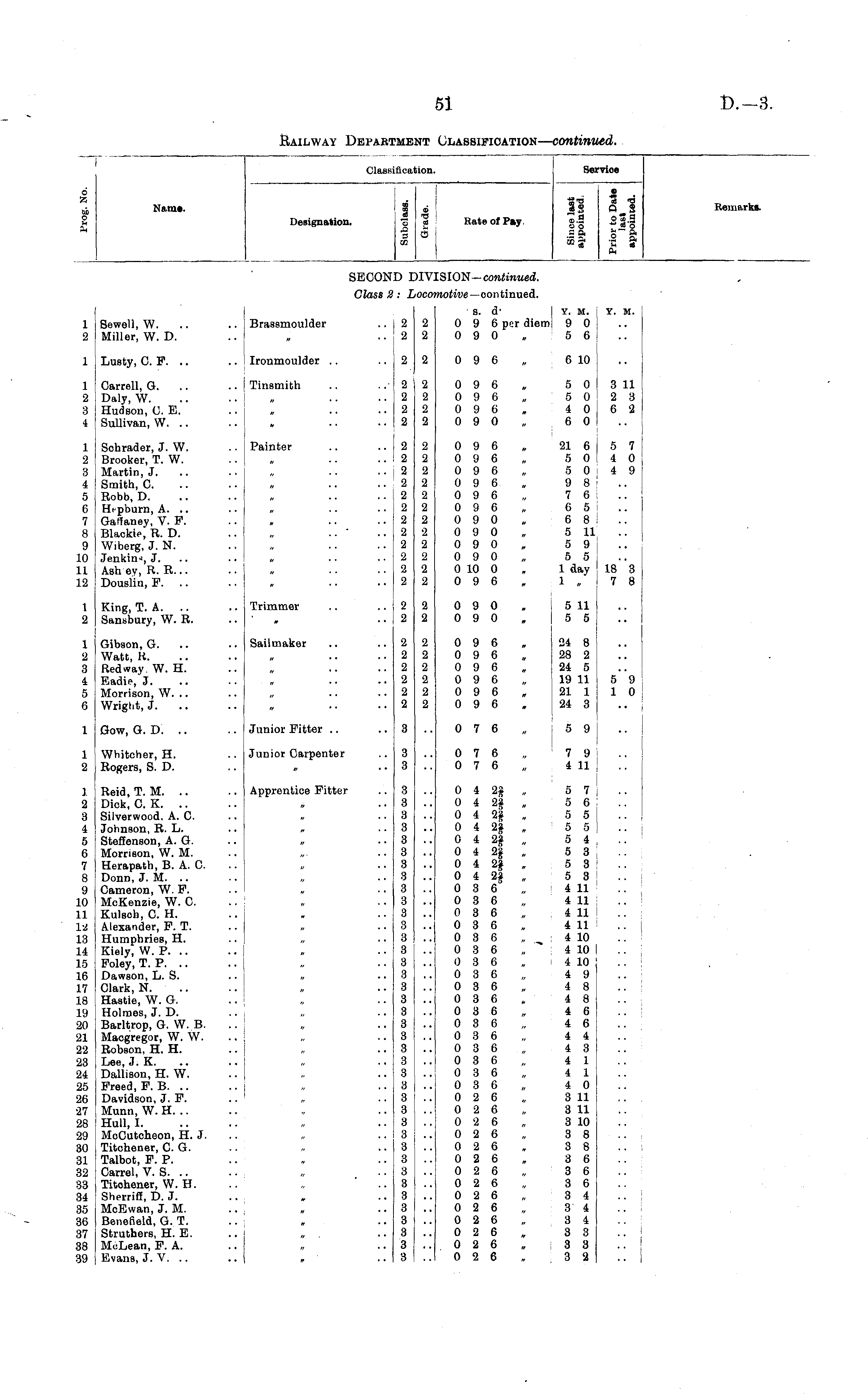 Classificai jion. Service 6 X 5 £ Name. Designation. J *3 — 3 X CD ! ■3 ea 55 i Rate of Pay 9 J® Q 2 Ph Remarks. SECOND [SION— continued. Class 2 : j notive —continued. 1 2 Sewell, W. Miller, W. D. Brassmoulder .. 2 .. 2 2 2 s. d- j Y. M. 0 9 6 per diem< 9 0 0 9 0 „ 5 6 Y. M. 1 Lusty, 0. F. Ironmoulder .. .. 2 2 0 9 6 „ 6 10 1 2 3 4 Carrell, G. Daly, W. Hudson, C E. Sullivan, W. .. Tinsmith ..- 2 .. 2 .. 2 .. 2 2 2 2 2 0 9 6 . 5 0 0 9 6 „ 5 0 0 9 6 . 4 0 0 9 0 „ 6 0 3 11 2 3 6 3 1 2 3 4 5 6 7 8 9 to 11 12 Schrader, J. W. Brooker, T. W. Martin, J. Smith, 0. Robb, D. Hepburn, A. .. Gatfaney, V. F. Blackie, R. D. Wiberg, J. N. Jenkino, J. Ash ey, R. R... Douslin, F. .. Painter .. 2 .. 2 • i 2 .. 2 .. 2 .. 2 .. 3 .. 2 .. 3 .. 2 .. 2 .. 2 2 2 2 2 2 2 2 2 2 2 2 2 0 9 6 „ 21 6 0 9 6 , 5 0 0 9 6 „ 5 0 0 9 6 . 9 8 0 9 6 „ 7 6 0 9 6 „ 6 5 0 9 0 „ 6 8 0 9 0 „ 5 11 0 9 0 „ 5 9 0 9 0 „ 5 5 0 10 0 , 1 day 0 9 6 „ 1 „ 5 7 4 0 4 9 18 3 7 8 1 2 King, T. A. Sansbury, W. R. Trimmer .. 2 .. 2 2 2 0 9 0 , 5 11 0 9 0 , ,55 1 2 3 4 5 6 Gibson, G. Watt, R. Red way. W. H. Eadie, J. Morrison, W. .. Wright, J. Sailmaker .. 2 .. 2 .. 2 .. 2 .. 2 .. 2 2 2 2 2 2 2 0 9 6 „ 24 8 0 9 6 , j 28 2 0 9 6 „ i 24 5 0 9 6 , i 19 11 0 9 6 , 21 1 0 9 6 . 24 3 5"9 1 0 1 Gow, G. D. Junior Fitter .. .. 3 0 7 6 „ 5 9 1 2 Whitcner, H. Rogers, S. D. Junior Carpenter .. 3 .. 3 0 7 6 „ 7 9 0 7 6 , 4 11 1 2 3 4 5 6 7 8 9 10 11 12 13 14 15 1G 17 18 19 20 21 22 23 24 25 2G 27 28 29 30 31 32 33 34 35 3G 37 38 39 Reid.T. M. .. Dick, 0. K. .. Silverwood. A. C Johnson, R. L. Steffenson, A. G. Morrison, W. M. Herapath, B. A. C Donn, J. M. Cameron, W. F. McKenzie, W. 0. Kulsoh, 0. H. Alexander, F. T. Humphries, H. Kiely, W. P. .. Foley, T. P. Dawson, L. S. Clark, N. Hastie, W. G. Holmes, J. D. Barltrop, G. W. B. Macgregor, W. W. Robson, H. H. Lee, J. K. Dallison, H. W. Freed, F. B. Davidson, J. F. Munn, W. H. .. Hull, I. MoCutcheon, H. J. Titchener, C G. Talbot, P. P. Carrel, V. S. Titchener, W. H. Sherriff, D. J. McEwan, J. M. Benefield, G. T. Struthers, H. E. McLean, F. A. Evans, J. V. •• Apprentice Fitter .. 3 .. 3 .. 3 .. 3 .. 3 .. 3 .. 3 .. 3 .. 3 .. 3 .. 3 .. 3 .. 3 .. 3 .. 3 .. 3 .. 3 .. 3 .. 3 .. 3 .. 3 .. 3 .. 3 .. 3 .. 3 .. 3 .. 3 .. 3 .. 3 .. 3 .. 3 .. 3 .. 3 .. 3 .. 3 .. 3 .. 3 .. 3 .. 3 0 4 2£ „ 5 7 0 4 2f , 5 6 0 4 2ji „ 5 5 0 4 2§ „ 5 5 0 4 2f „ 5 4 0 4 2§ „ 5 3 0 4 2§ „ 5 3 0 4 2§ „ 5 3 0 3 6 „ 4 11 0 3 6 „ 4 11 0 3 6 „ 4 11 0 3 6 , 4 11 0 3 6 „ 4 10 0 3 6 4 10 I 0 3 6 . 4 10 0 3 6 „ 4 9 0 3 6 „ 4 8 0 3 6 , 4 8 0 3 6 „ 4 6 0 3 6 „ 4 6 0 3 6 „ 4 4 0 3 6 „ 4 3 0 3 6 „ 4 1 0 3 6 „ 4 1 0 3 6 „ 4 0 0 2 6 „ 3 11 0 2 6 „ 3 11 0 2 6 „ 3 10 0 2 6 „ 3 8 0 2 6 . 3 8 0 2 6 0 3 6 0 2 6 „ 3 6 0 2 6 „ 3 6 0 2 6 „ 3 4 0 2 6 „ 3 4 0 2 6 „ 3 4 0 2 6 „ 3 3 0 2 6 „ 3 3 0 2 6 . 3 2