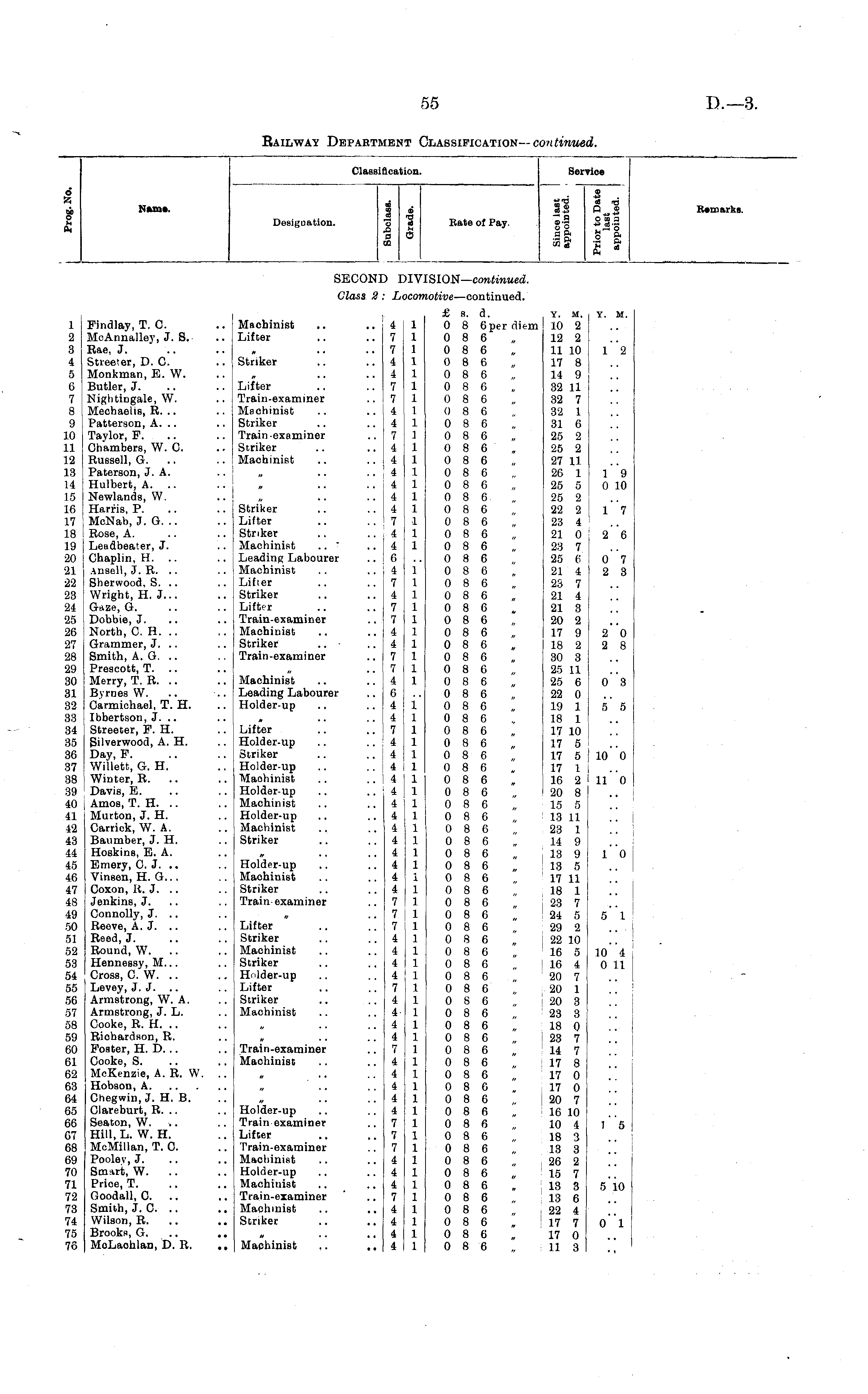 Clasi ii] Ication. Service d X oi o £ Name. CD •3 cd r, 53 ao Jo's S "d 3% Q ~- !& .2 a £ * Remarkt Designation. Rate of Pay. SECON 'IV [SION — continued. Class 2 icor, '.otive —continued. 1 2 3 4 5 6 7 8 9 10 11 12 18 14 1.5 16 17 18 19 20 21 22 23 24 28 26 27 28 29 30 31 82 33 34 35 3G 37 38 39 40 41 42 48 44 45 46 47 48 49 50 51 52 53 54 55 56 57 58 69 GO 61 02 63 64 65 66 G7 68 09 70 71 72 73 74 75 7G Findlay, T. 0. McAnnalley, J. S. Rae, J. Streerer, D. C. Monkman, E. W. Butler, J. Nightingale, W. Mechaelis, R. .. Patterson, A. .. Taylor, F. Chambers, W. 0. Russell, G. Paterson, J. A. Hulbert, A. .. Newlands, W. Harris, P. McNab, J. G. .. Rose, A. Leadbeater, J. Chaplin, H. Ausell, J. R. Sherwood. S. .. Wright, H. J... Gaze, G. Dobbie, J. North, C H. .. Grammer, J. .. Smith, A. G. Prescott, T. .. Merry, T. R. Byrnes W. Carmichael, T. H. Ibbertson, J. .. Streeter, F. H. Silverwood, A. H. Day, F. Willett, G. H. Winter, R. Davis, E. Amos, T. H. Murton, J. H. Carrick, W. A. Baumber, J. H. Hoskins, E. A. Emery, C.J. .. Vinsen, H. G... Coxon, R. J. .. Jenkins, J. Connolly, J. .. Reeve, A.J. Reed, J. Round, W. .. Hennessy, M... Cross, 0. W. Levey, J. J. Armstrong, W. A. Armstrong, J. L. Cooke, R. H. Richardson, R. Foster, H. D. .. Cooke, S. McKenzie, A. R. W. Hobson, A. Chegwin, J. H. B. Clareburt, R. .. Seaton, W. Hill, L. W. H. McMillan, T. 0. Poolev, J. Smart, W. Price, T. Goodall, 0. .. Smith, J. 0. .. Wilson, R. Brooks, G. MoLaohlan, D. R. Machinist Lifter Striker Lifter Train-examiner Machinist Striker Train examiner Striker Machinist Striker Lifter Striker Machinist .. ' Leading Labourer Machinist Lifier Striker Lifter Train-examiner Machinist Striker Train-examiner Machinist Leading Labourer Holder-up Lifter Holder-up Striker Holder-up Maohinist Holder-up Machinist Holder-up Machinist Striker 4 7 7 4 4 7 7 4 4 7 4 4 4 4 4 4 7 4 4 6 4 7 4 7 7 4 4 7 7 4 6 4 4 7 4 4 4 4 4 4 4 4 4 4 4 4 4 7 7 7 4 4 4 4 7 4 4 4 4 7 4 4 4 4 4 7 7 7 4 4 4 7 4 4 4 4 £ s. d. 0 8 6 per diem 0 8 6 0 8 6 0 8 6 0 8 6 0 8 6 0 8 6 0 8 6 0 8 6 0 8 6 0 8 6 0 8 6 0 8 6 0 8 6 0 8 6 0 8 6 0 8 6 0 8 6 0 8 6 0 8 6 0 8 6 0 8 6 0 8 6 0 8 G 0 8 6 0 8 6 0 8 6 0 8 6 0 8 6 0 8 6 0 8 6 0 8 6 0 8 6 0 8 6 0 8 6 0 8 6 0 8 6 0 8 6 0 8 6 0 8 6 0 8 6 0 8 6 0 8 6 0 8 6 0 8 6 0 8 6 0 8 6 0 8 6 0 8 6 0 8 6 0 8 6 0 8 6 0 8 6 0 8 6 0 8 6 0 8 6 0 8 6 0 8 6 0 8 6 0 8 6 0 8 6 0 8 6 0 8 G 0 8 6 0 8 6 0 8 6 0 8 6 0 8 6 0 8 6 0 8 6 0 8 6 0 8 6 0 8 6 0 8 6 0 8 6 0 8 6 Y. M. 1 10 2 12 2 11 10 17 8 14 9 32 11 32 7 32 1 31 6 25 2 25 2 27 11 26 1 25 5 25 2 22 2 23 4 21 0 23 7 25 6 21 4 28 7 21 4 21 3 20 2 17 9 18 2 30 3 25 11 25 6 22 0 19 1 18 1 17 10 17 5 17 5 17 1 16 2 20 8 15 5 13 11 23 1 14 9 13 9 13 5 17 11 18 1 23 7 24 5 29 2 22 10 16 5 16 4 20 7 20 1 20 3 23 3 18 0 23 7 14 7 17 8 17 0 17 0 20 7 16 10 10 4 18 3 13 3 26 2 15 7 13 3 13 6 22 4 17 7 17 0 11 3 Y. M. 12 19 0 10 l"7 2'"6 o"7 2 3 2 - 0 2 8 0 8 5' 5 10 0 11 0 Holder-up Machinist Striker Train examiner i"o 5 1 Lifter Striker Machinist Striker Hlder-up Lifter Striker Machinist io' 4 0 1.1 Train-examiner Machinist Holder-up Train examiner Lifter Train-examiner Machinist Holder-up Machinist Train-examiner Machinist Striker 1 5 510 0 1 Machinist ,. ,,